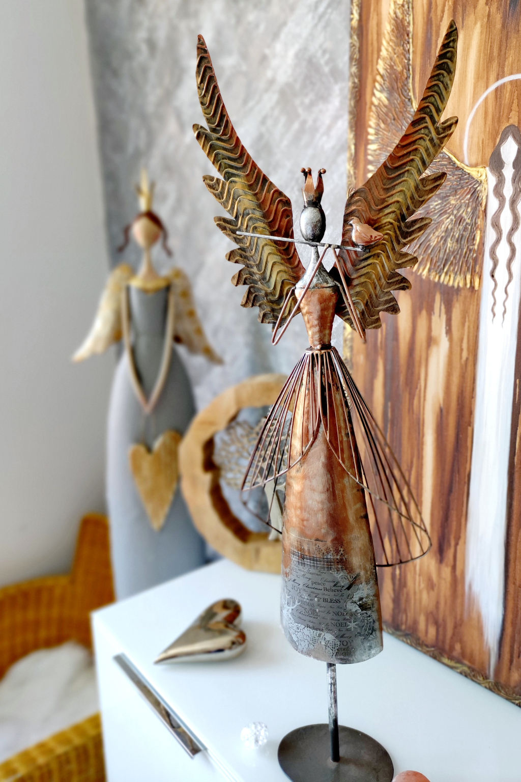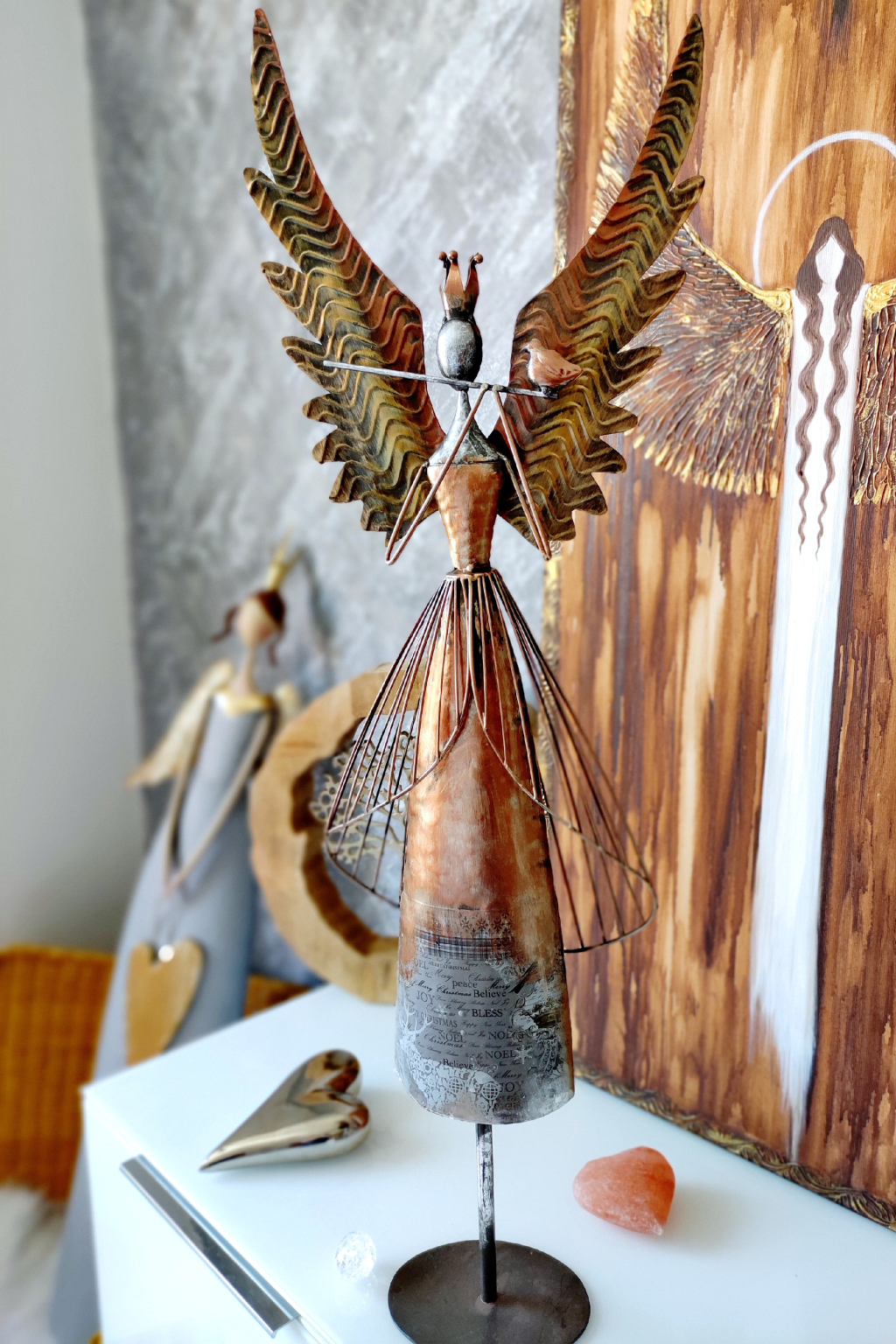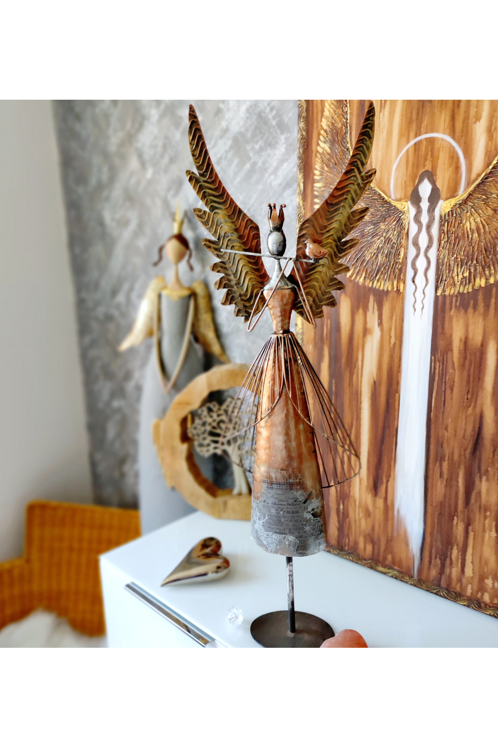 Anděl je vyveden ve vzhledu vintage/antik. Barva je bronzovo ocelová se zlatou, sem tam stříbrná. Je celokovový. Velmi stabilní při postavení.