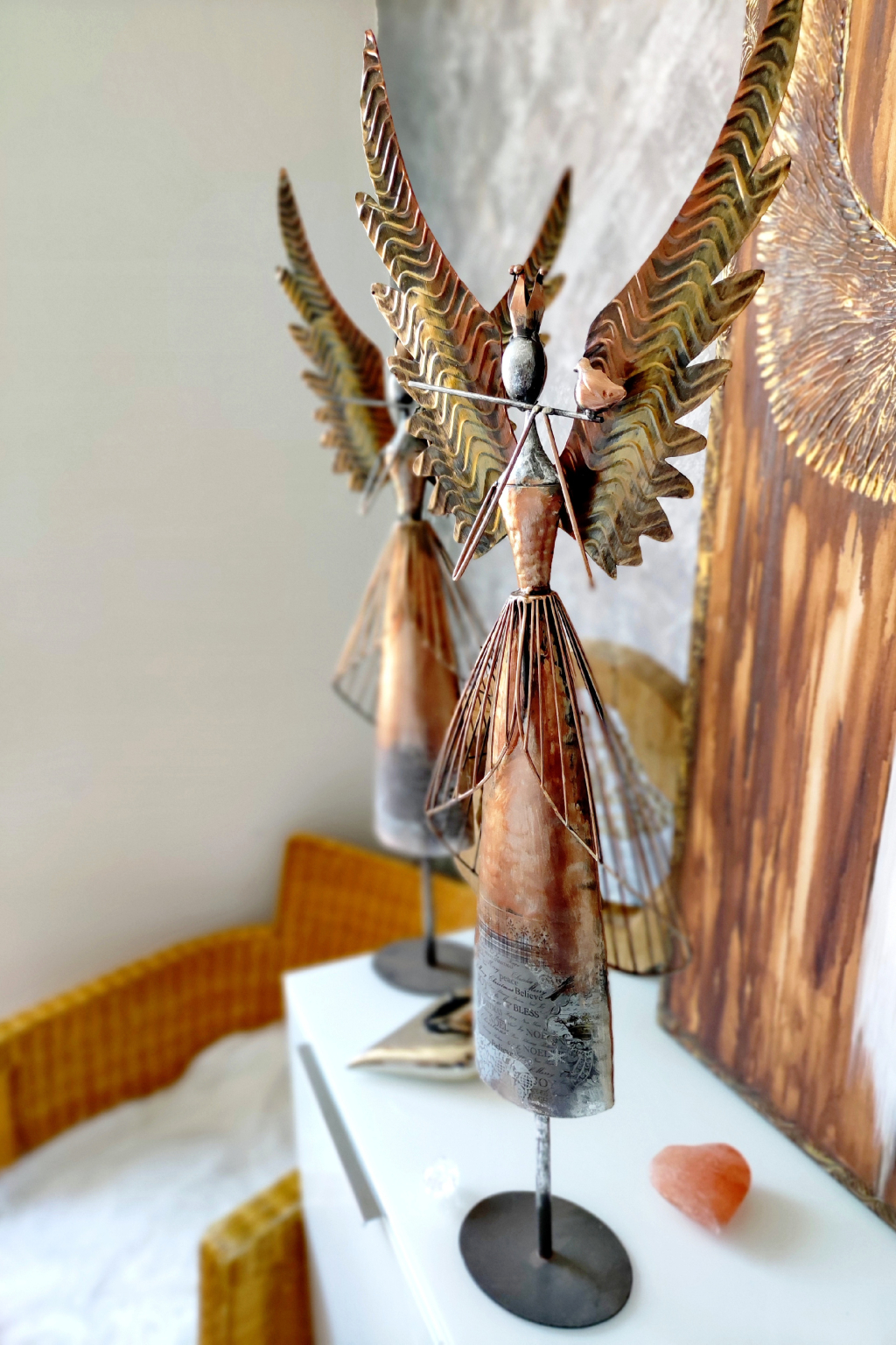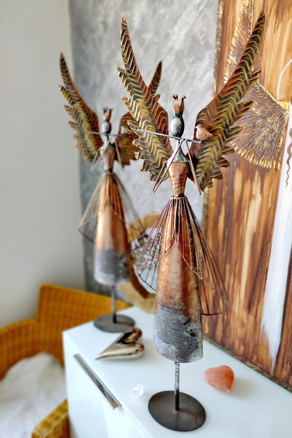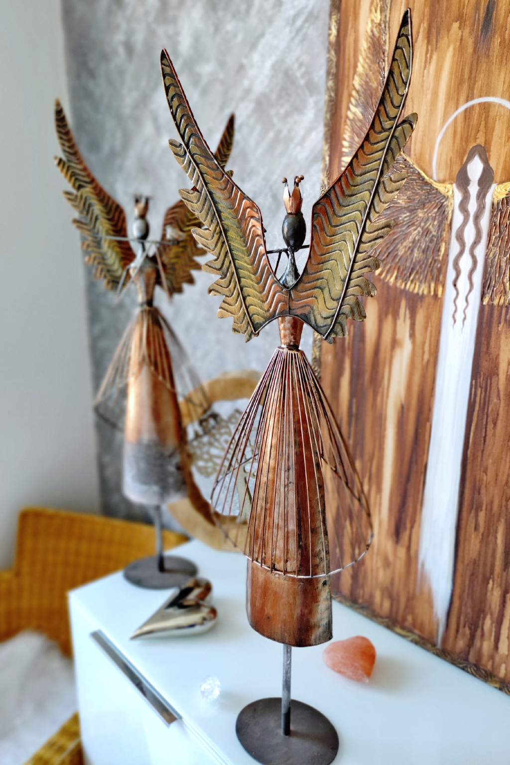 Anděl je vyveden ve vzhledu vintage/antik. Barva je bronzovo ocelová se zlatou, sem tam stříbrná. Je celokovový. Velmi stabilní při postavení.