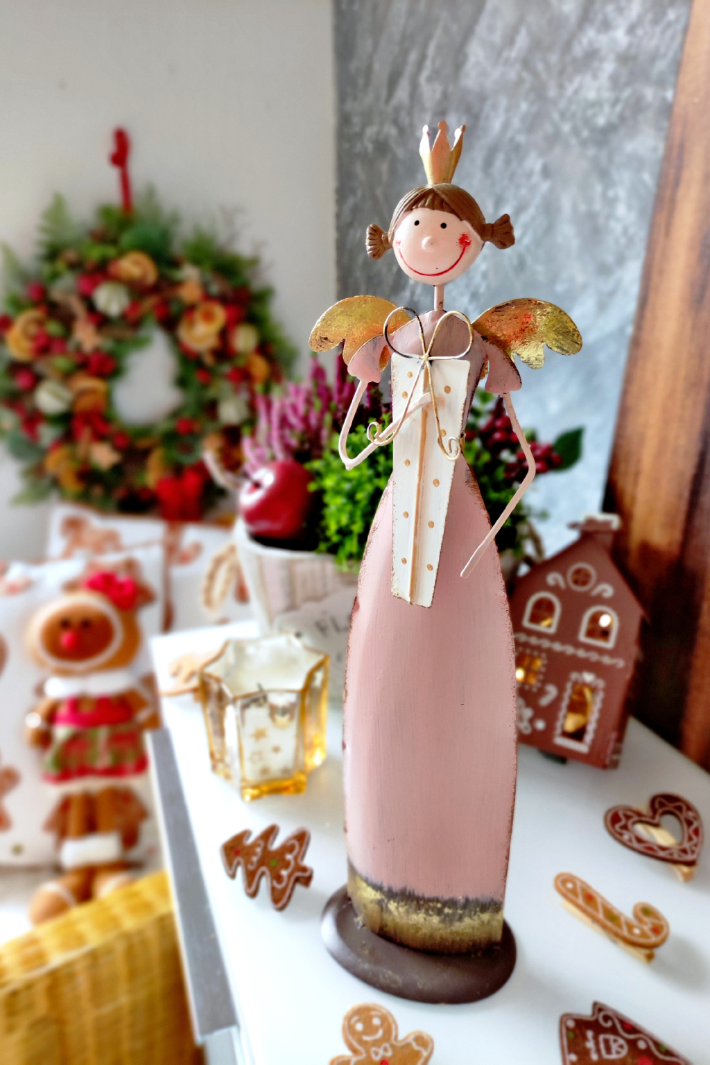 Tento kovový anděl vyzařuje jemnost, klid a zákoutí zimní pohádky. Je oblečen do pastelově růžových šatů, andílek nese dáreček. Jeho úsměv a ladné držení dlaní působí jako tichý pozdrav svátečního světla.