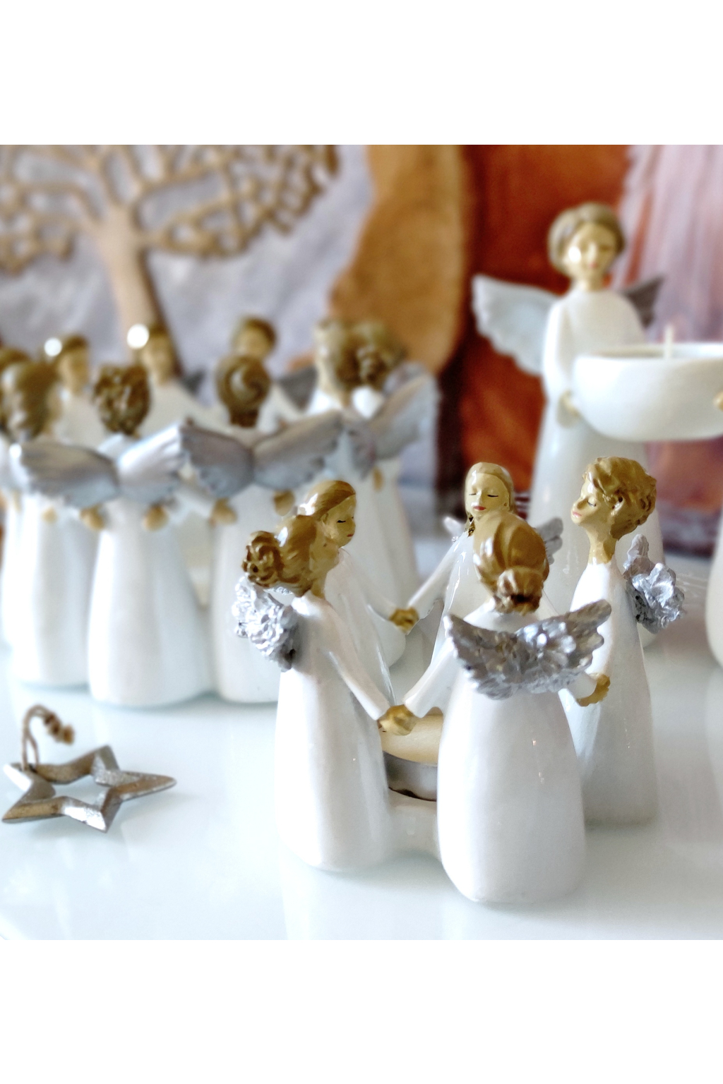 Ručně vyrobená miska/svícen/věnec krásných andělů. Tento věnec je vyrobený ve Švédsku a každý jeden z pěti andělů je úplně jiný s jiným účesem a jiným obličejem.