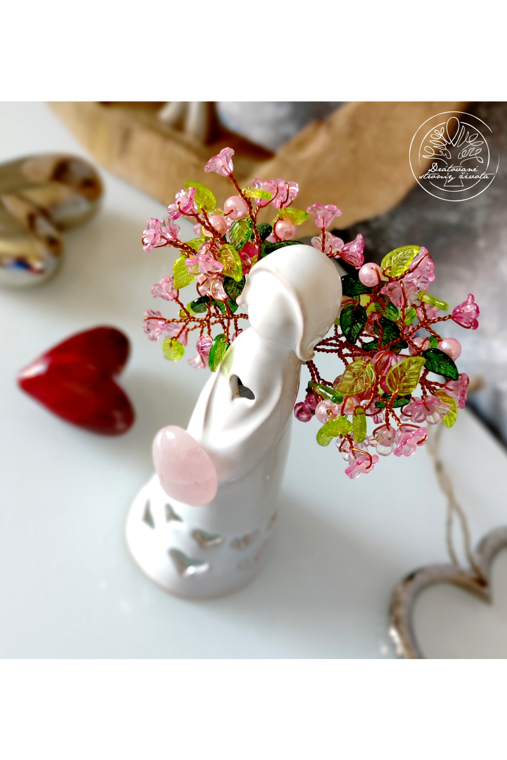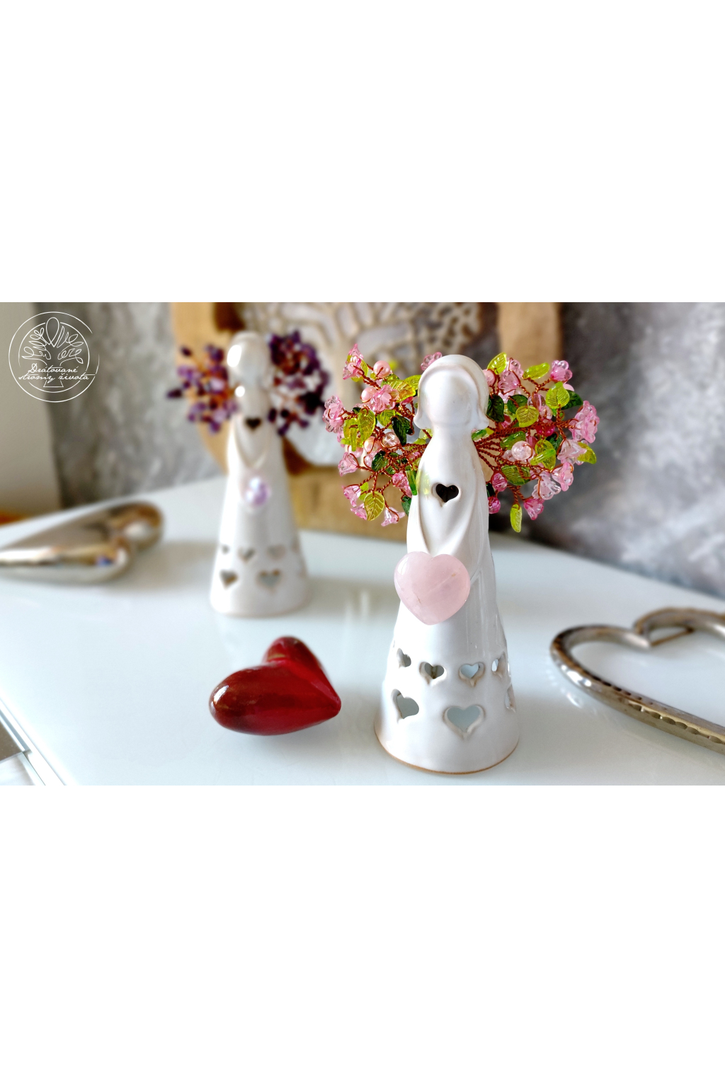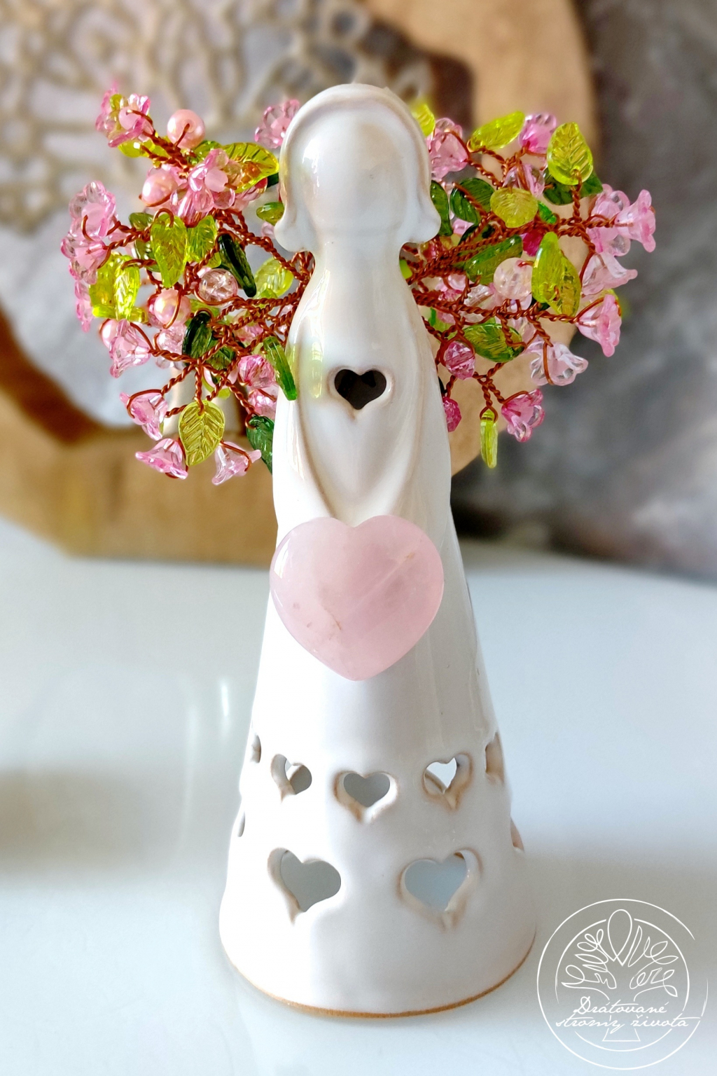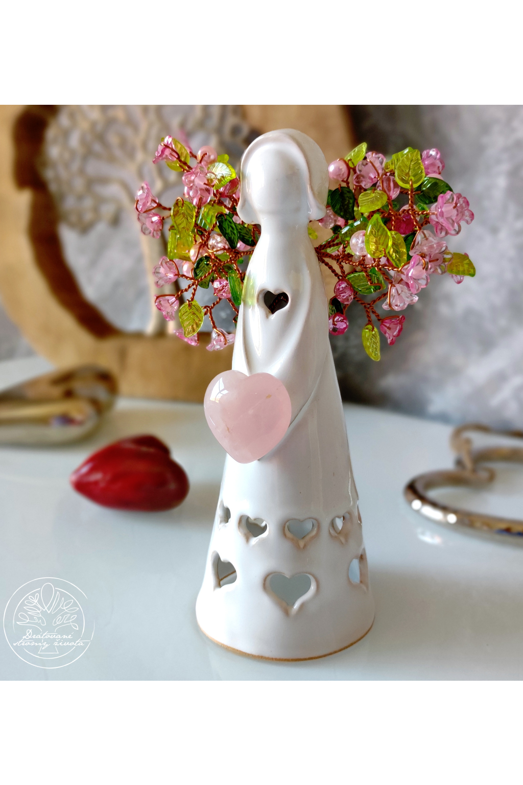Slouží také jako lucerna – v šatech má jemné průstřihy, kterými po vložení svíčky prosvítá světlo a vytváří magické ornamenty po zdech. V naší dílně jsme andílkovi přidali ručně drátovaná křídla z korálků a měděného drátu. V rukou anděl drží polodrahokam, který umocňuje jeho duchovní poselství. Tento anděl je dokonalou dekorací pro klidný a harmonický domov.