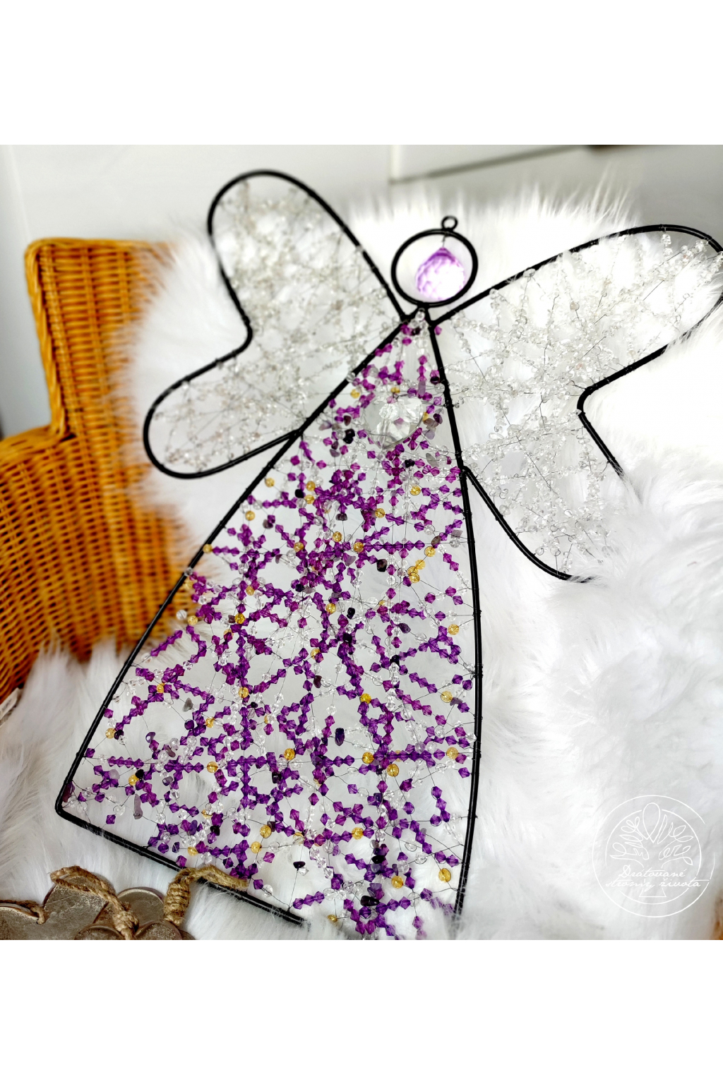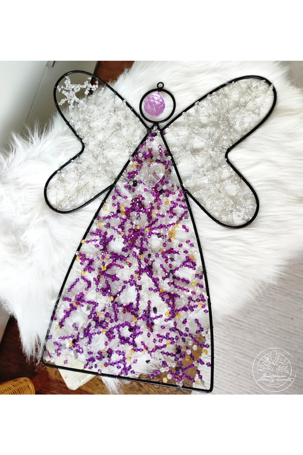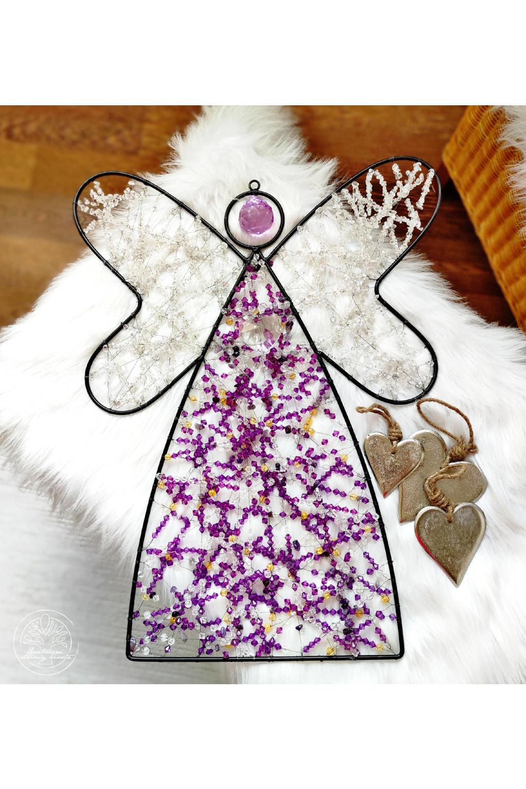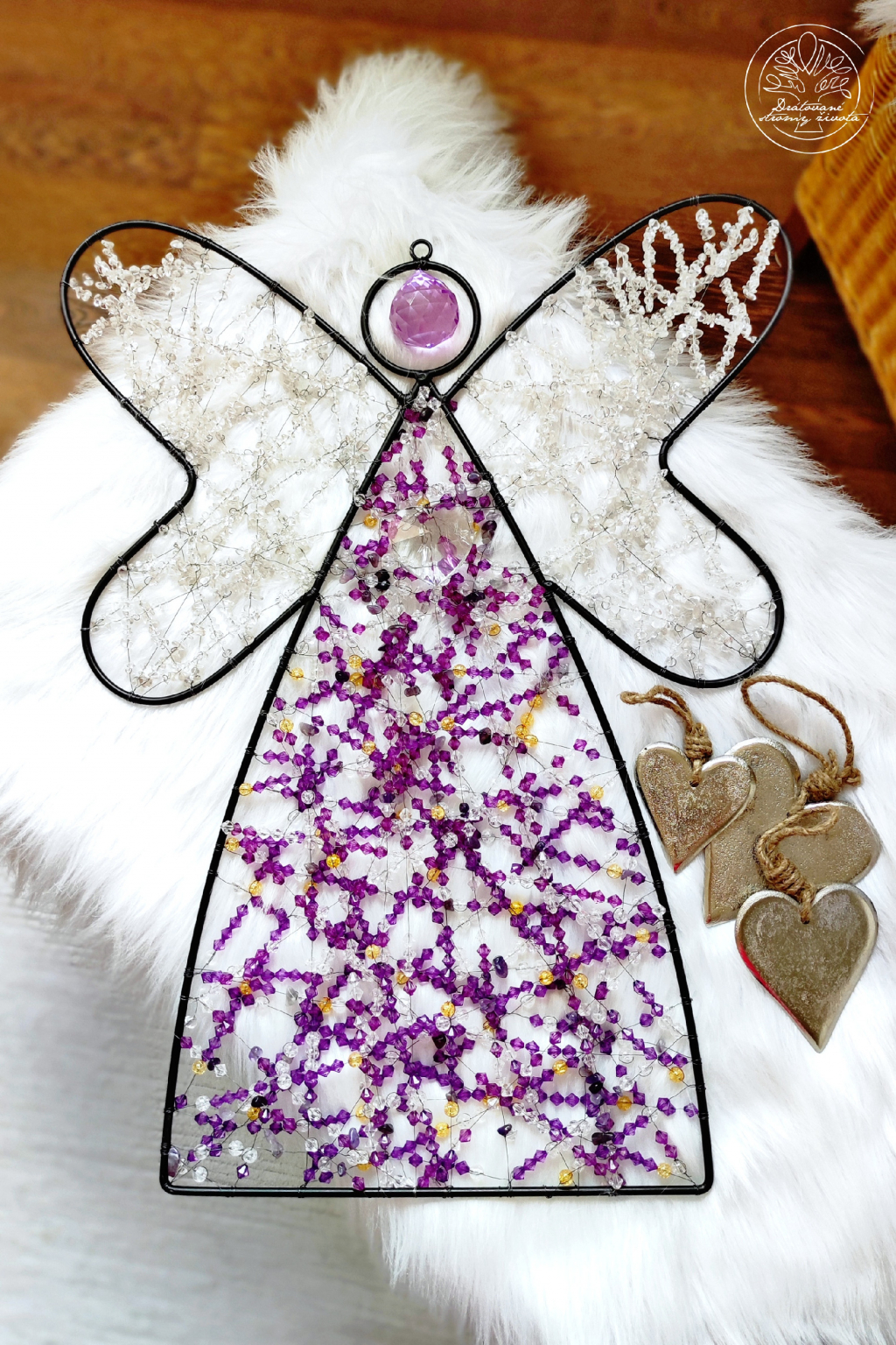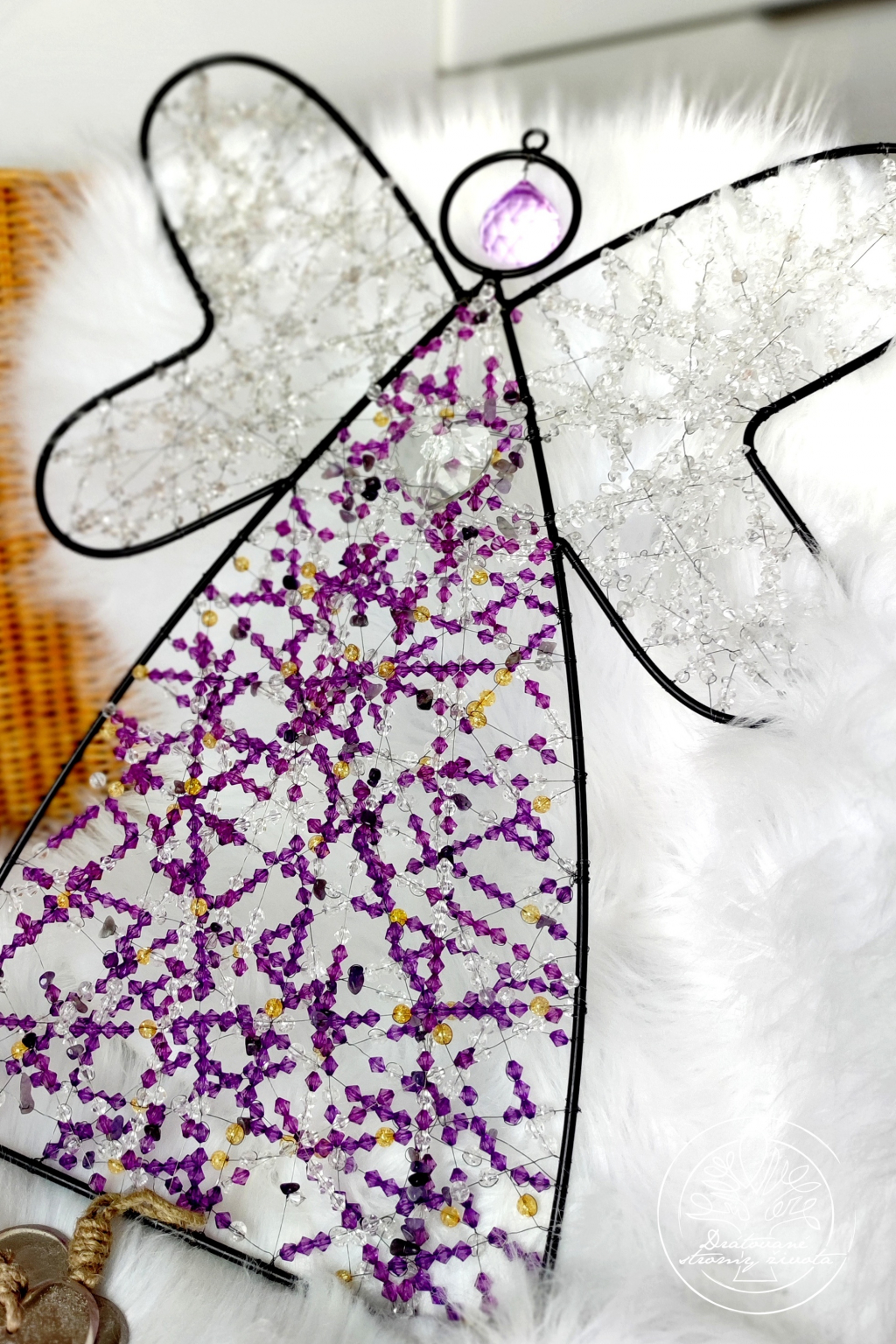 V andílkovi jsou použity polodrahokamy Křišťálu, ze kterého jsou vypleteny celá křídla a Ametystu, který je přidám do sukýnky andílka.