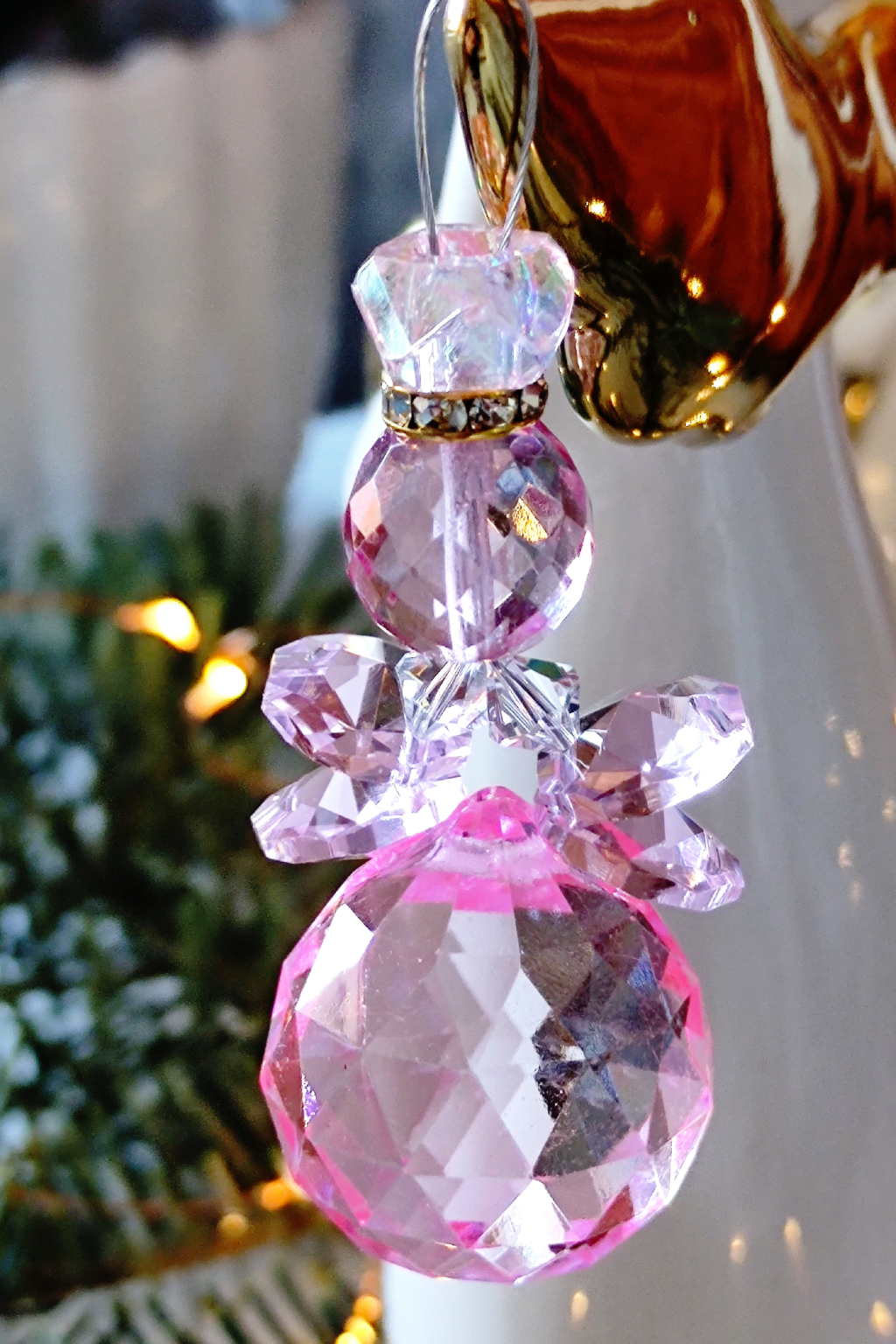 Korálky pod hlavičkou jsou Swarovski, dodávají tak světlohře překrásně čisté odlesky a tu nejvyšší kvalitu. Andílek má na hlavě třpytivou čelenku a korunku s duhovými odlesky. Je skutečně překrásný.