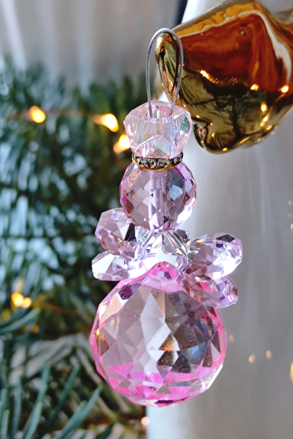 Křišťálová klíčenka vyrobena z křišťálového Fenf Shui ověsu v AAA kvalitě, broušené růžové hlavičky a skleněných broušených křídel, zavěšených na ocelovém lanku zakončeného očkem, aby se dal andílek zavěsit třeba na klíče, nebo kamkoli jinam.