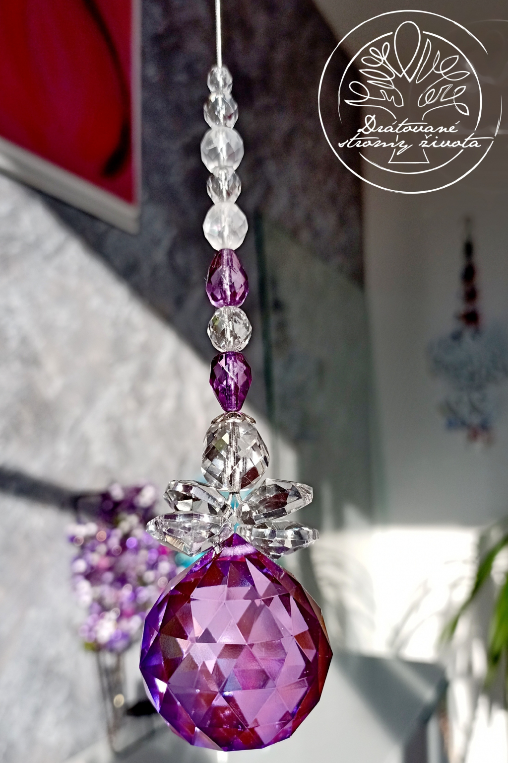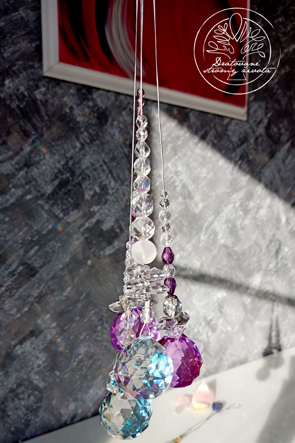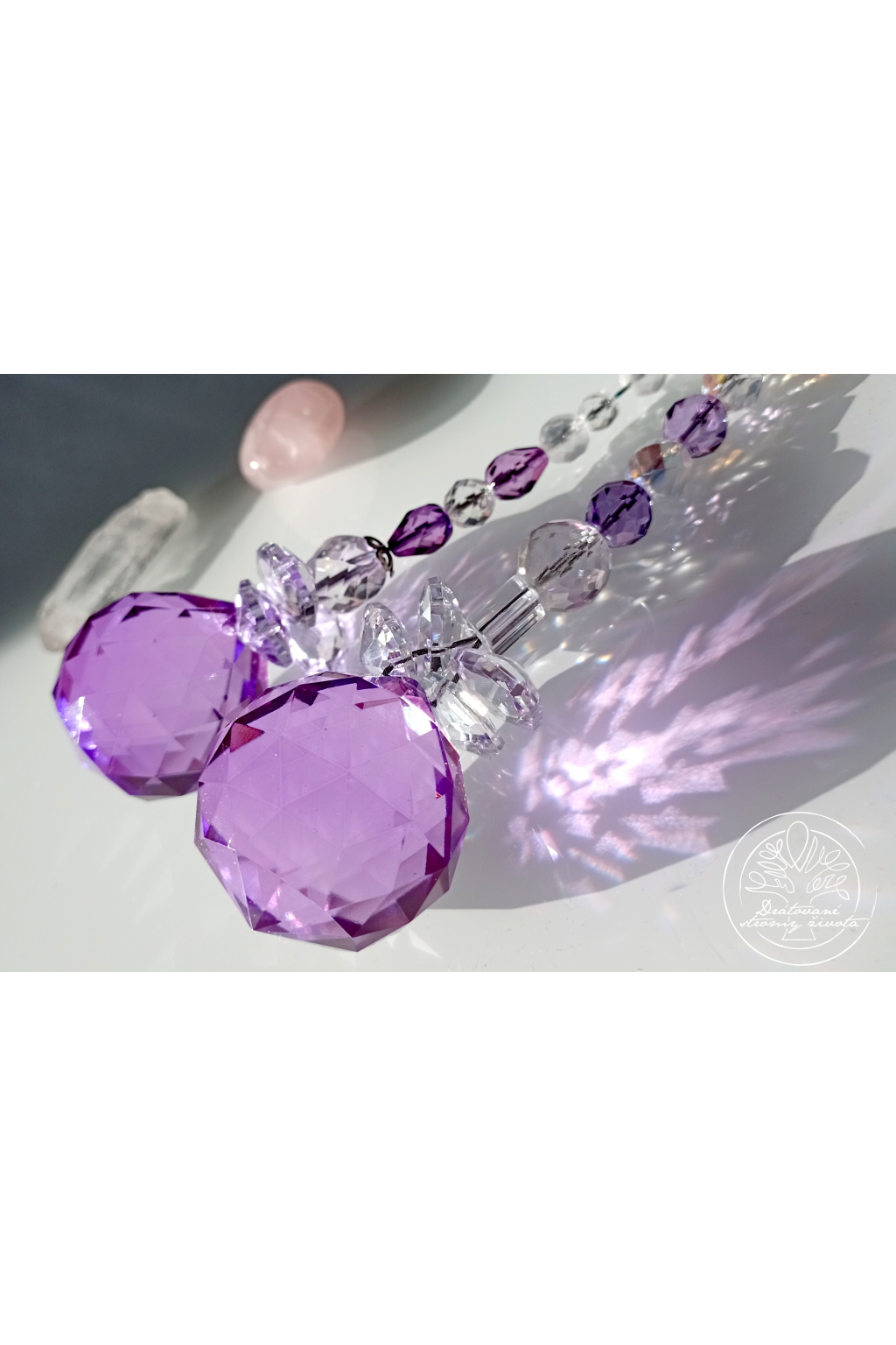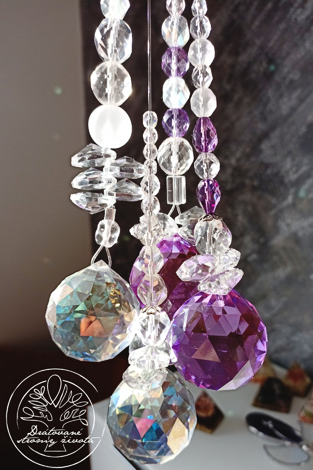 Křišťálová světlohra vyrobena z křišťálového Fenf Shui ověsu v AAA kvalitě v barvě šeříků a skleněných broušených českých korálků, zavěšených na ocelovém lanku.