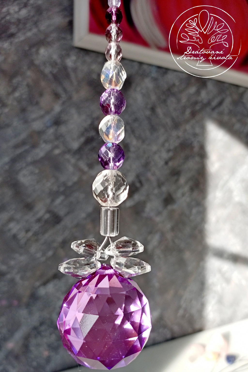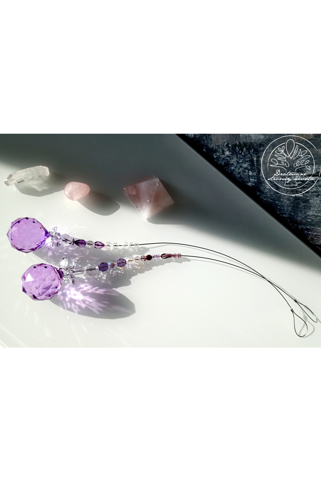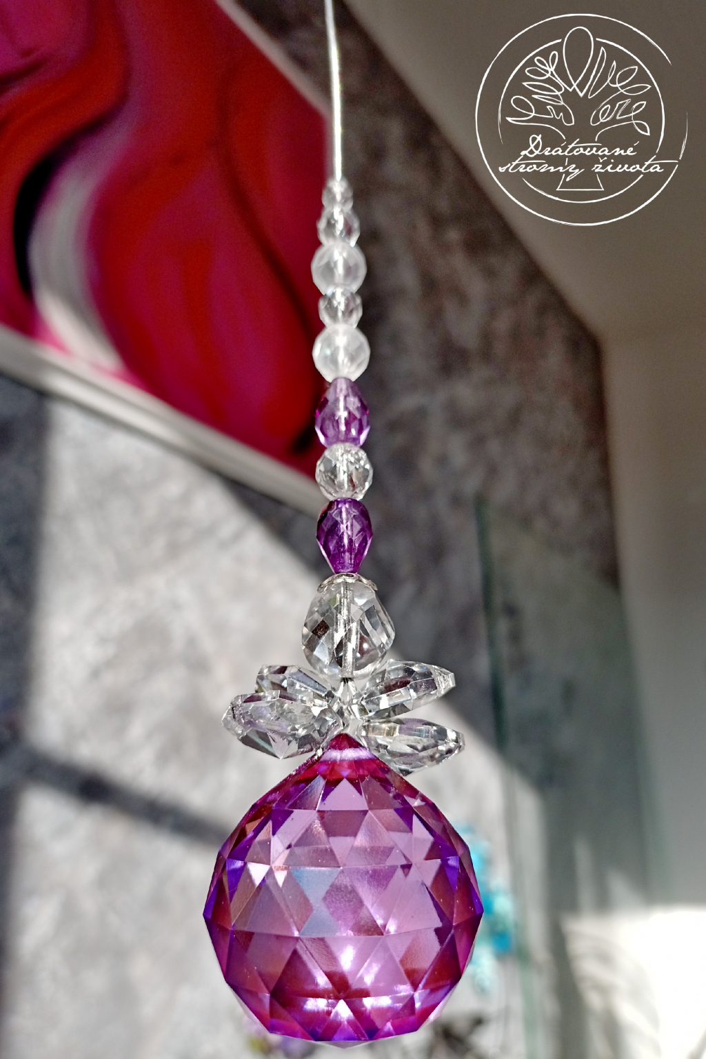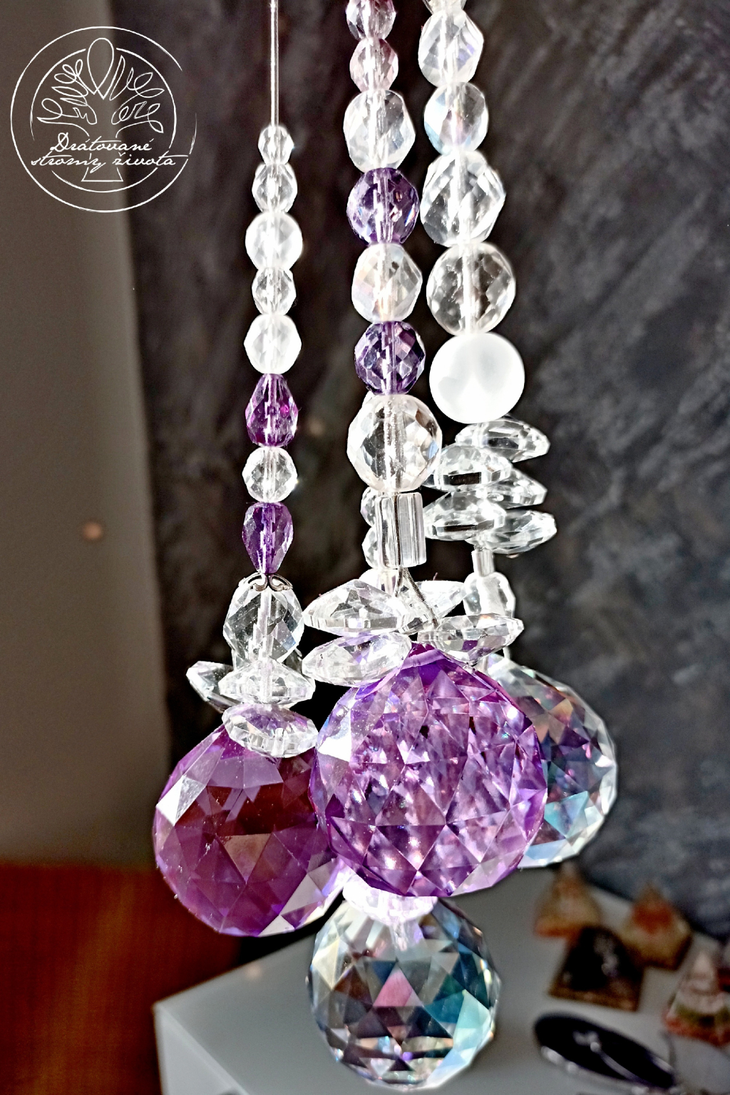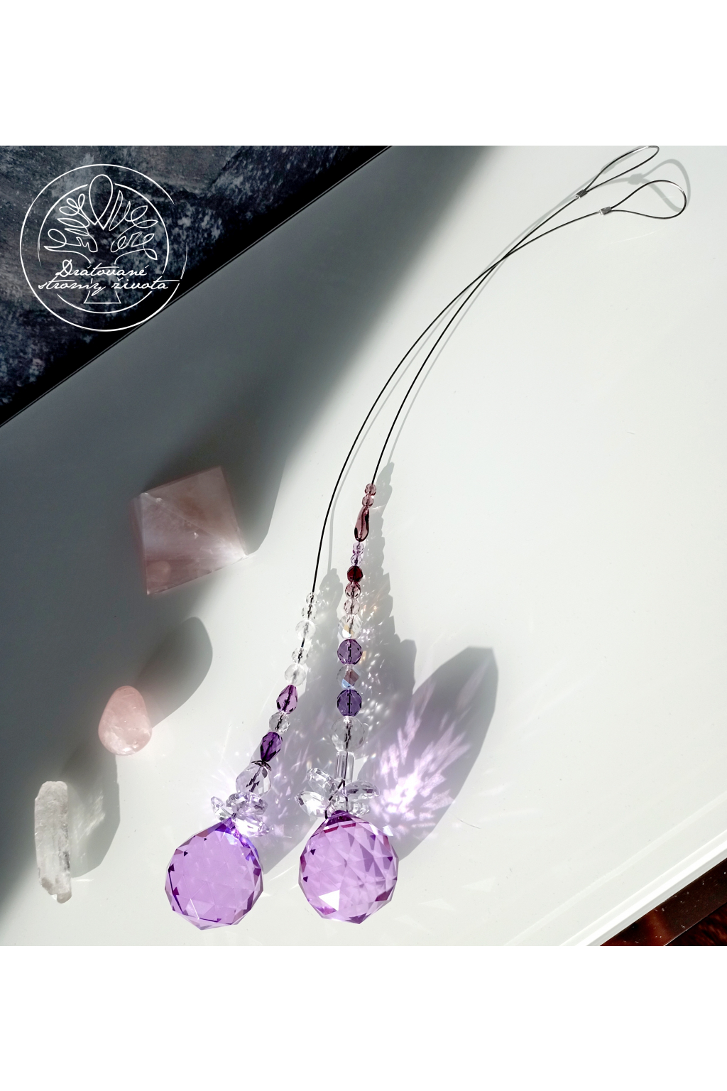 Křišťálová světlohra vyrobena z křišťálového Fenf Shui ověsu v AAA kvalitě v barvě šeříků a skleněných broušených českých korálků, zavěšených na ocelovém lanku.