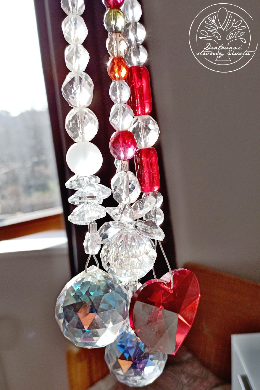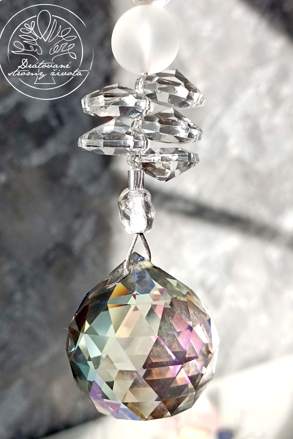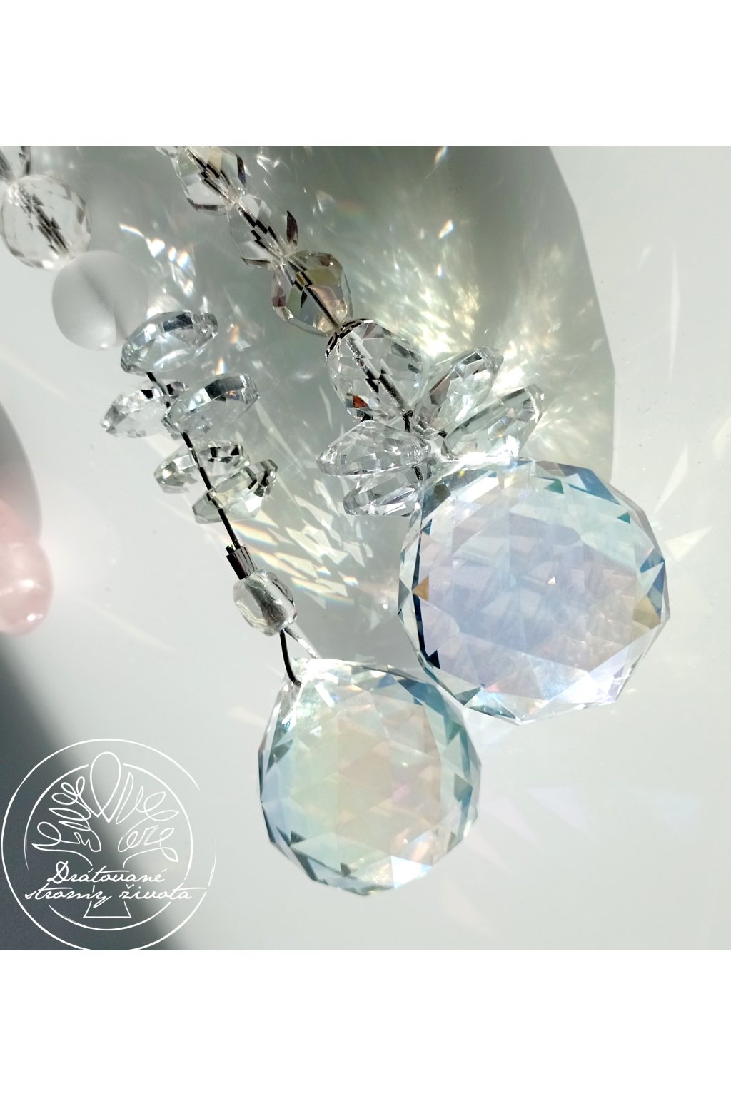 Křišťálová světlohra vyrobena z křišťálového Fenf Shui ověsu v AAA kvalitě v barvě pokoveného křišťálu a skleněných broušených českých korálků, zavěšených na ocelovém lanku.
