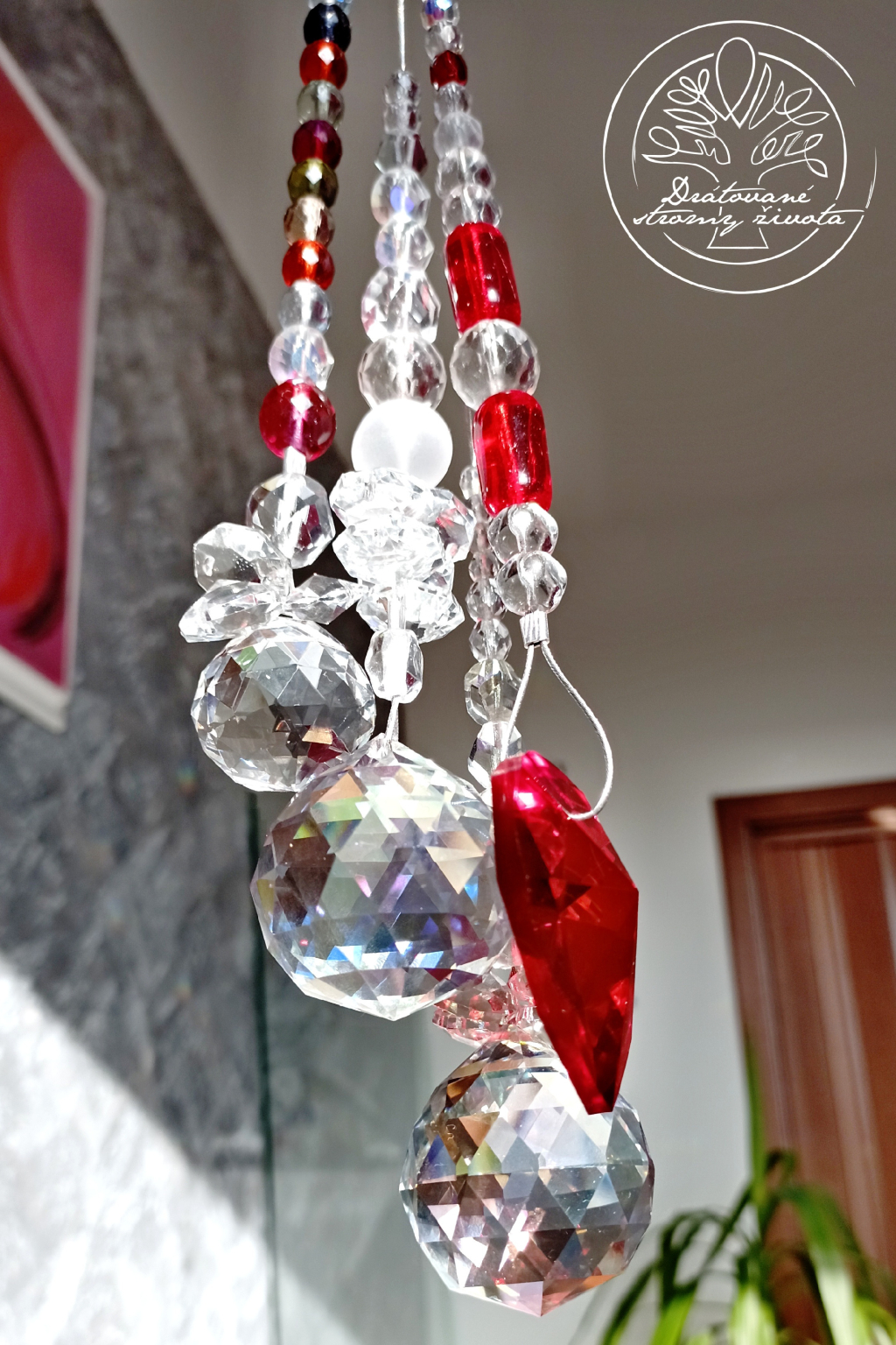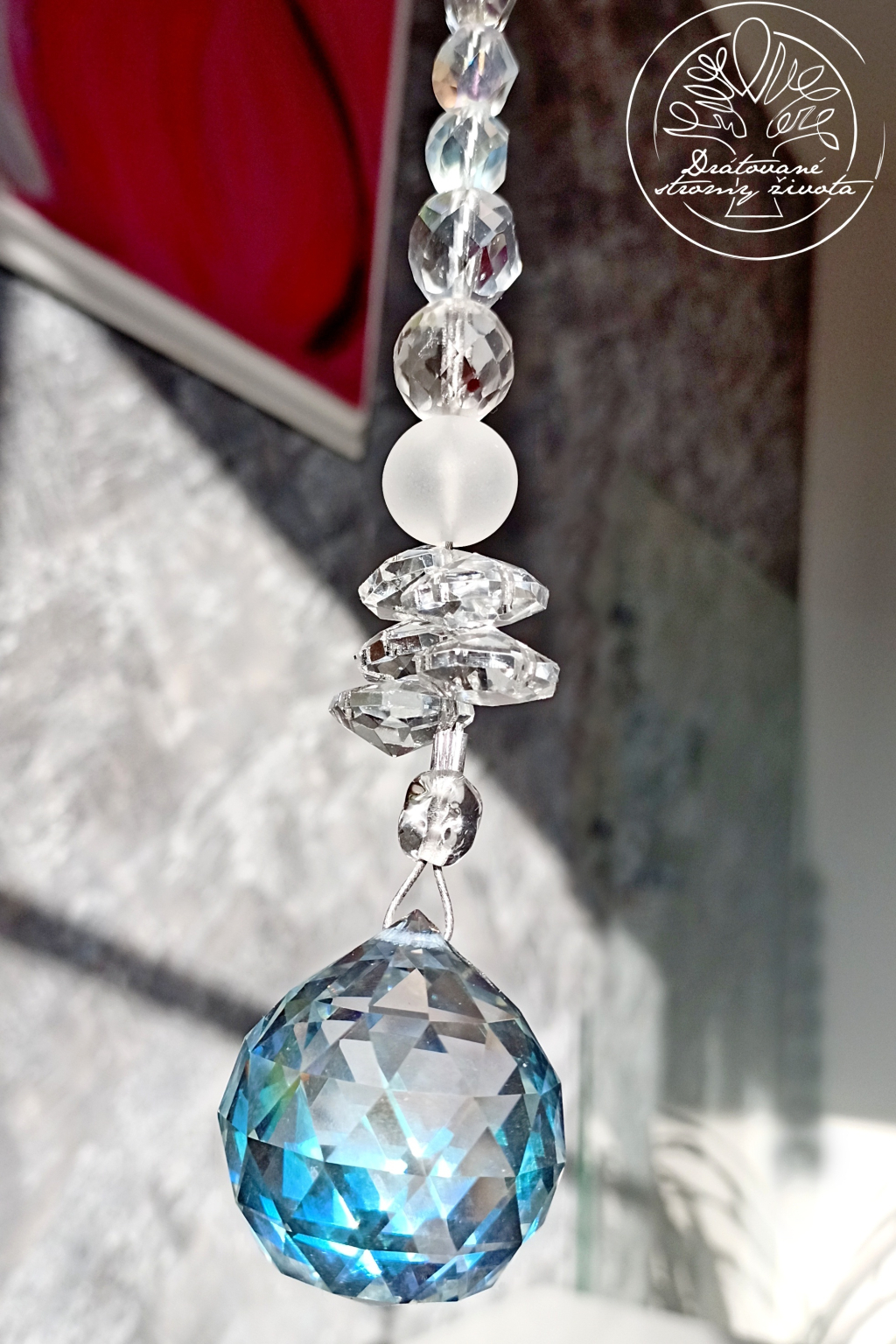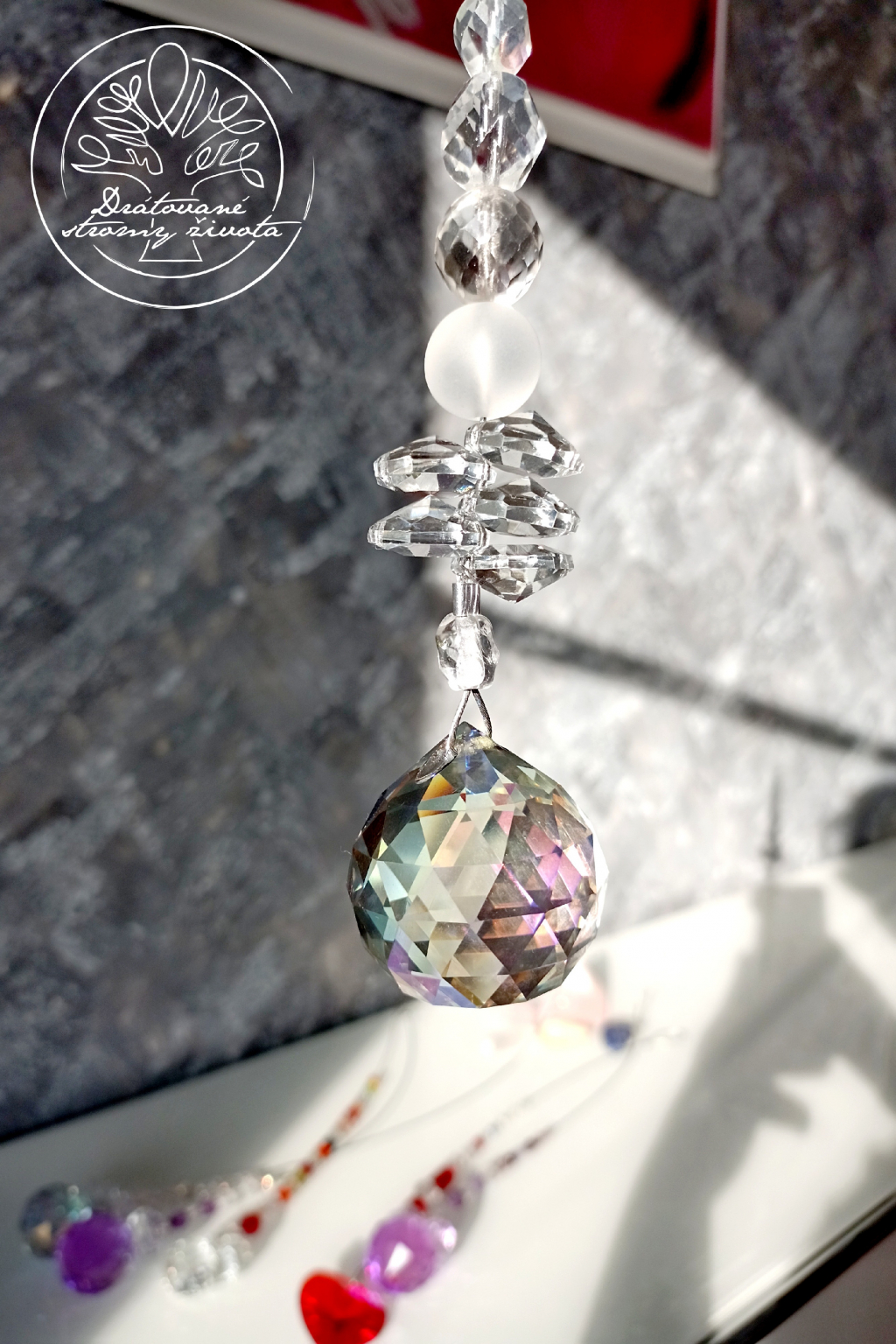 Křišťálová světlohra vyrobena z křišťálového Fenf Shui ověsu v AAA kvalitě v barvě pokoveného křišťálu a skleněných broušených českých korálků, zavěšených na ocelovém lanku.