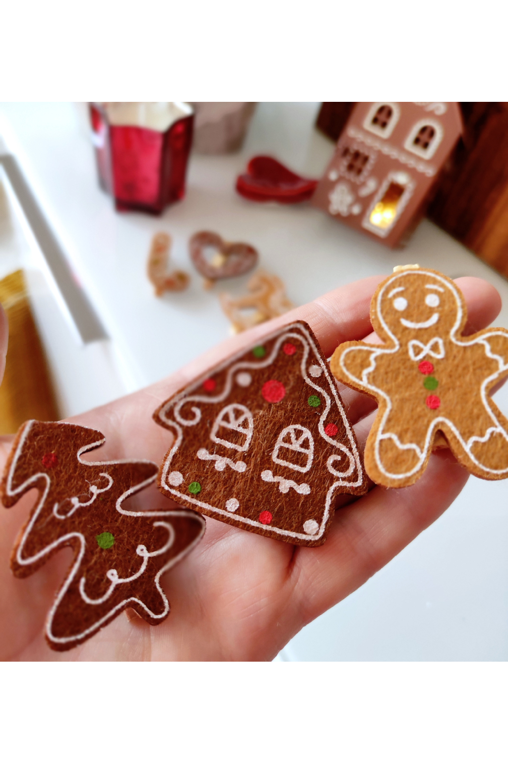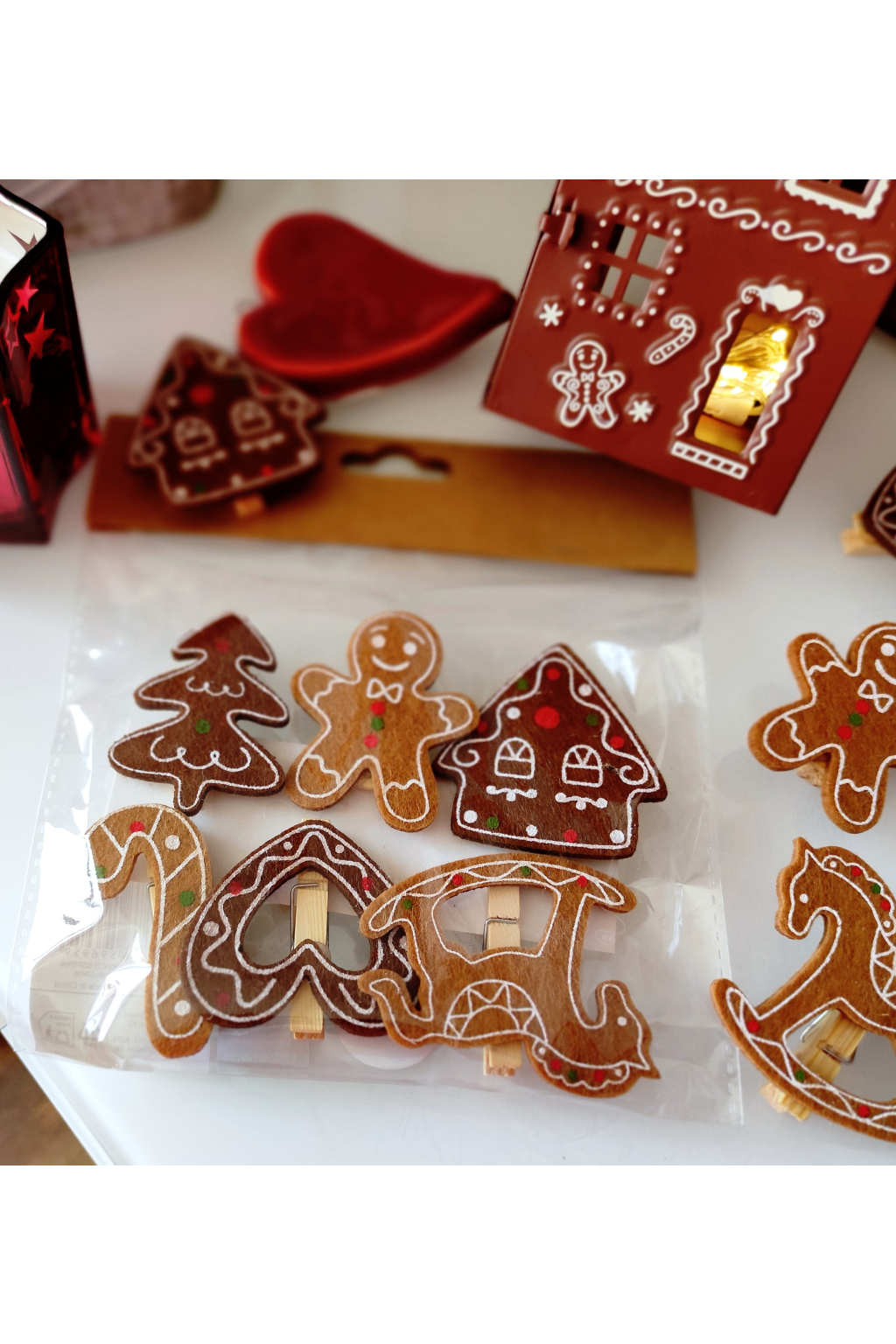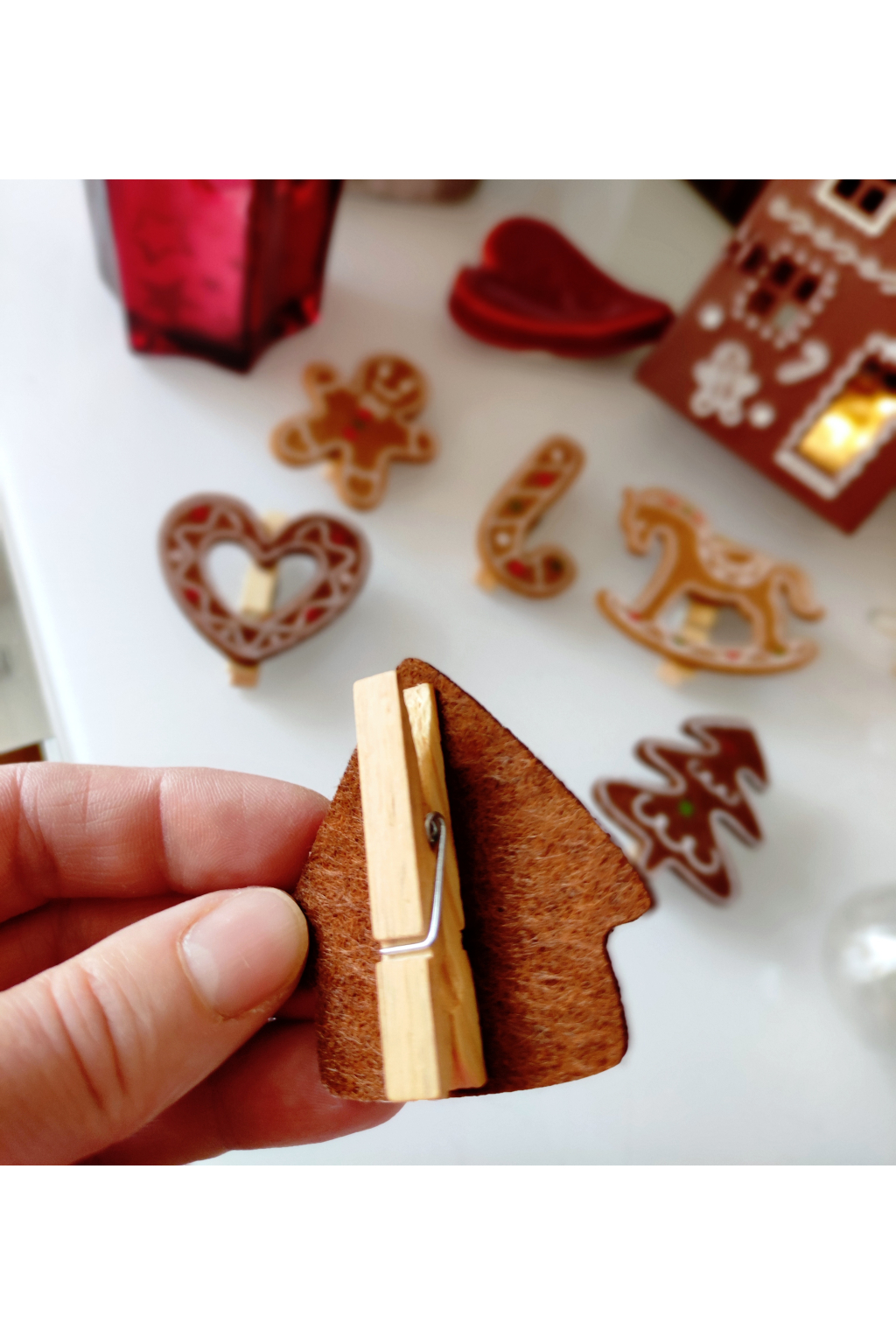 Šestice filcových kolíčků ve tvaru medových perníčků s kolíčky na připnutí na vánoční balíček nebo větvičku vánočního stromečku.