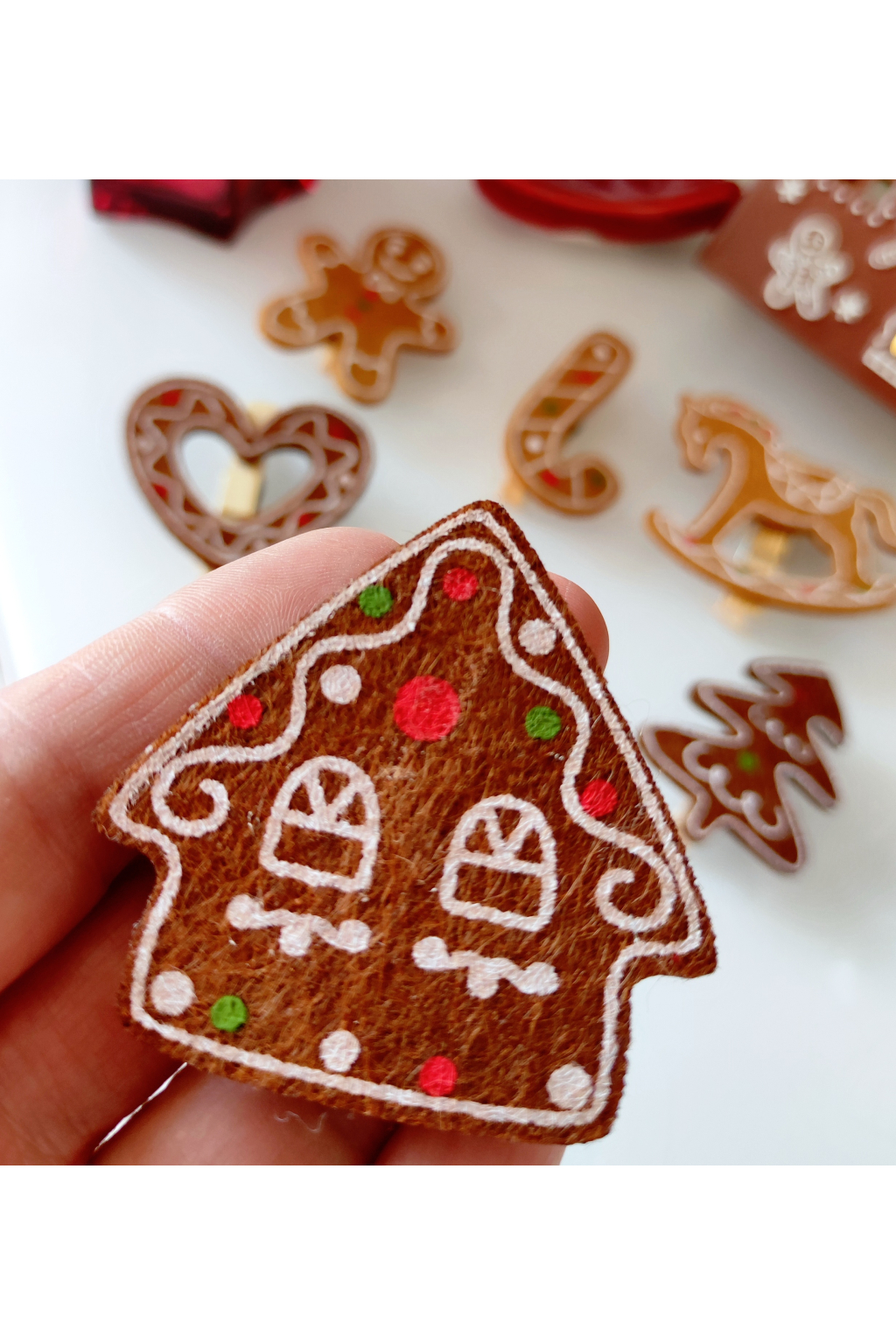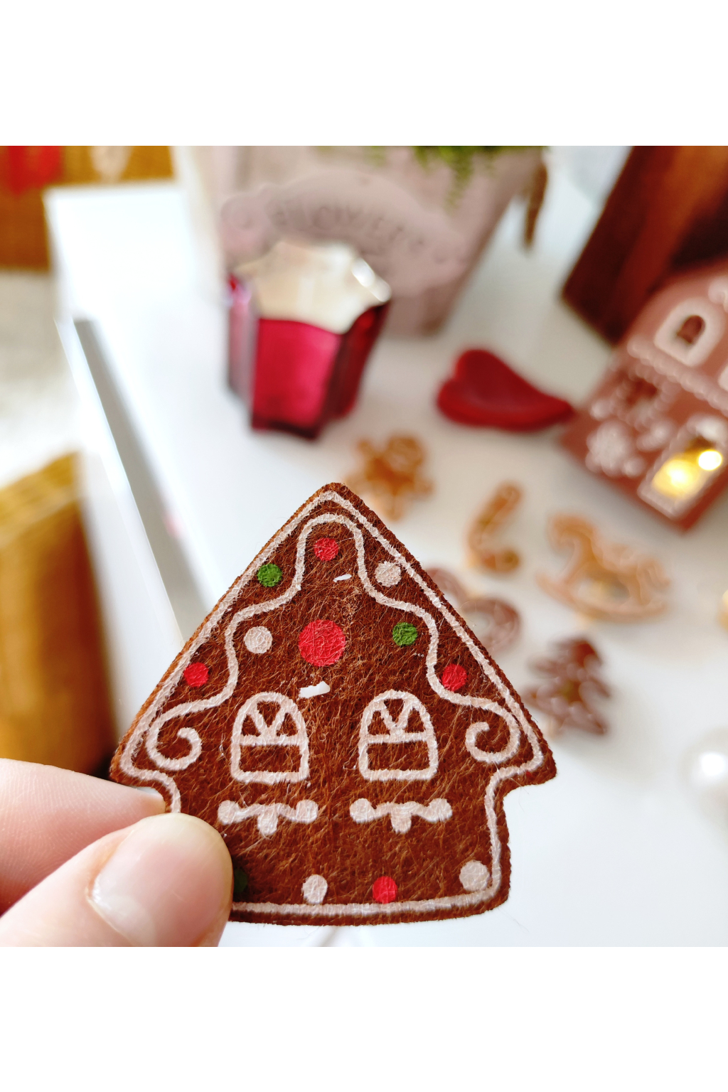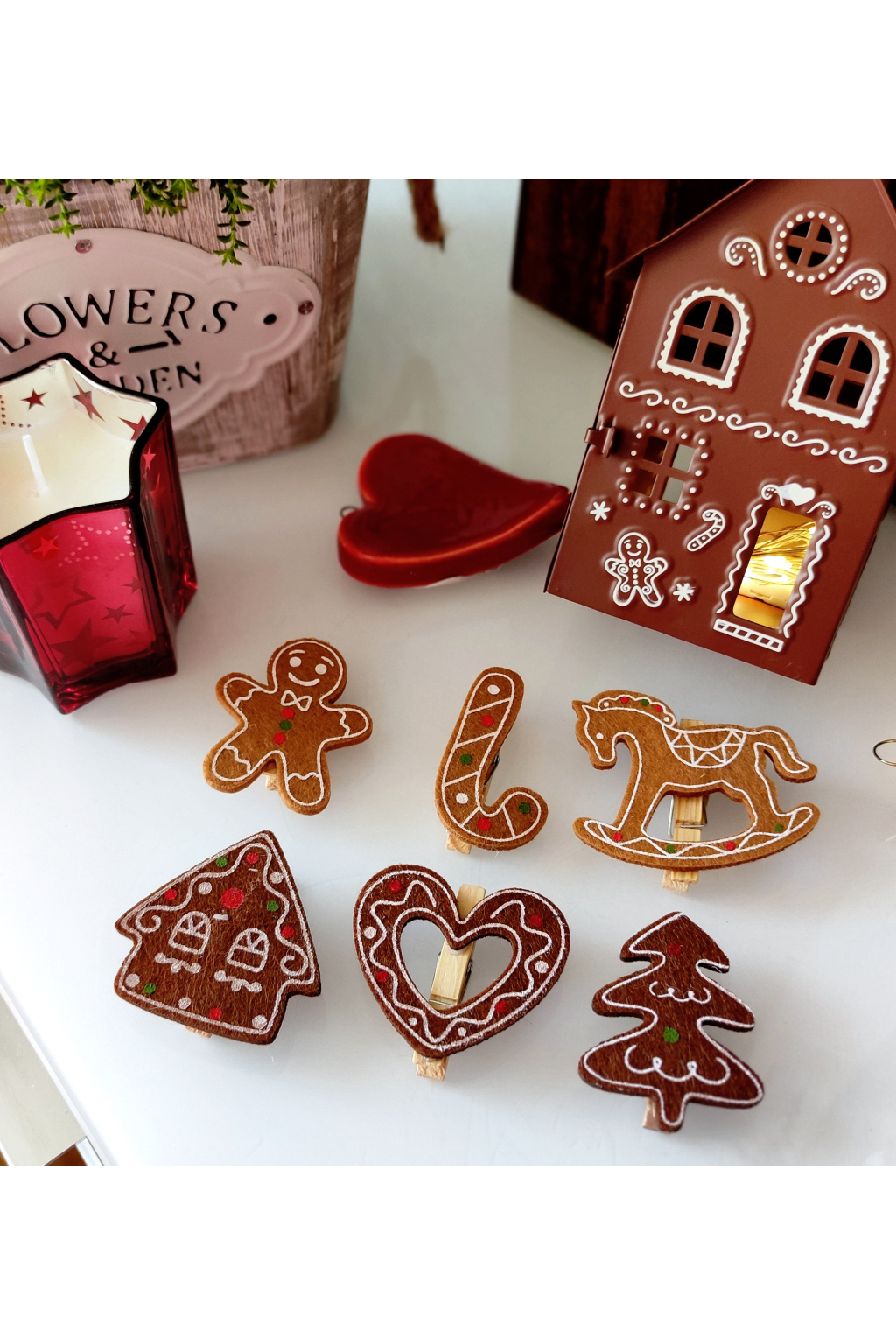Šestice filcových kolíčků ve tvaru medových perníčků s kolíčky na připnutí na vánoční balíček nebo větvičku vánočního stromečku.