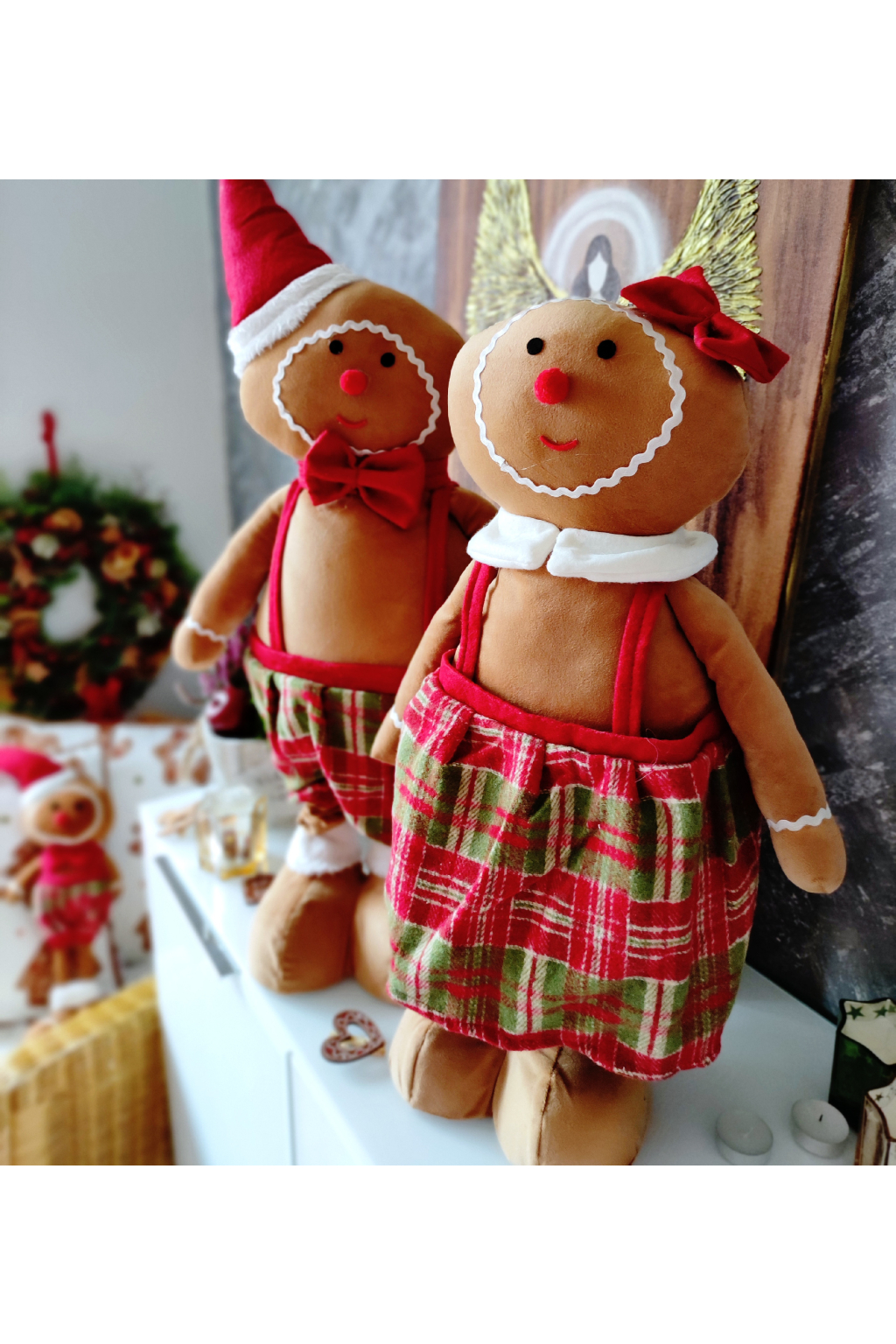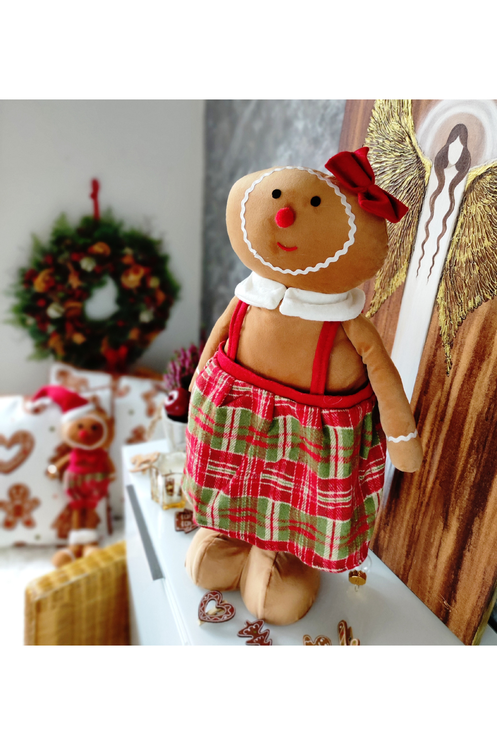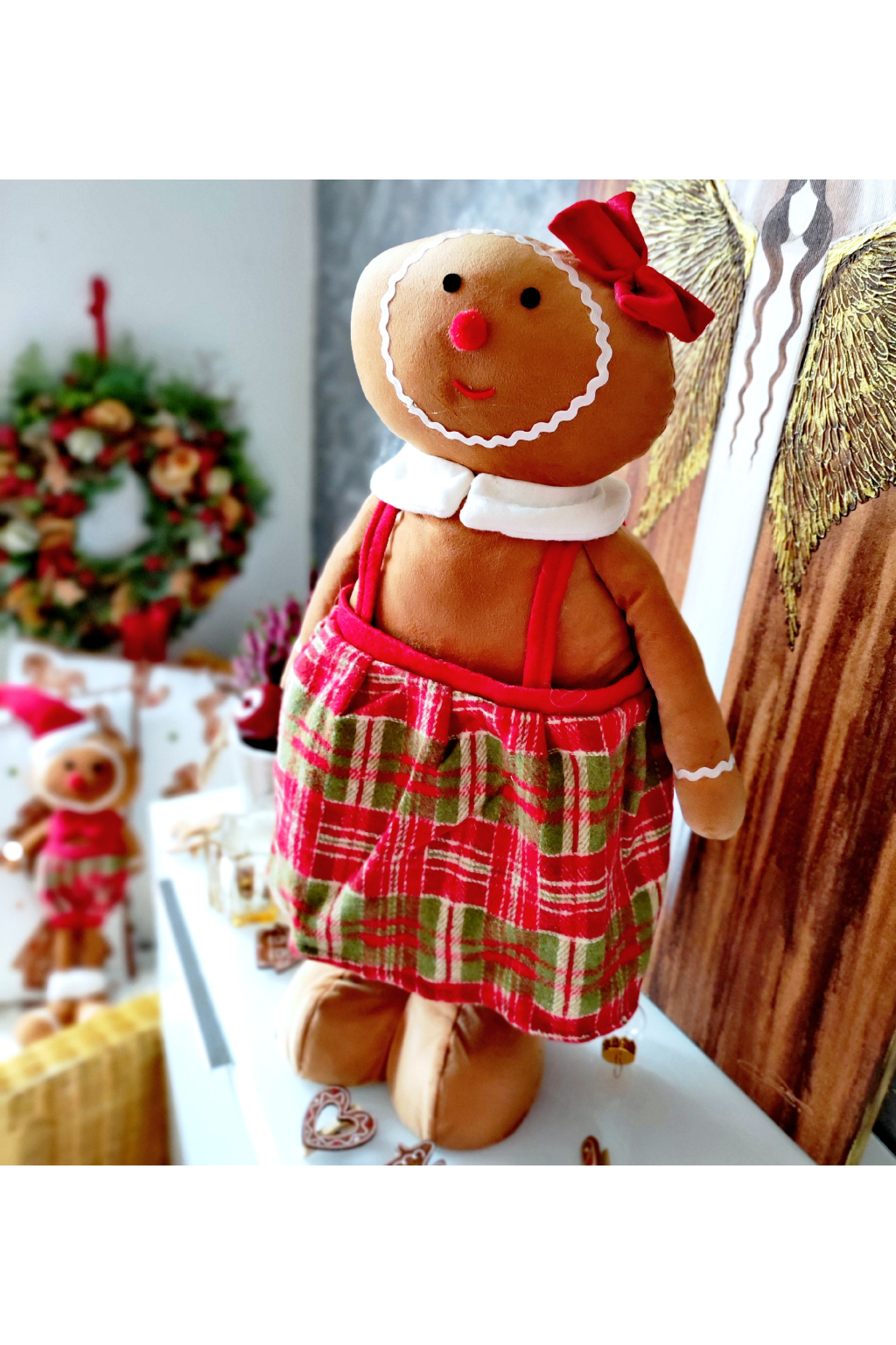Tento krásný plyšový perníček holčička přináší do domova hravost a kouzlo pravých českých Vánoc. Jeho hnědo-červený oděv v kombinaci kostkované sukénky, červené mašle a roztomilého límečku působí mile a slavnostně – jako by právě vystoupila z vánoční pohádky.