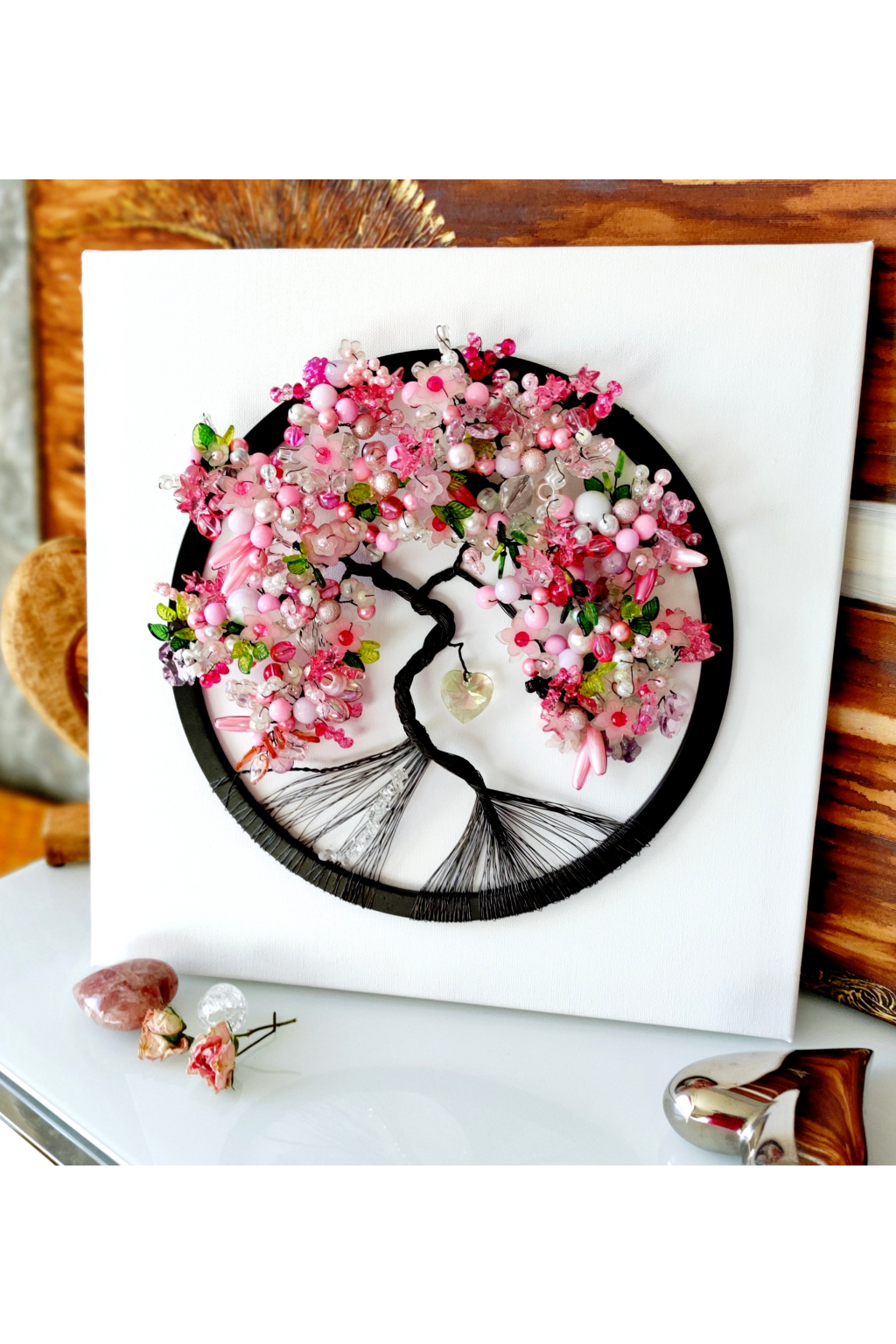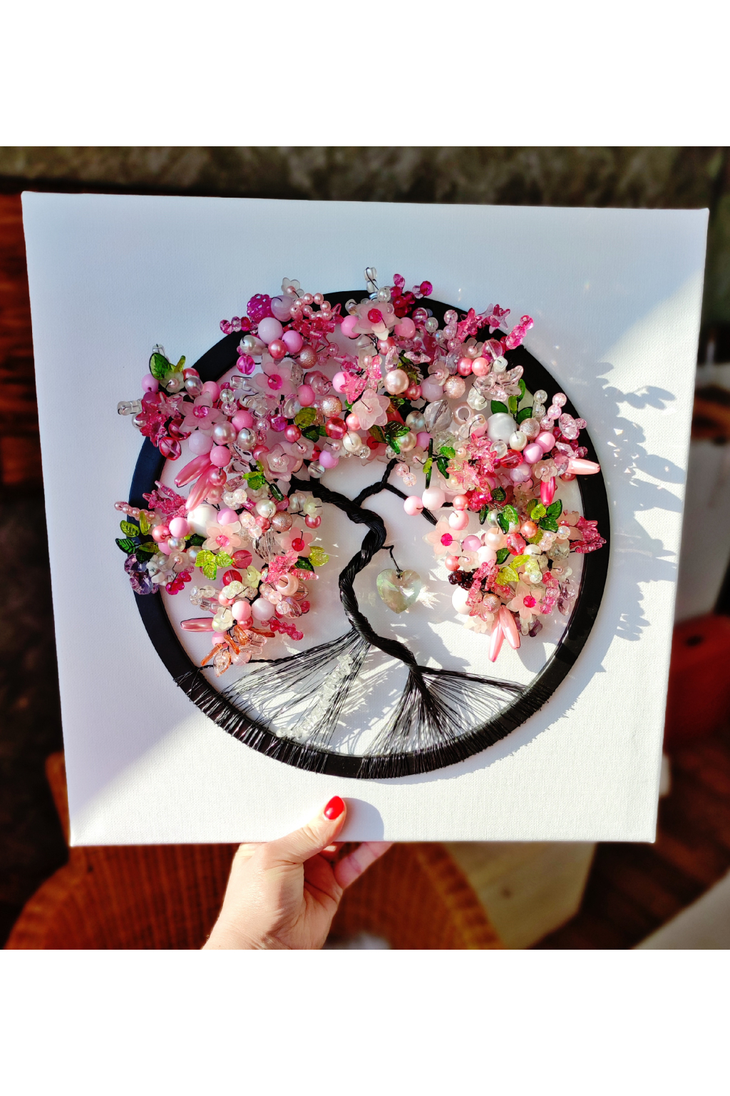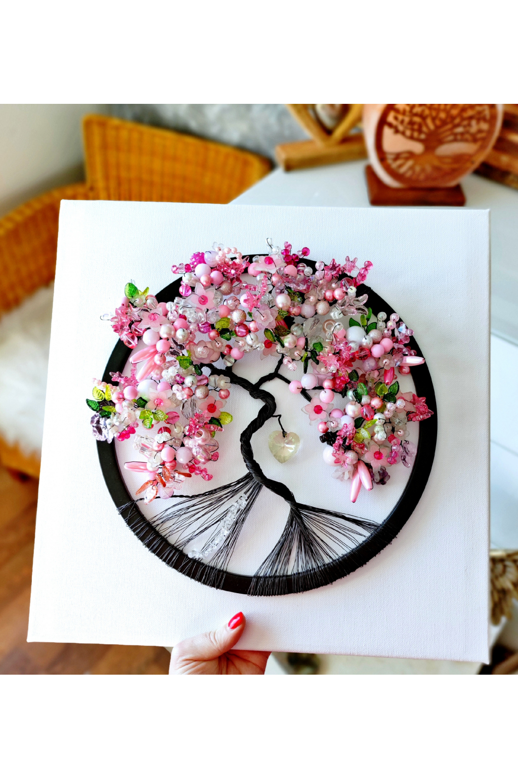 Drátovaný strom života s názvem "Laskavé srdce" 30cm upletený v růžovo zelené variaci v silné kružnici, jež je zcela neviditelně a s citem připevněna na bílé plátno o velikosti 40x40cm.