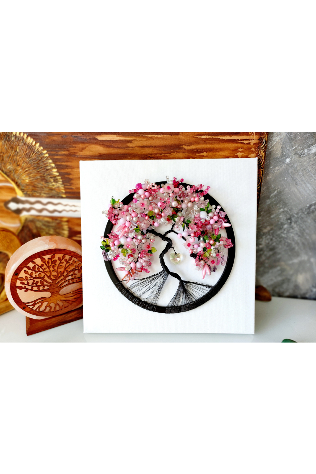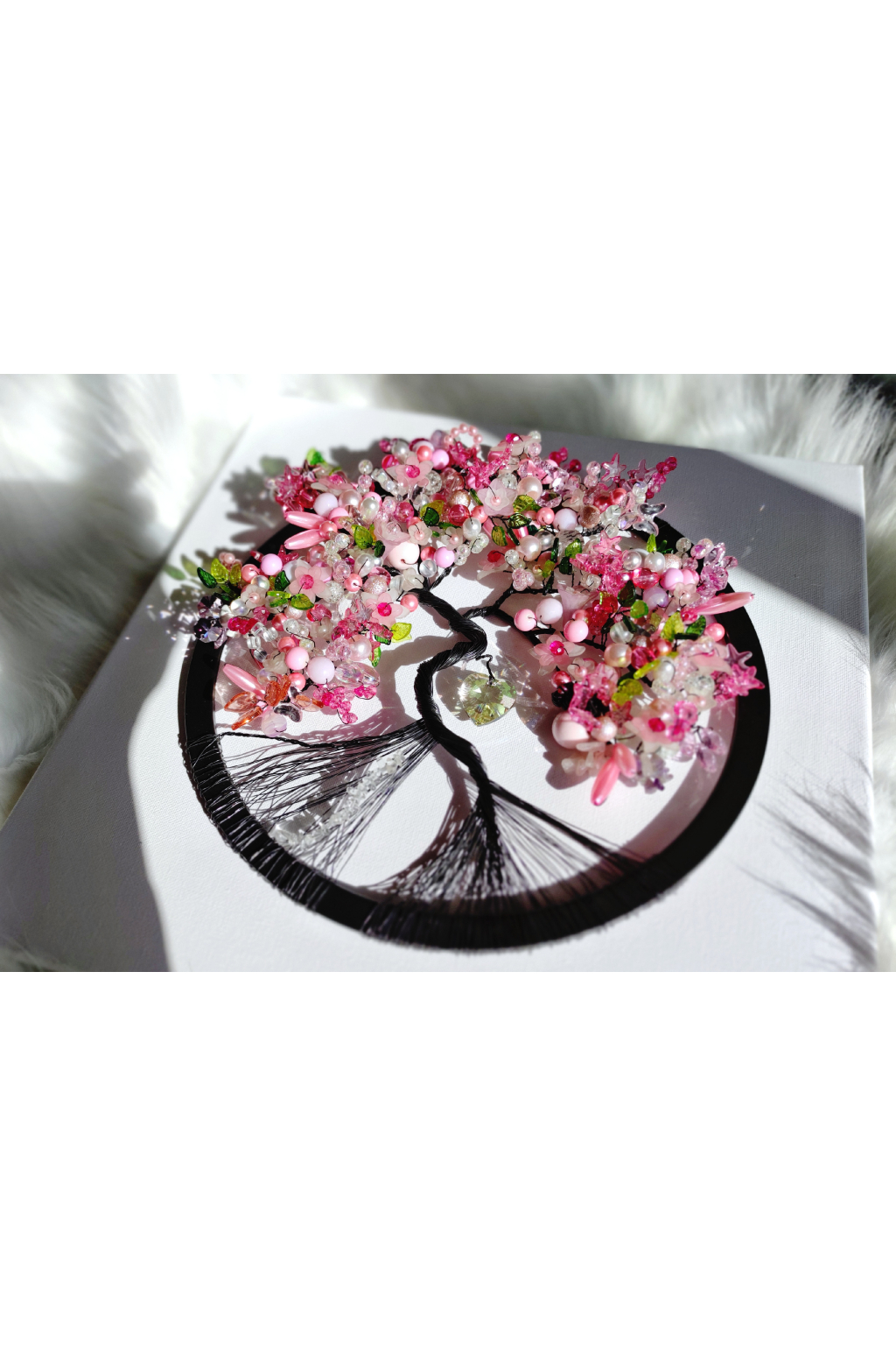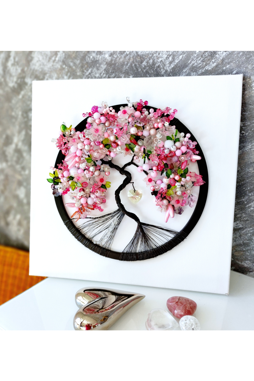 Drátovaný strom života s názvem "Laskavé srdce" 30cm upletený v růžovo zelené variaci v silné kružnici, jež je zcela neviditelně a s citem připevněna na bílé plátno o velikosti 40x40cm.