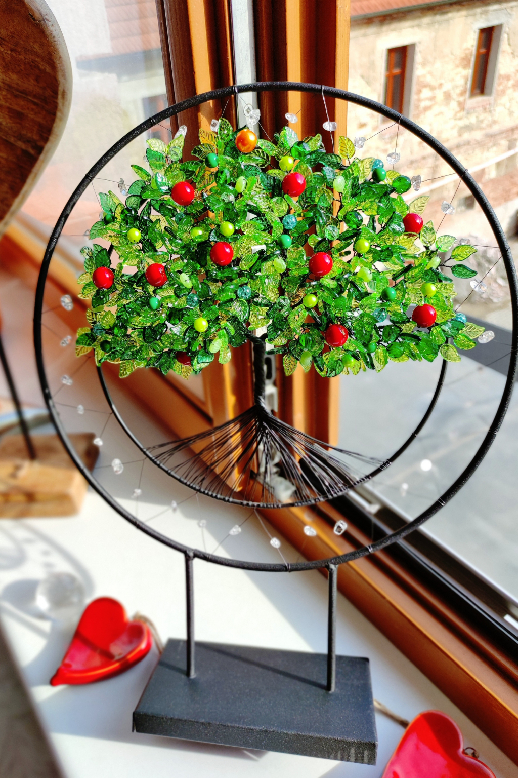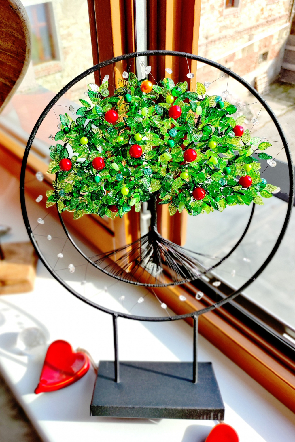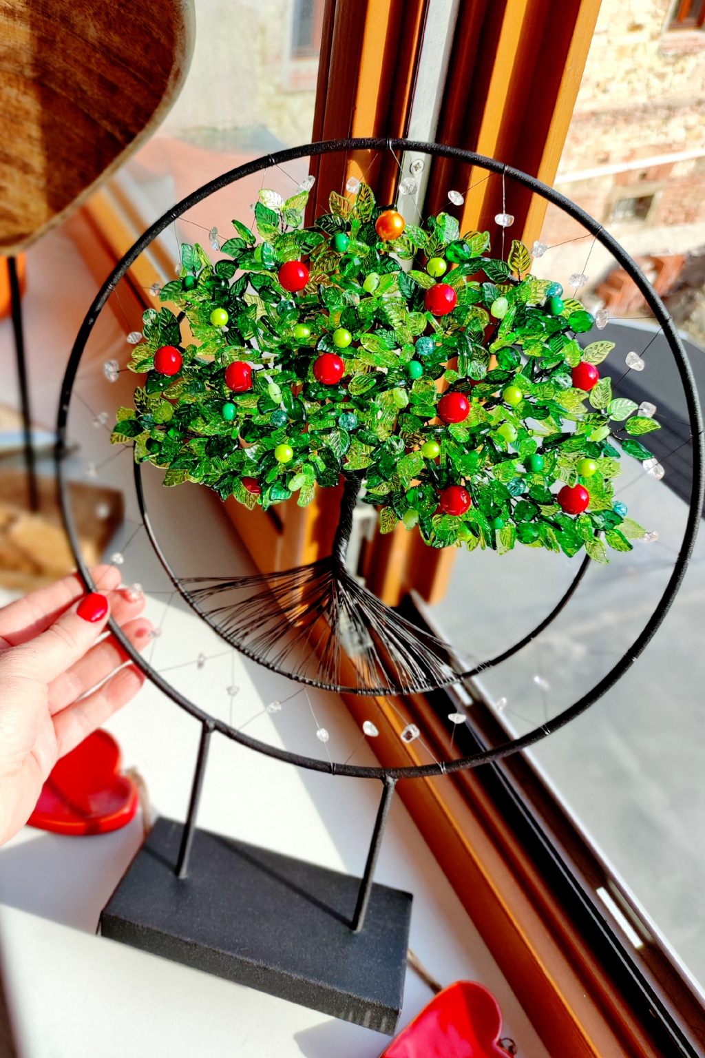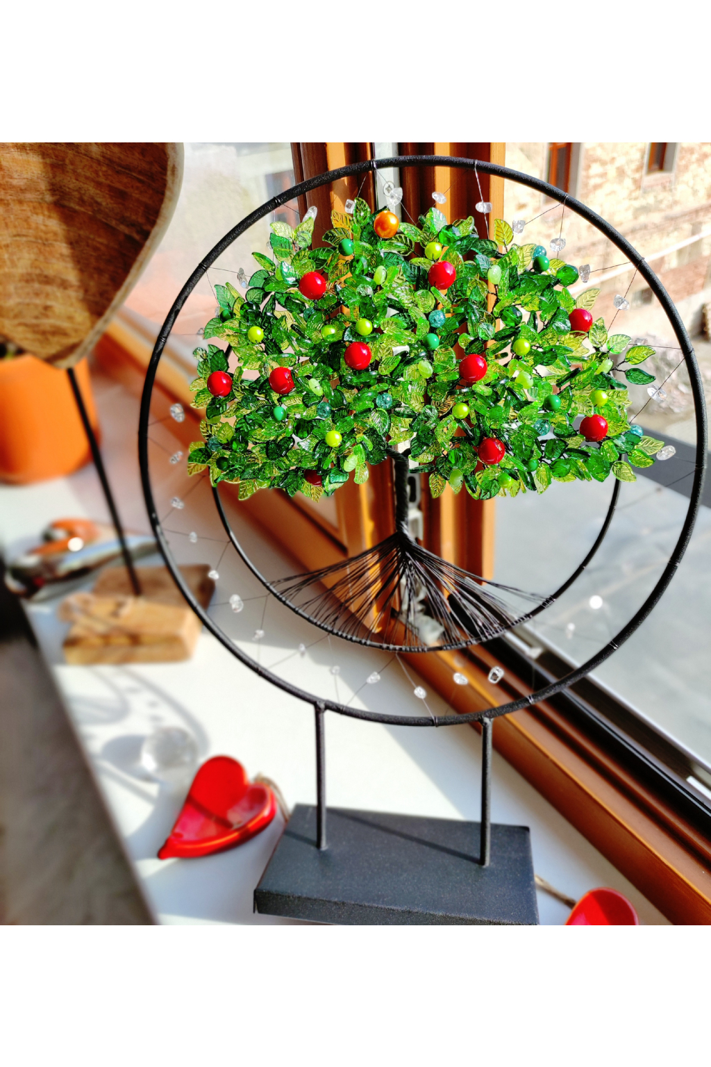 Strom s názvem "Jablíčka" s křišťálem, napleteným okolo celého stromu. Krásný živý zelený strom s červenými a jedním zlatým jablíčkem. Strom doslova dýchá a jeho energie je neskutečná.