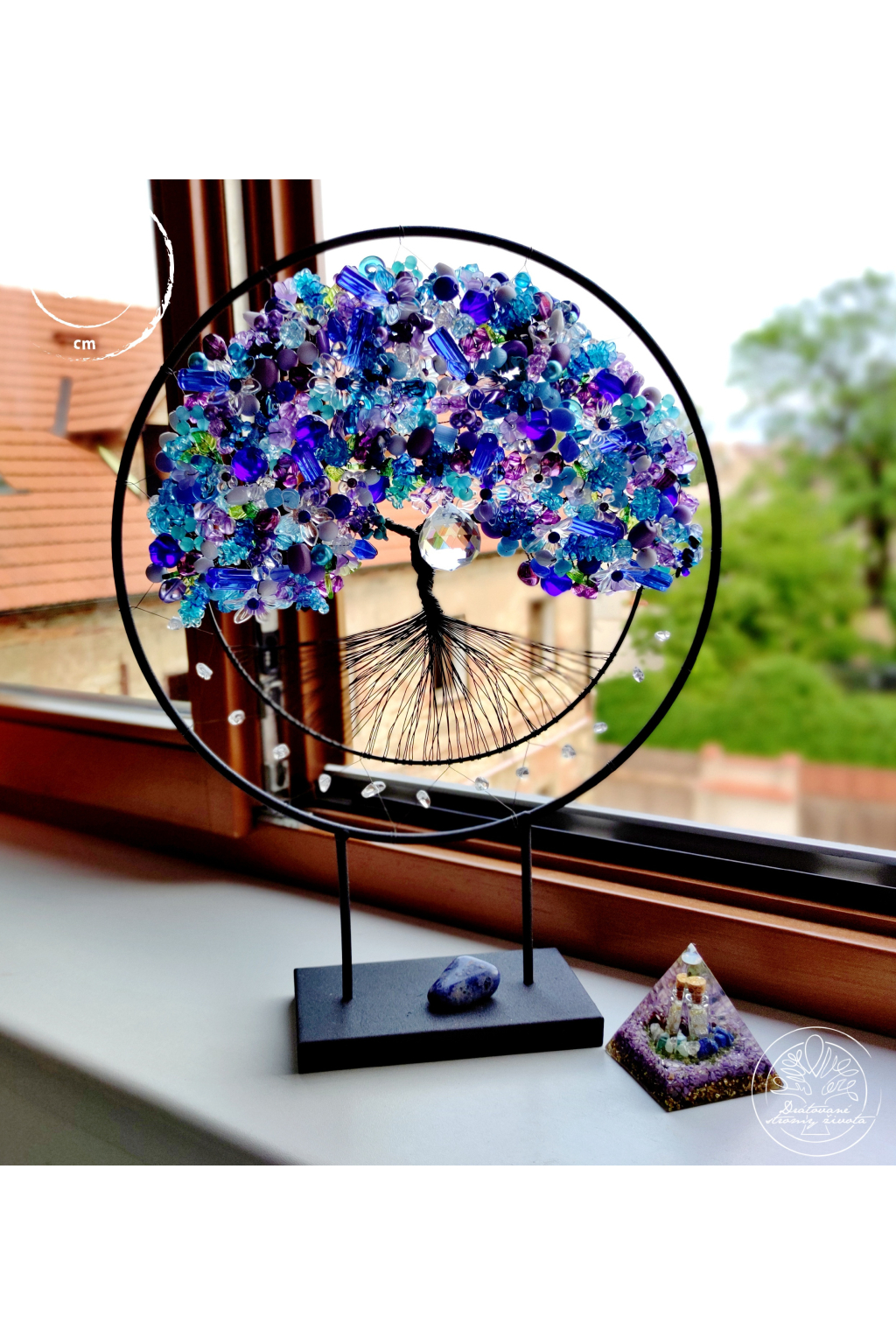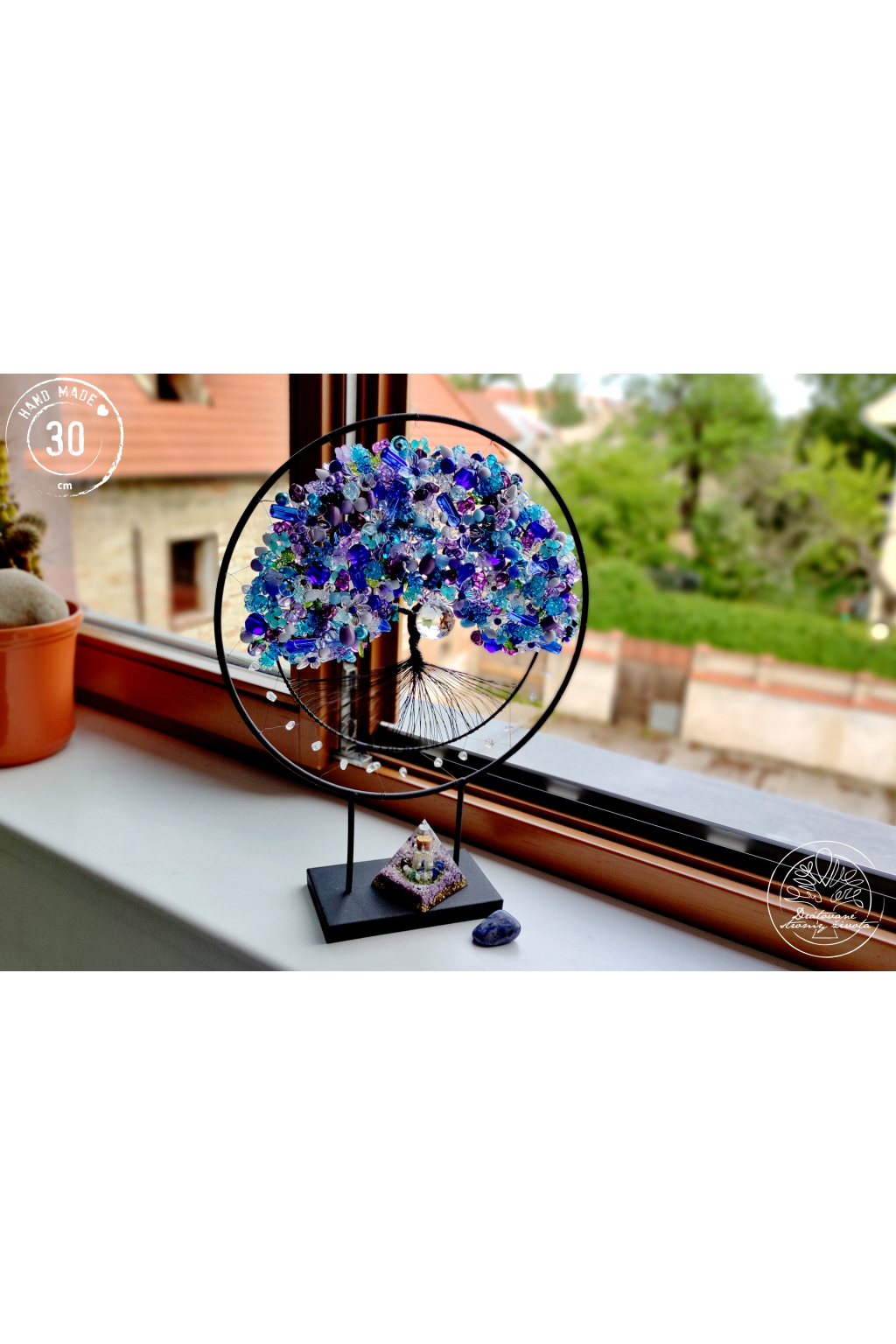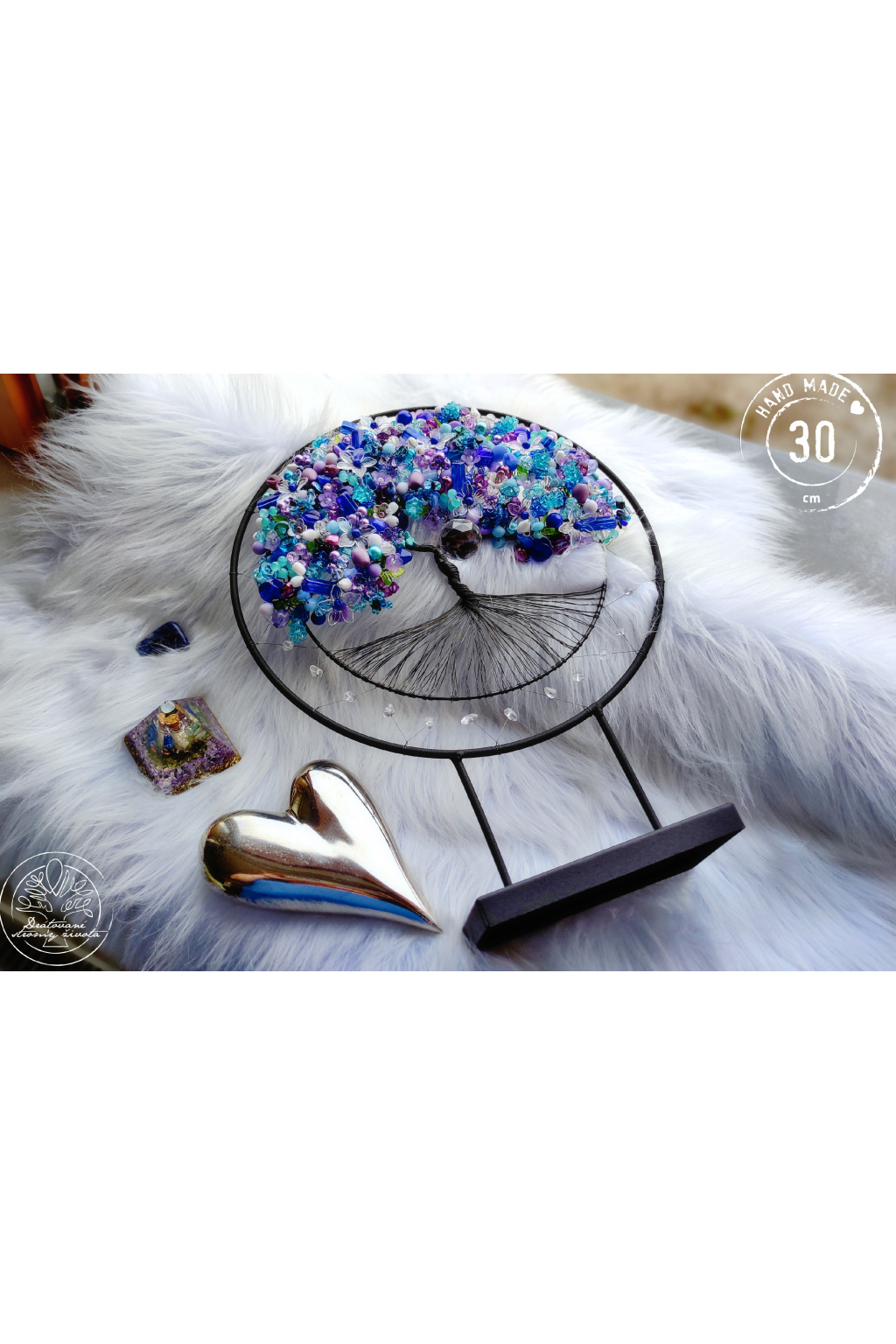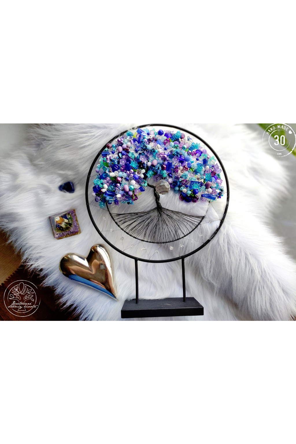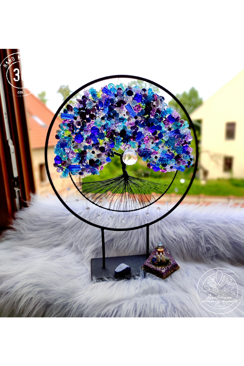 Je tak trochu jiný, než ostatní stromy. Je vsazen do černé kružnice, jež je zároveň stojánkem a strom vám tak může dělat radost na jakékoliv poličce nebo komodě. Je samostatně stojící, velmi stabilní.