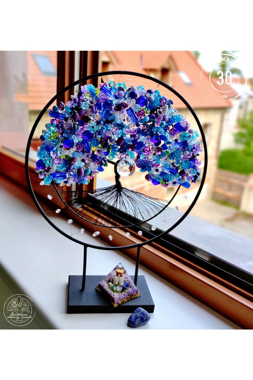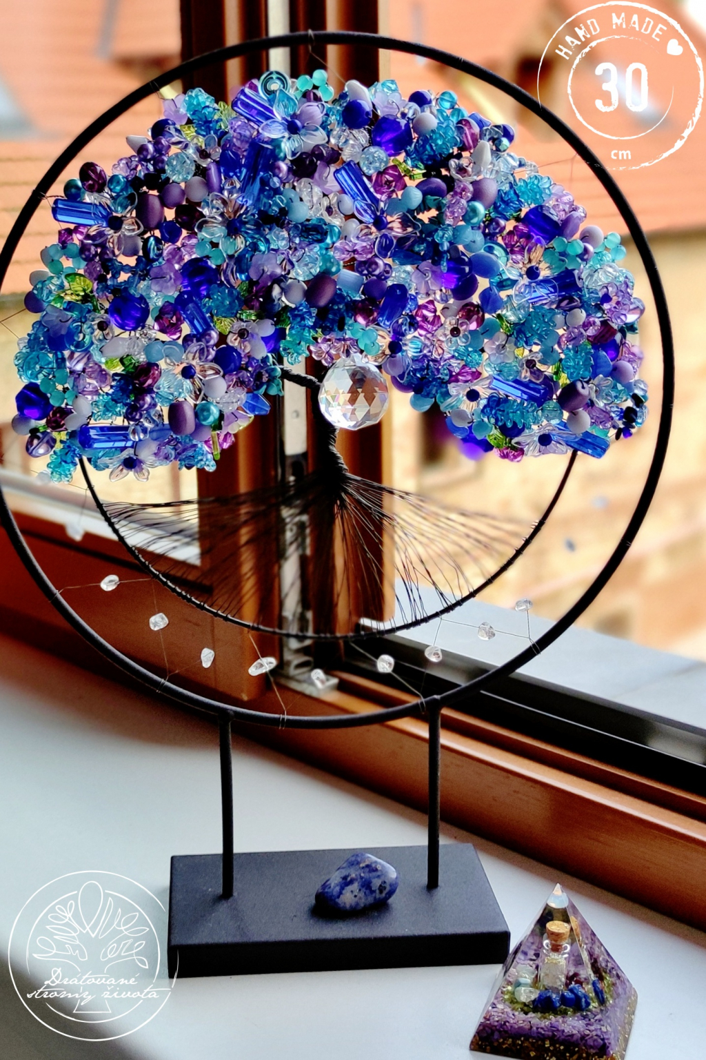 Do stromu jsme vpletli polodrahokamy ametyst, sodalit, tyrkys, lapis lazuli a křišťál, který je napleten i okolo celého stromu.