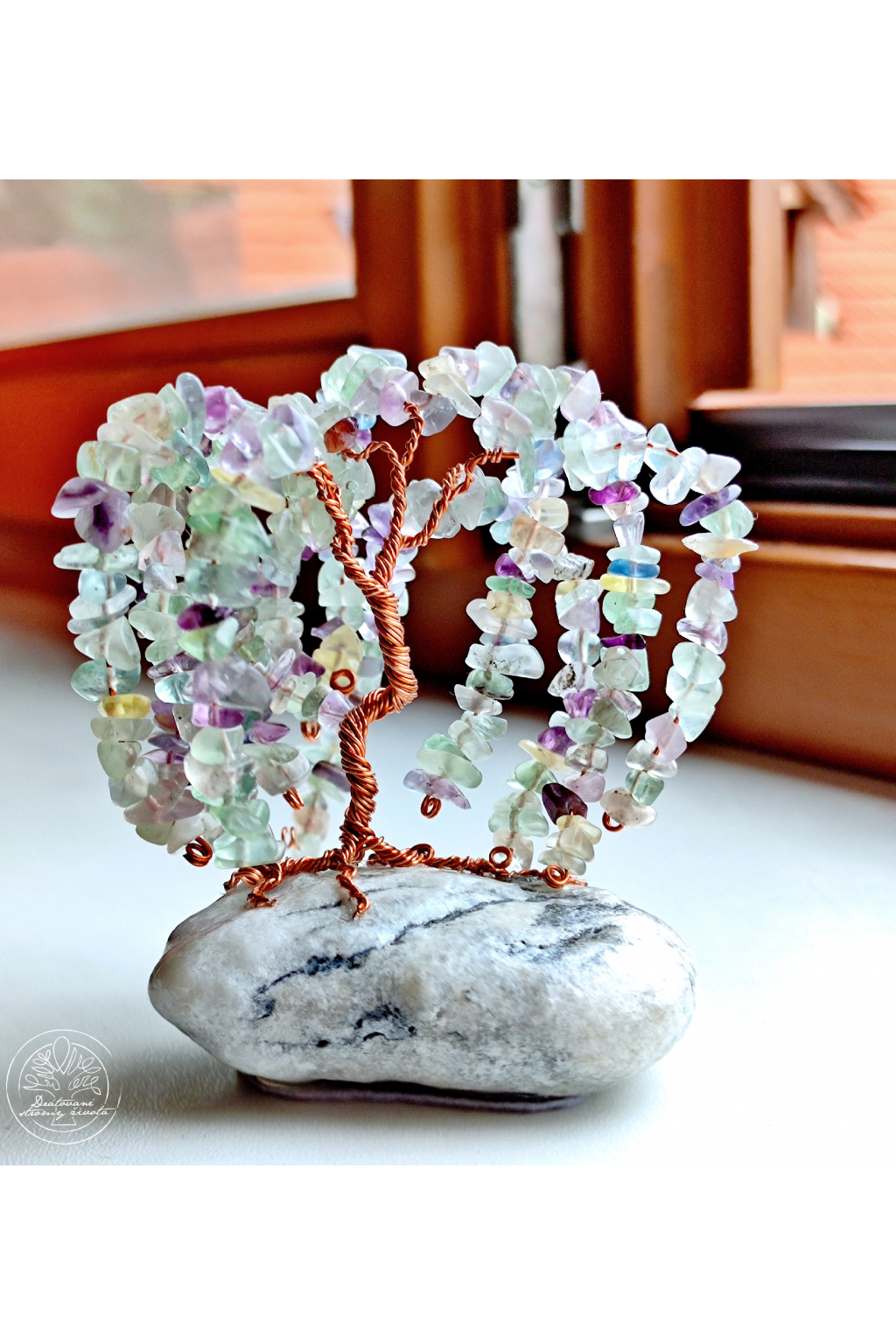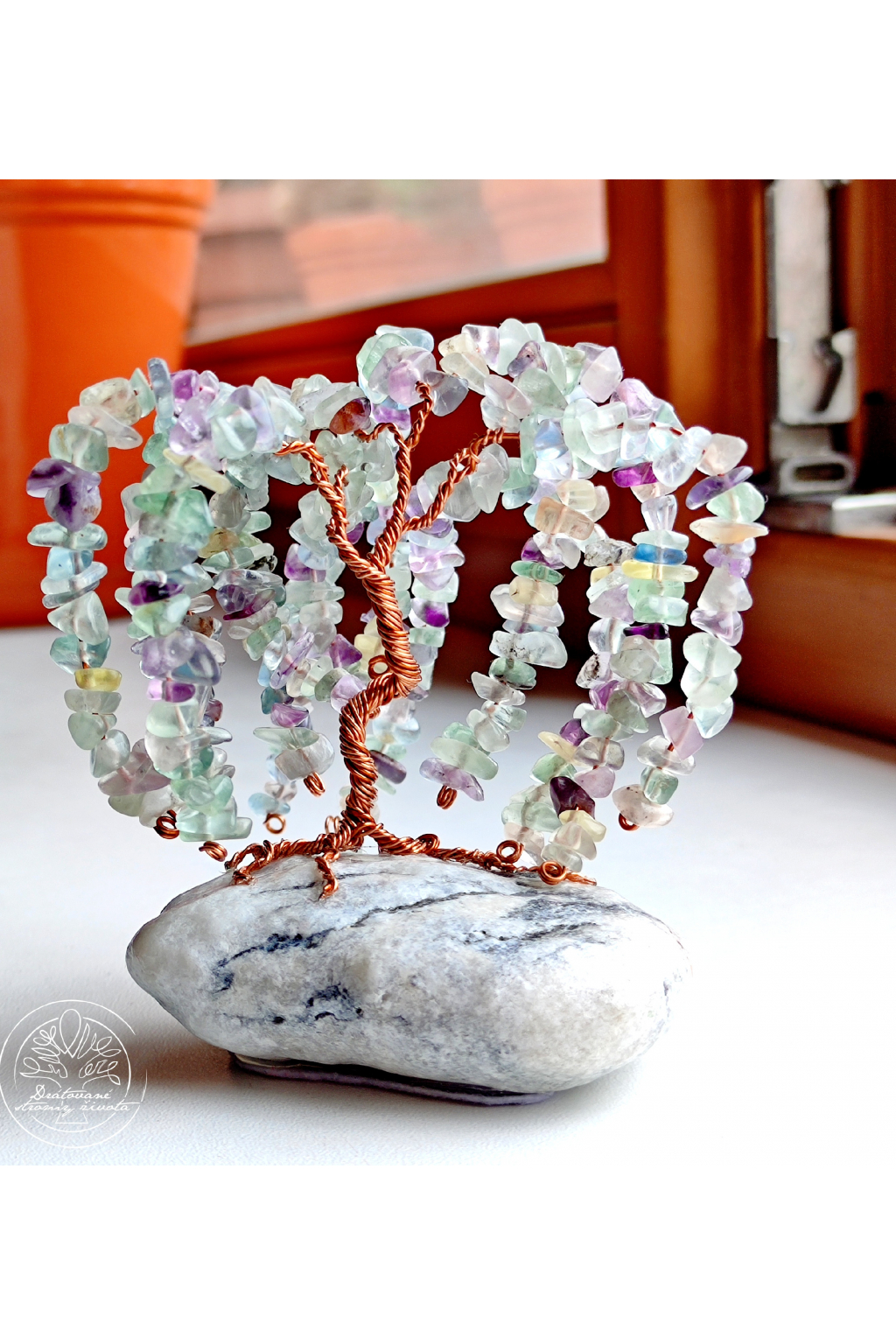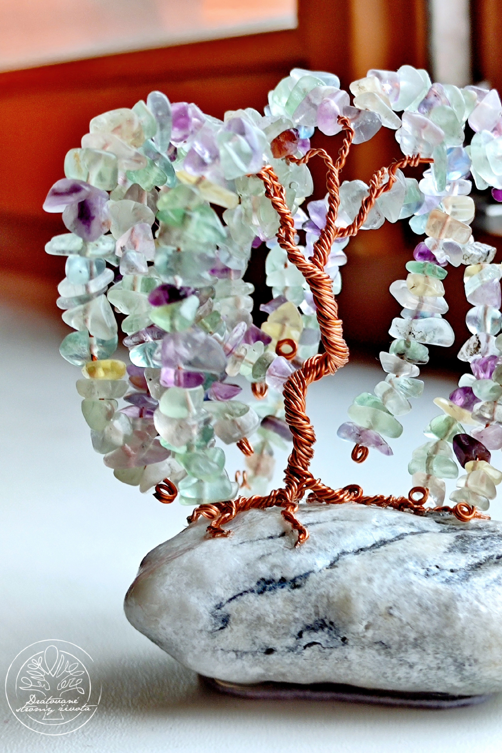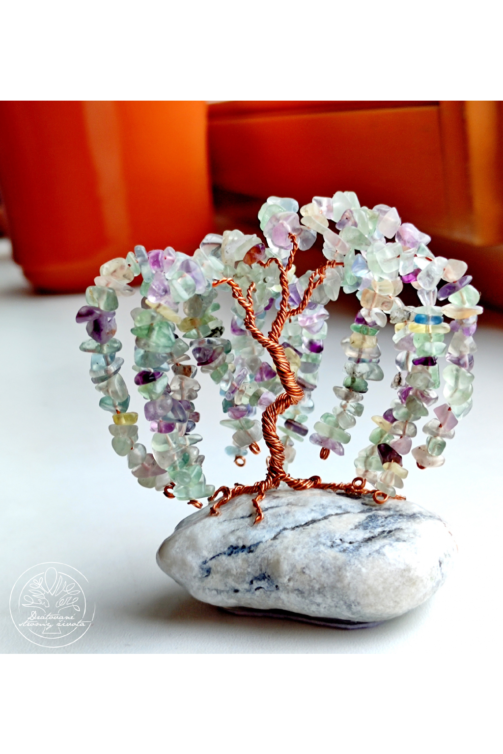 Drátovaný strom na kamínku s názvem „DÁVÁM VĚCI DO POŘÁDKU“, vyroben POUZE z polodrahokamů Fluoritu. Použit měděný drátek.