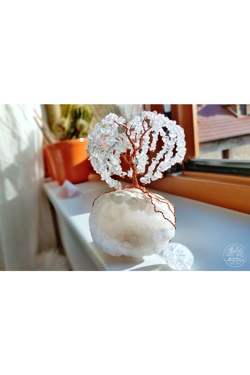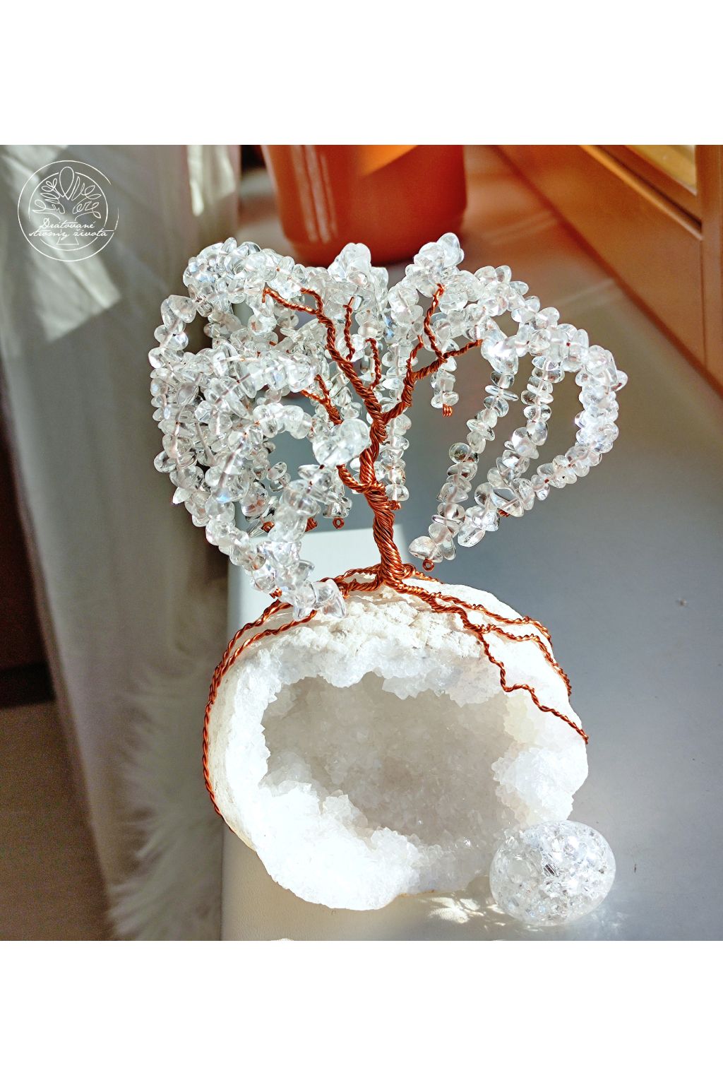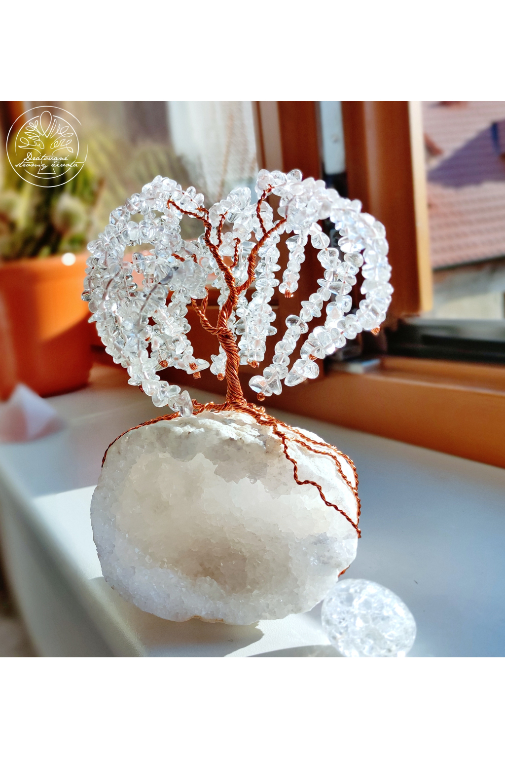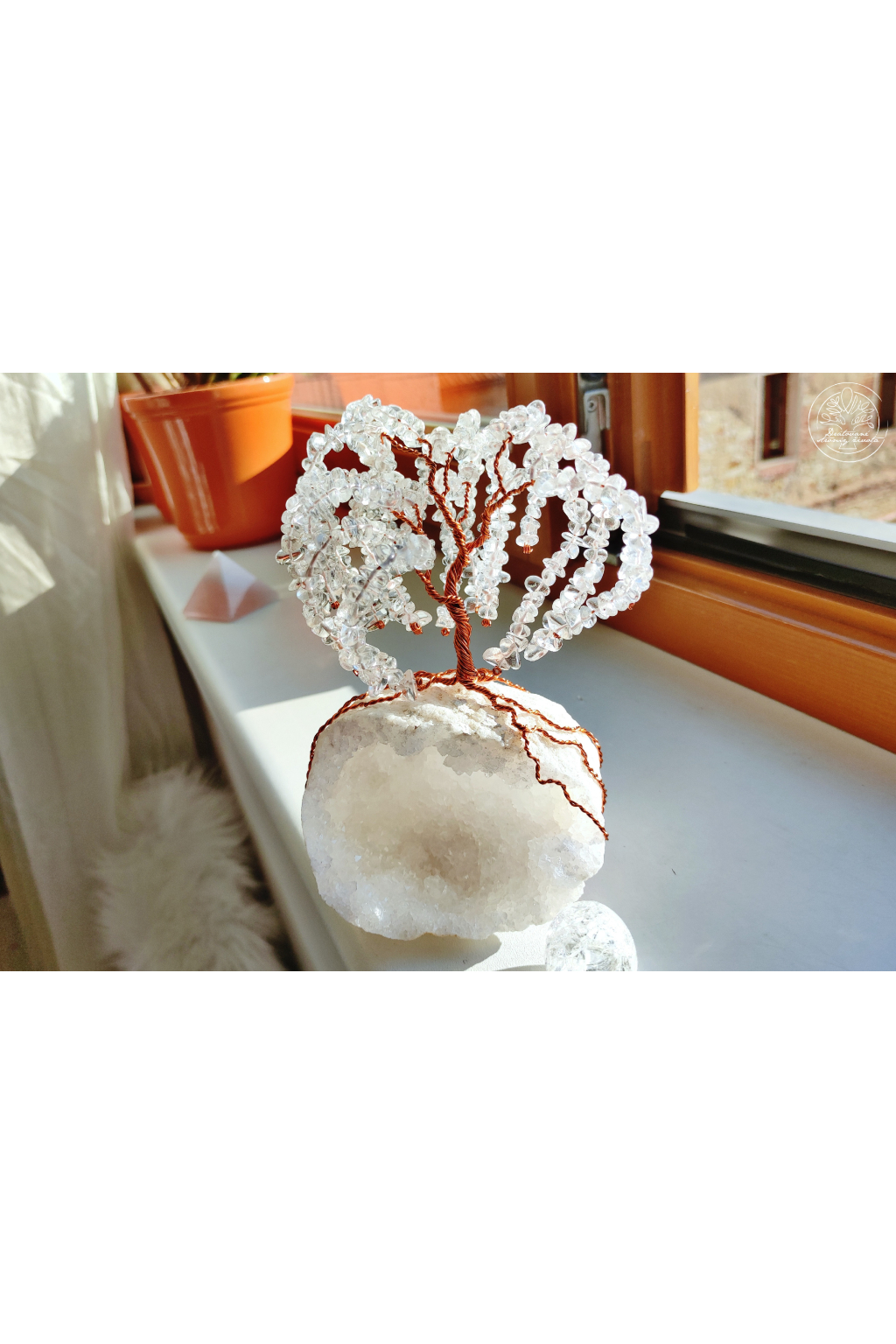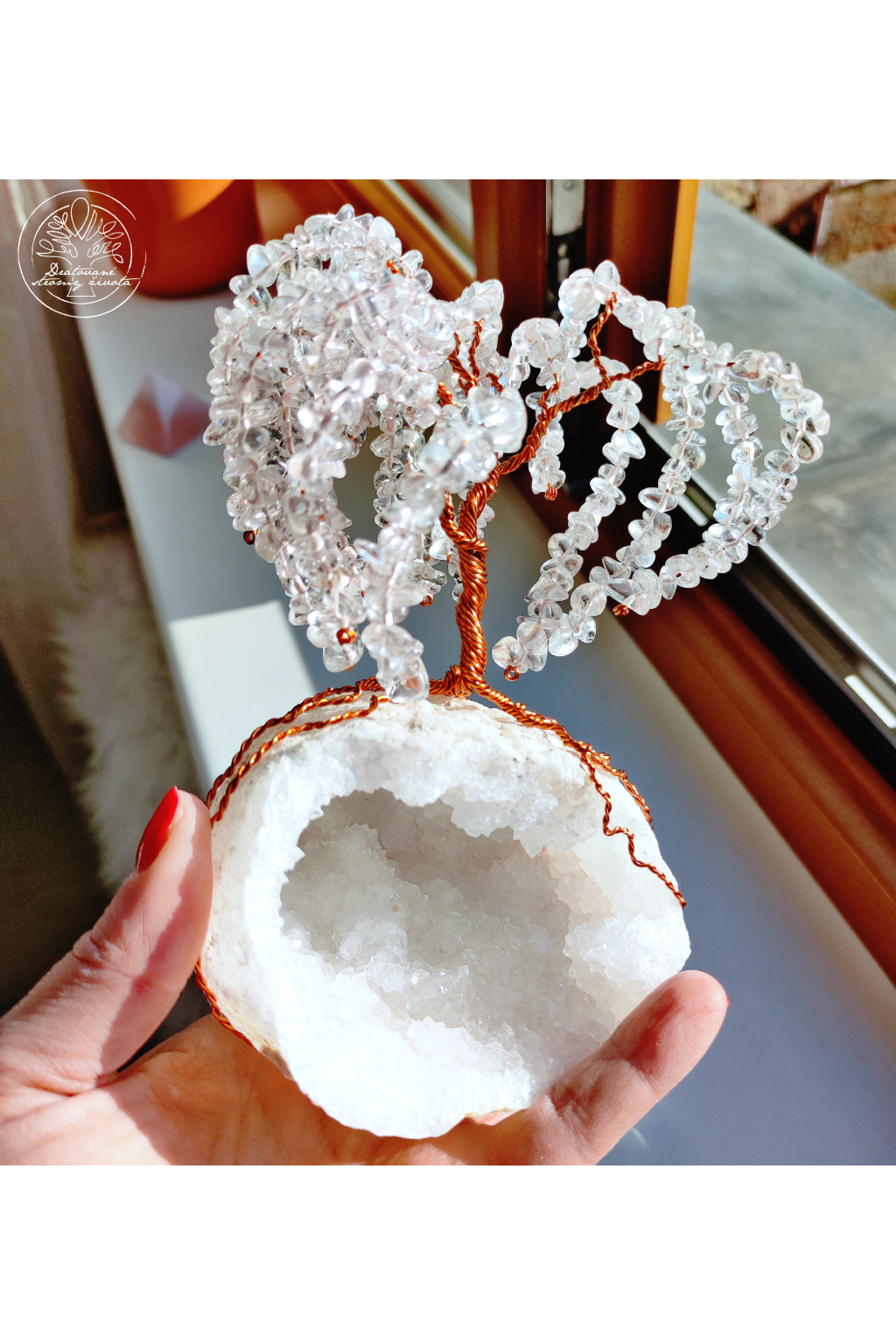 Drátovaný strom na křišťálové geodě s názvem „KŘIŠŤÁLOVÝ LÉČITEL“ 17cm, zajímavý křivý strom života, vyroben POUZE z polodrahokamů Křišťálu, posazen na kouzelnou křišťálovou geodu.