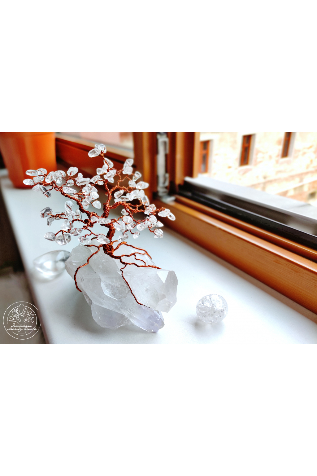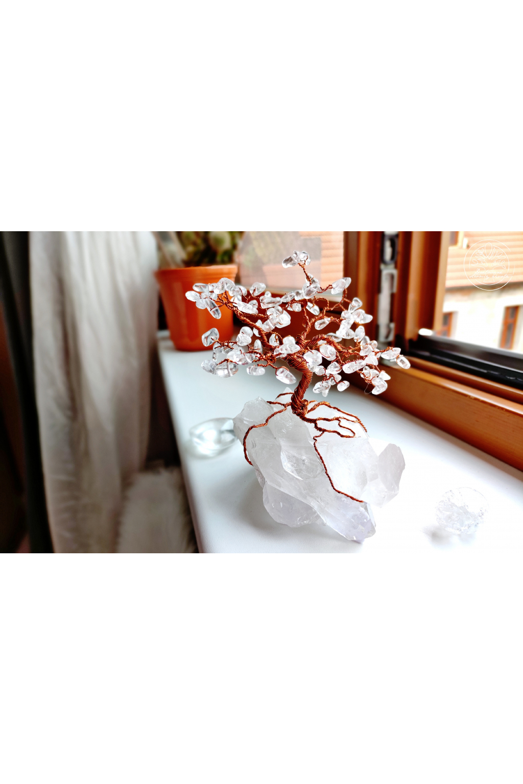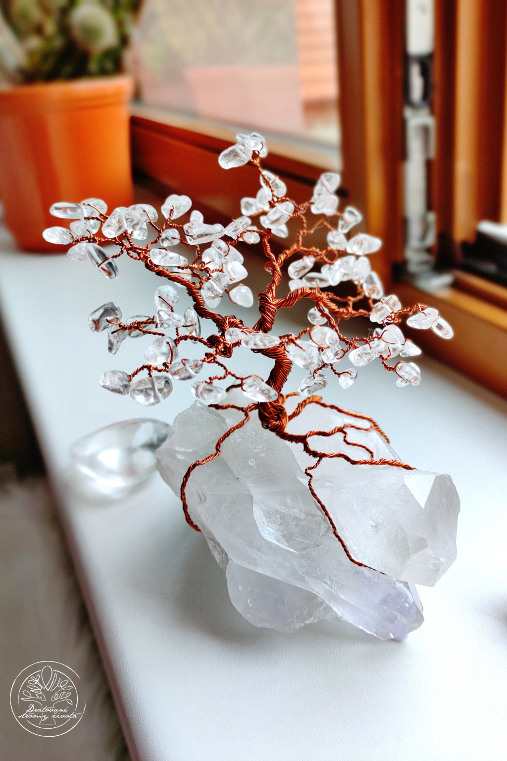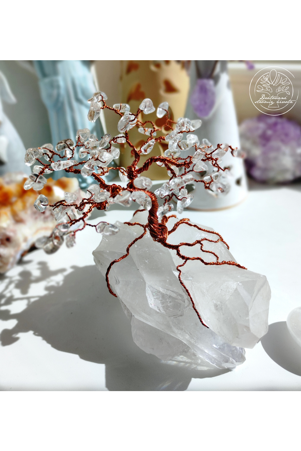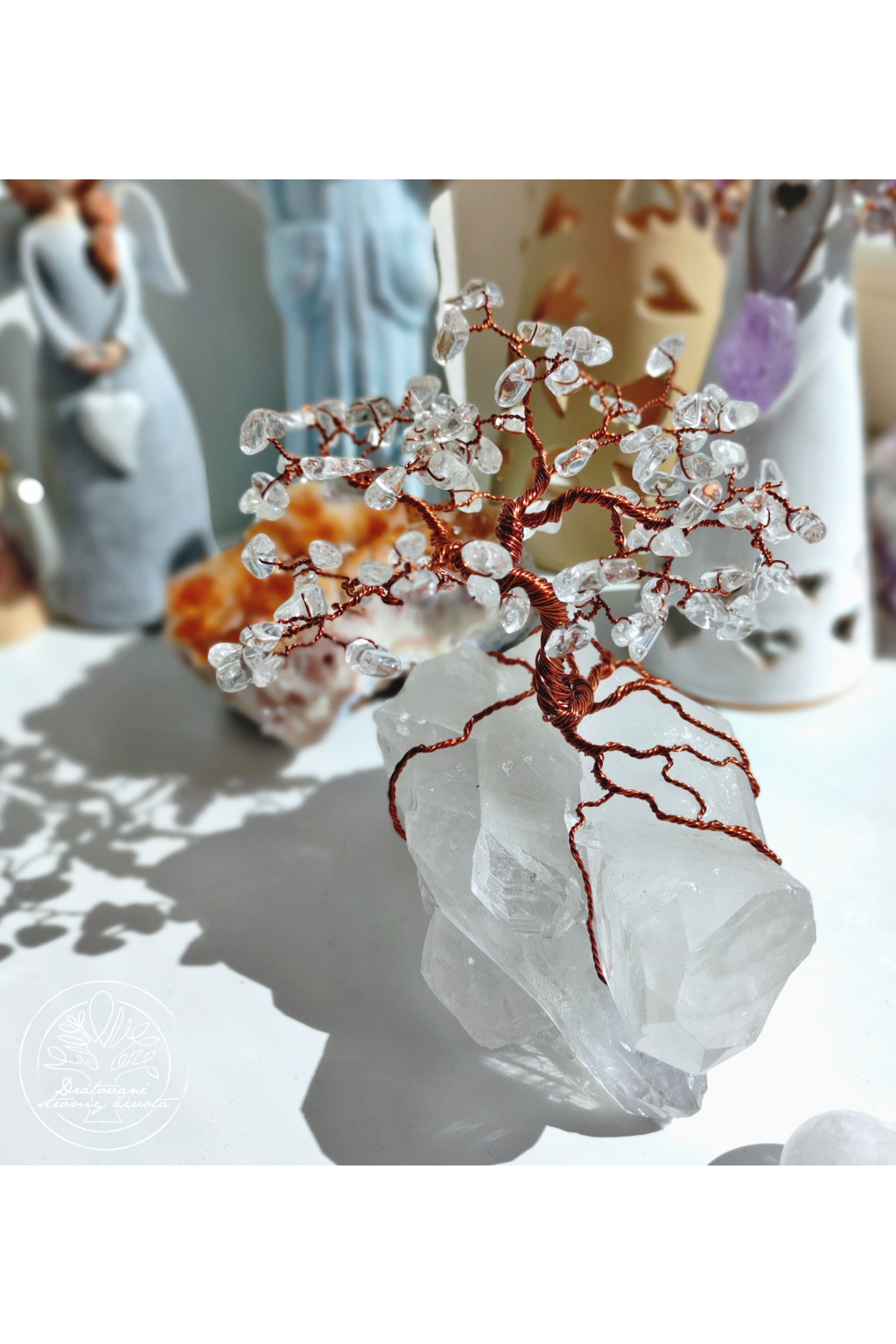 Drátovaný strom na kusu překrásné křišťálové špice s názvem „KŘIŠŤÁLOVÝ LÉČITEL Jablůňka“ 16cm, zajímavý milý strom života, vyroben POUZE z polodrahokamů Křišťálu, posazen na křišťálovou špici v AAA kvalitě.