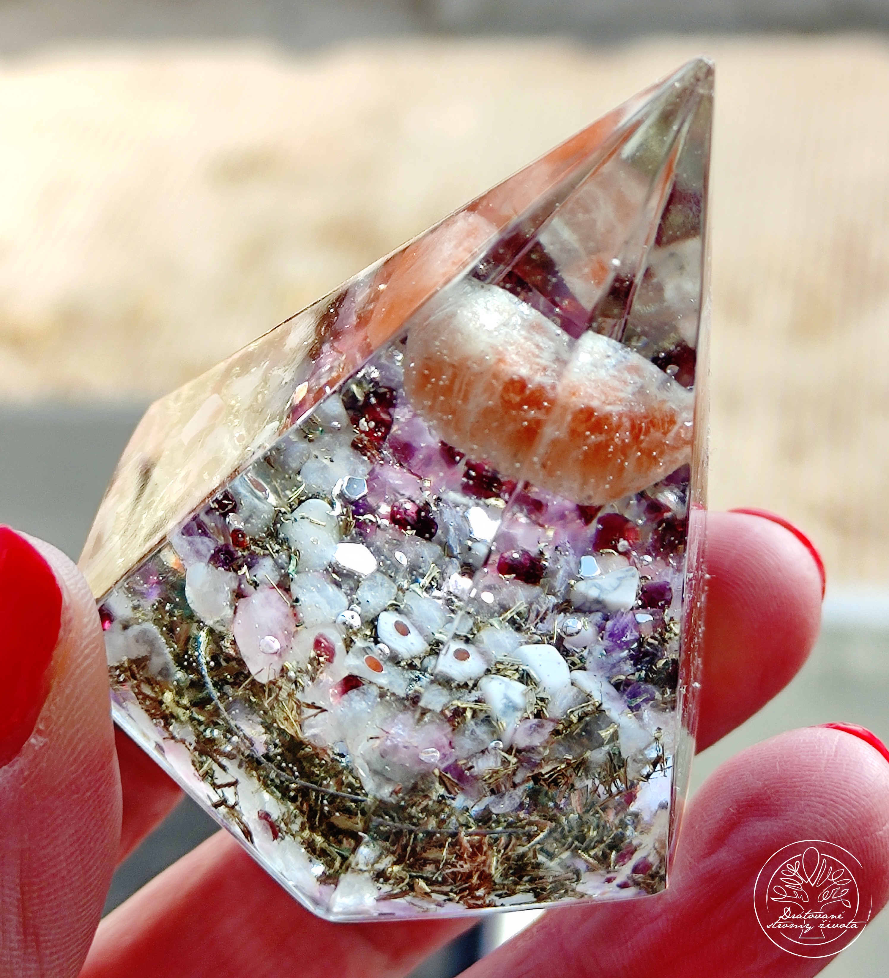 pročišťuje a transformuje příliš těžkou energii do podoby lehkých vibrací. Uzemňuje duchovní energii, čistí a vyrovnává všechny čakry a vytváří ochranný štít kolem těla.