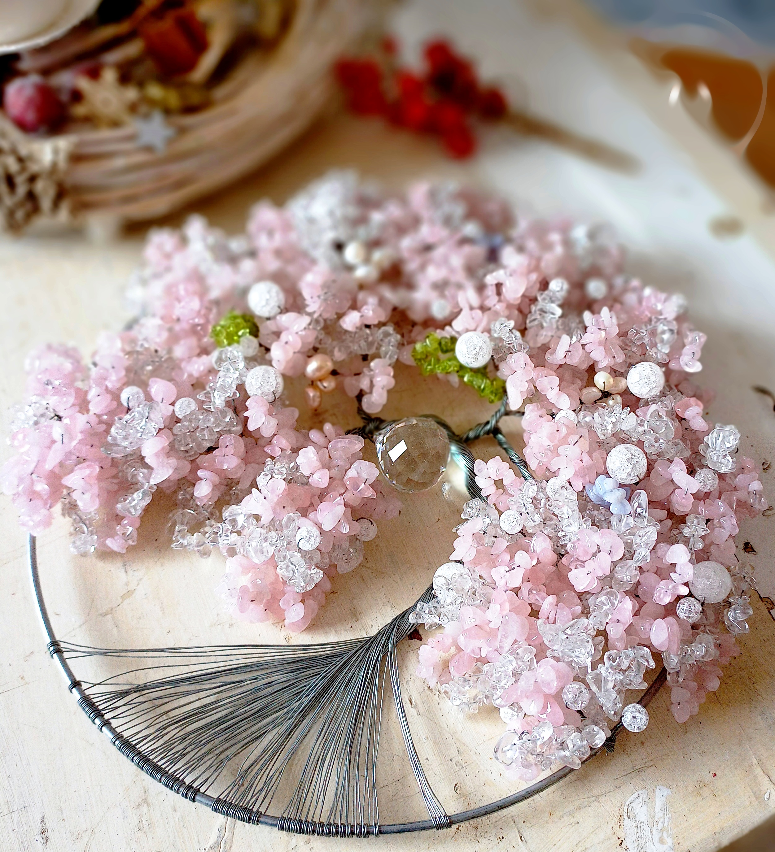 Strom v nás vzbuzuje naprostou čistotu, a to i díky velkému kusu přírodního křišťálu, jež má strom ve svém srdci a středu. Působí radostným a láskyplným dojmem s velkou porcí energie, života a žití. Růžový zebří jaspis, která nám připomíná, že není možné přijít o lásku a energii do života, i když ji odmítáme. Láska je totiž všude kolem nás! Růžový jaspis podporuje naše pozitivní vnímání lidí kolem nás a prohlubuje vhled za leckdy povrchní masku druhých - ukazuje nám skutečnou milující podstatu lidských bytostí.