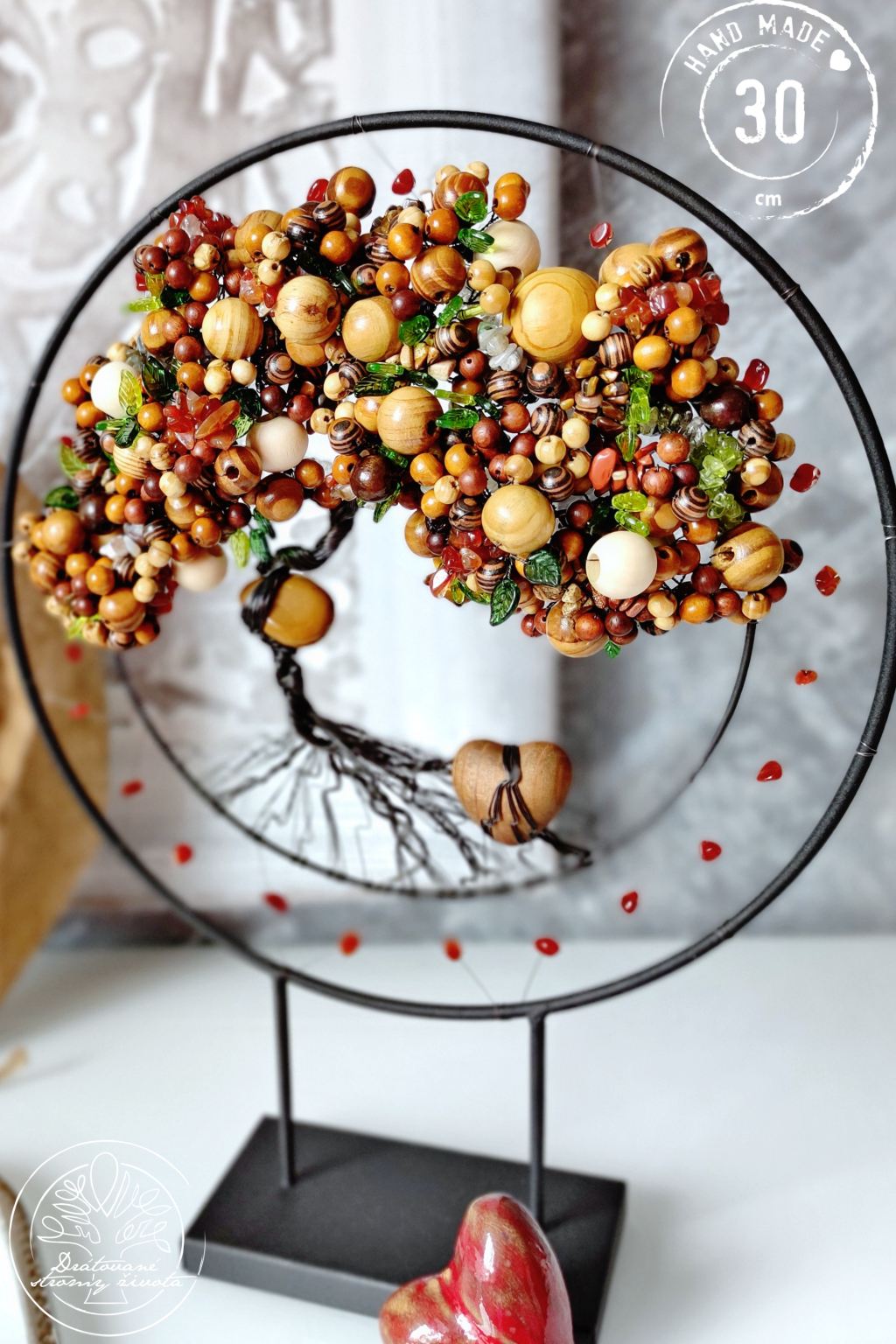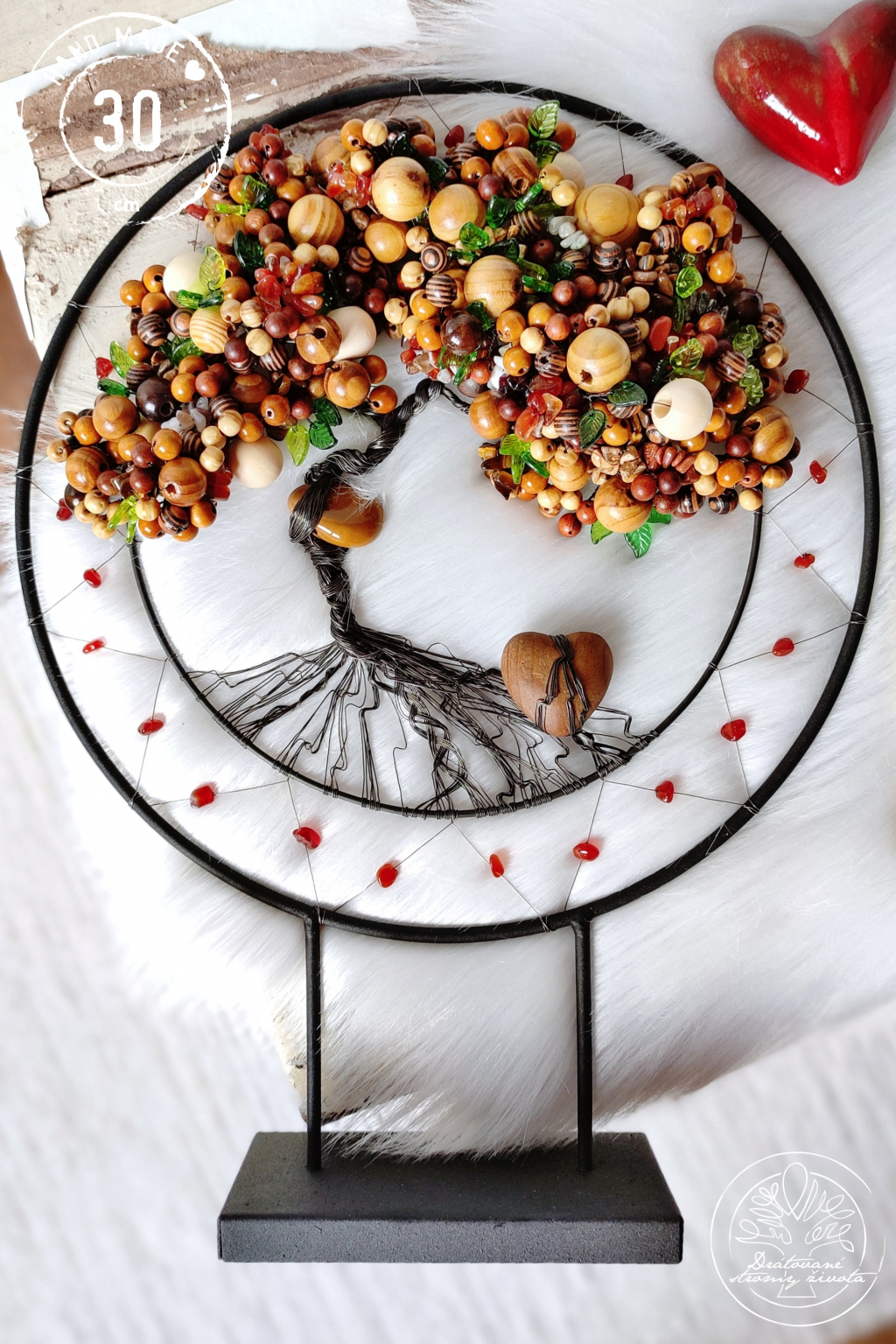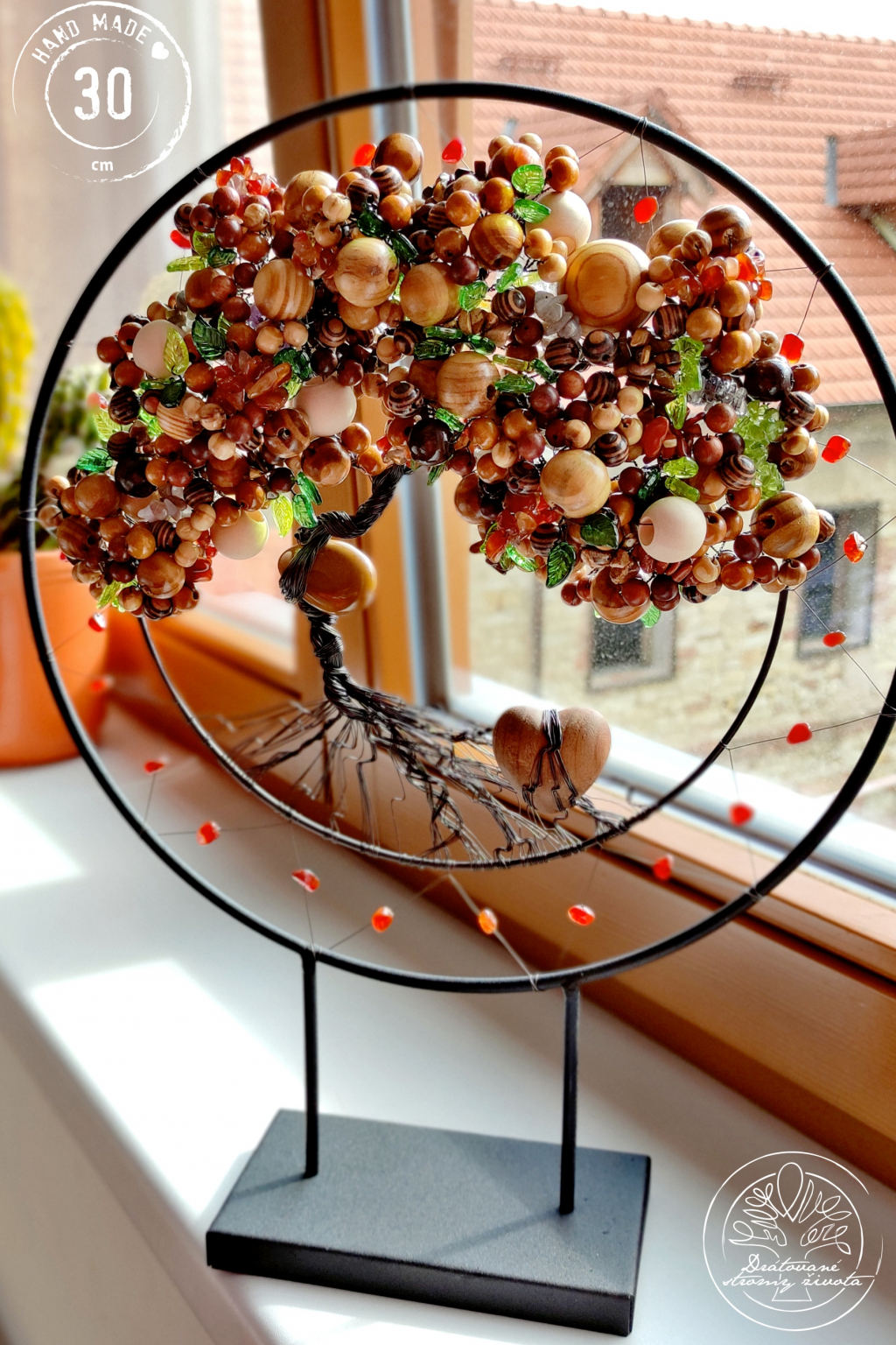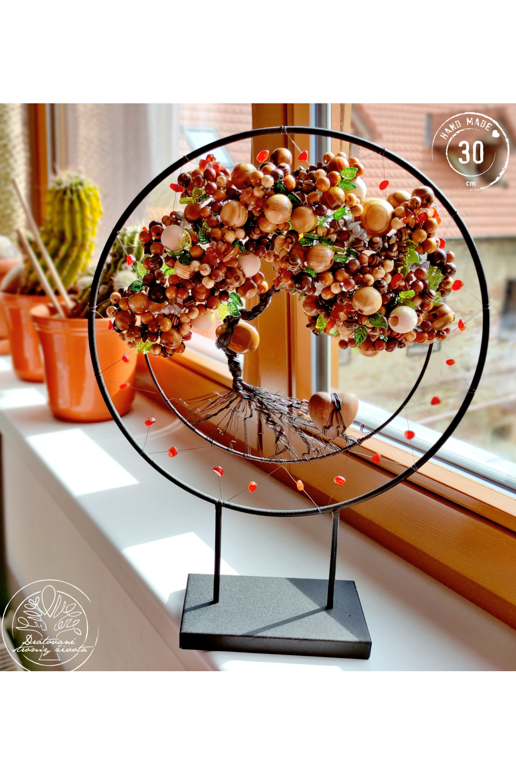 Je tak trochu jiný, než ostatní stromy. Je vsazen do černé kružnice, jež je zároveň stojánkem a strom vám tak může dělat radost na jakékoliv poličce nebo komodě. Je samostatně stojící, velmi stabilní.