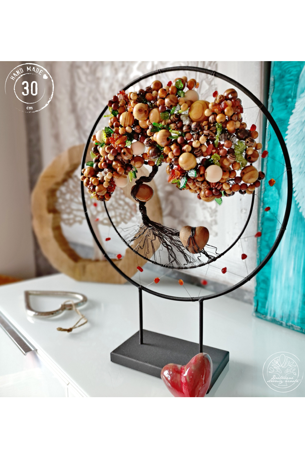 Strom života s názvem "MAGICKÁ SÍLA LESA" s krásným baculatým dřevěným srdíčkem v kořenech.