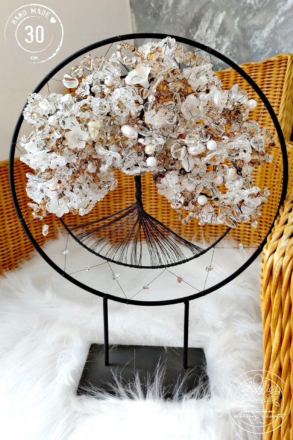 Drátovaný strom vyroben z Křišťálu a pravých říčních perel. Skleněných lístků, kytiček a korálků. Strom, jež je p z průhledných transparentních čirých komponentů, propojených s transparentní zlatou a světle hnědou.