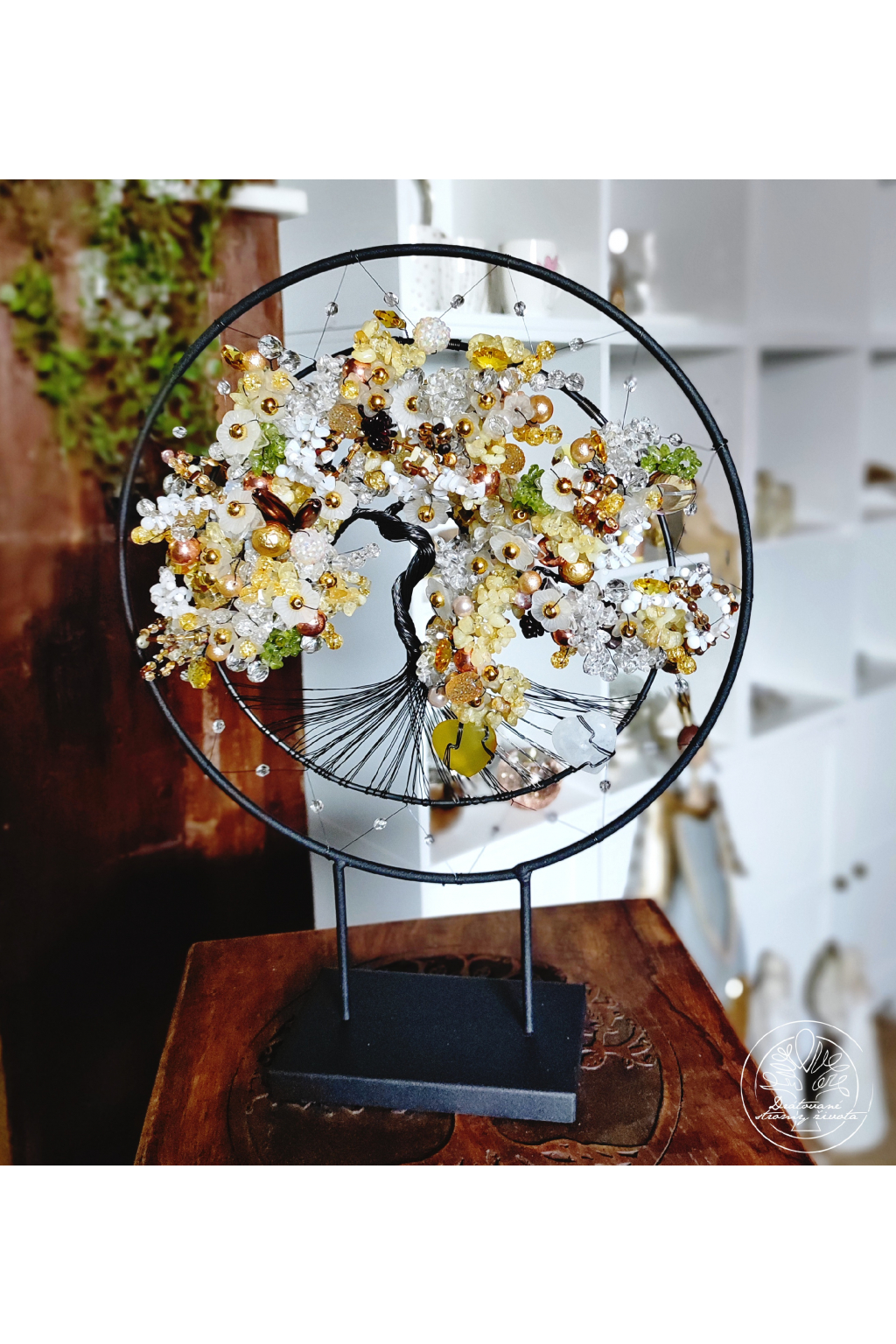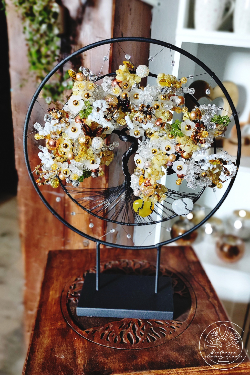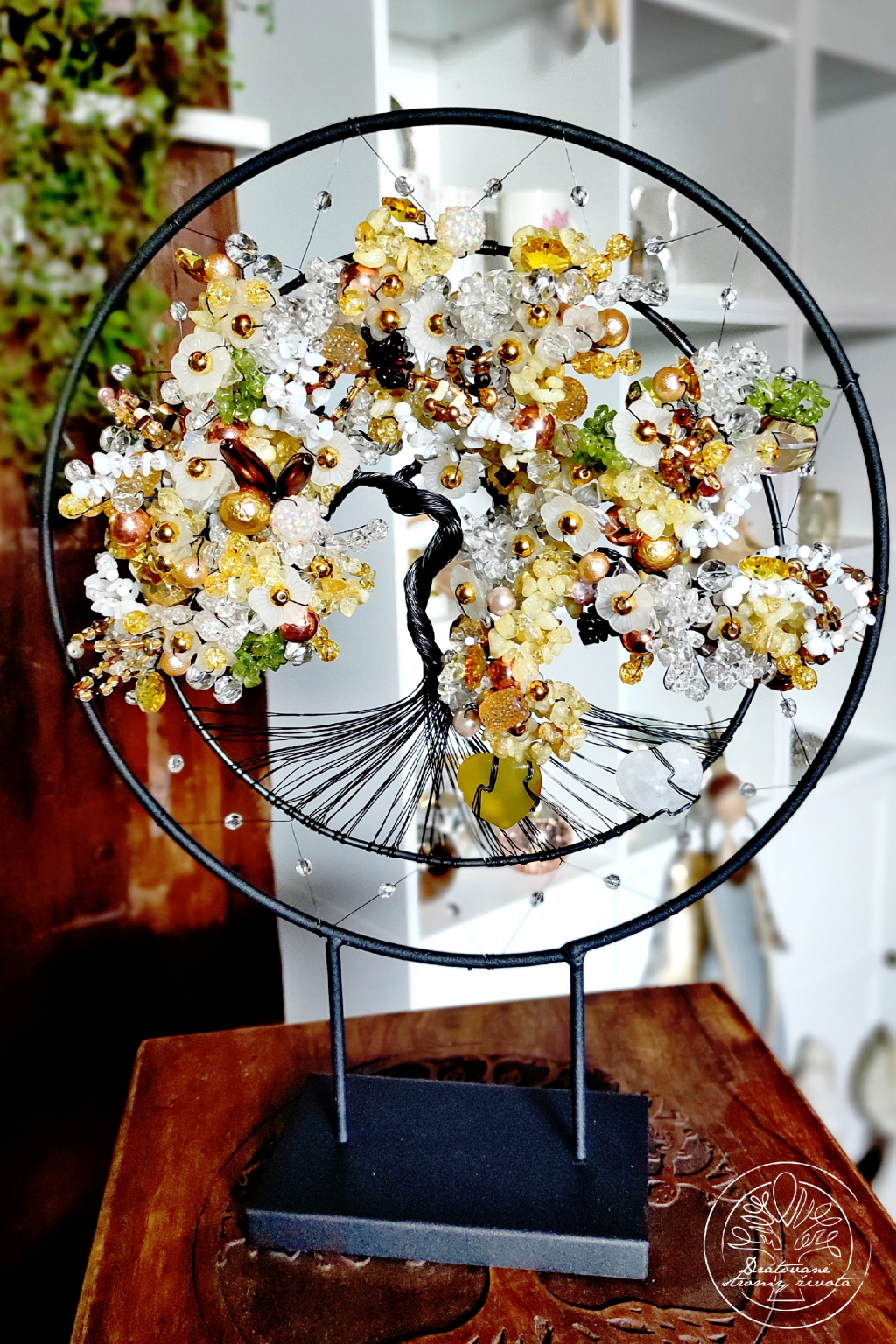 Drátovaný strom života s názvem "Změním Tvůj svět", vyrobený z polodrahokamů s přidanými korálky a je tak trochu jiný, než ostatní stromy. Je vsazen do černé kružnice, jež je zároveň stojánkem a strom vám tak může dělat radost na jakékoliv poličce nebo komodě. Je samostatně stojící, velmi stabilní.