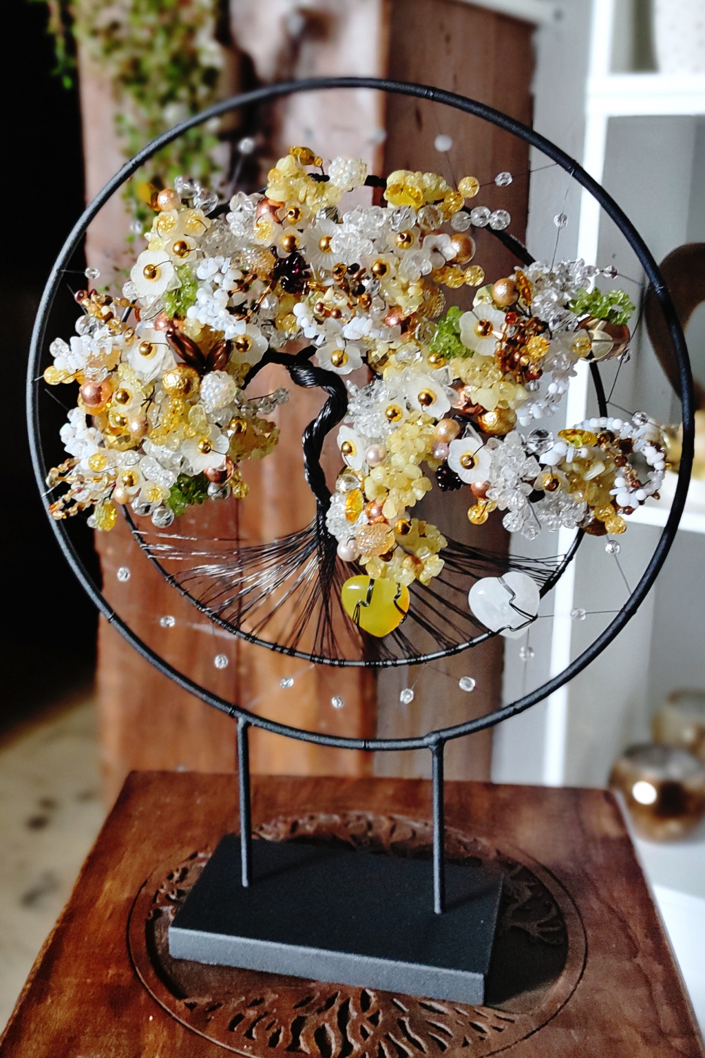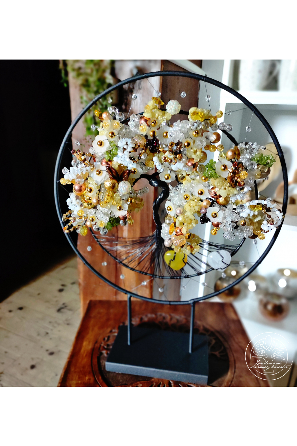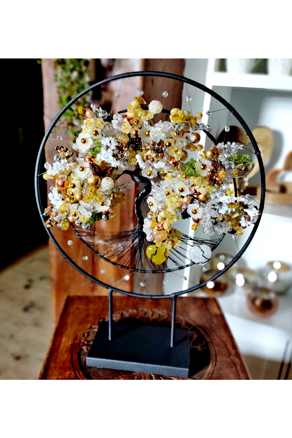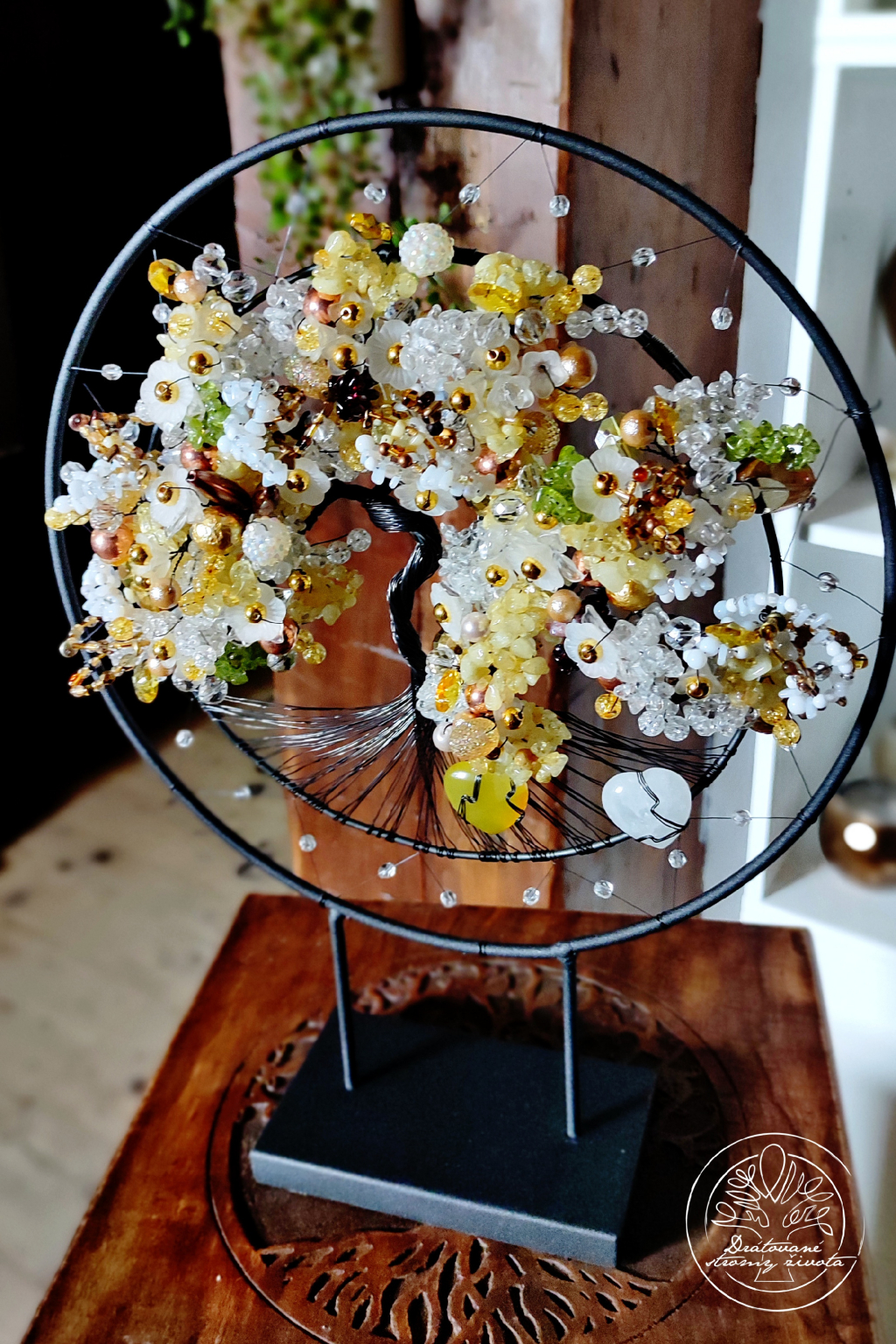 Drátovaný strom života s názvem "Změním Tvůj svět", vyrobený z polodrahokamů s přidanými korálky a je tak trochu jiný, než ostatní stromy. Je vsazen do černé kružnice, jež je zároveň stojánkem a strom vám tak může dělat radost na jakékoliv poličce nebo komodě. Je samostatně stojící, velmi stabilní.