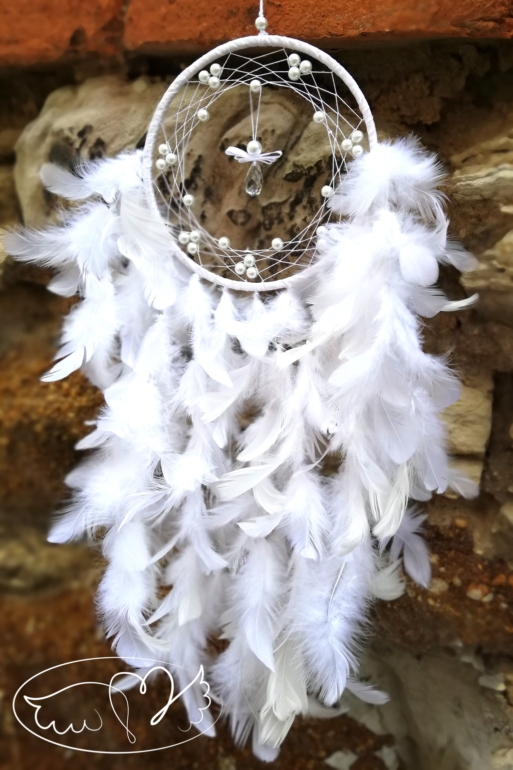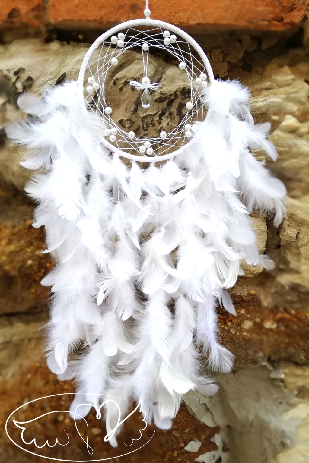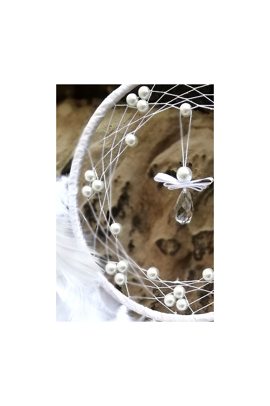 Ručně vyrobený lapač snů s křišťálovým andělíčkem ve svém středu. Kruh lapače zdobí bílé napletené perličky.