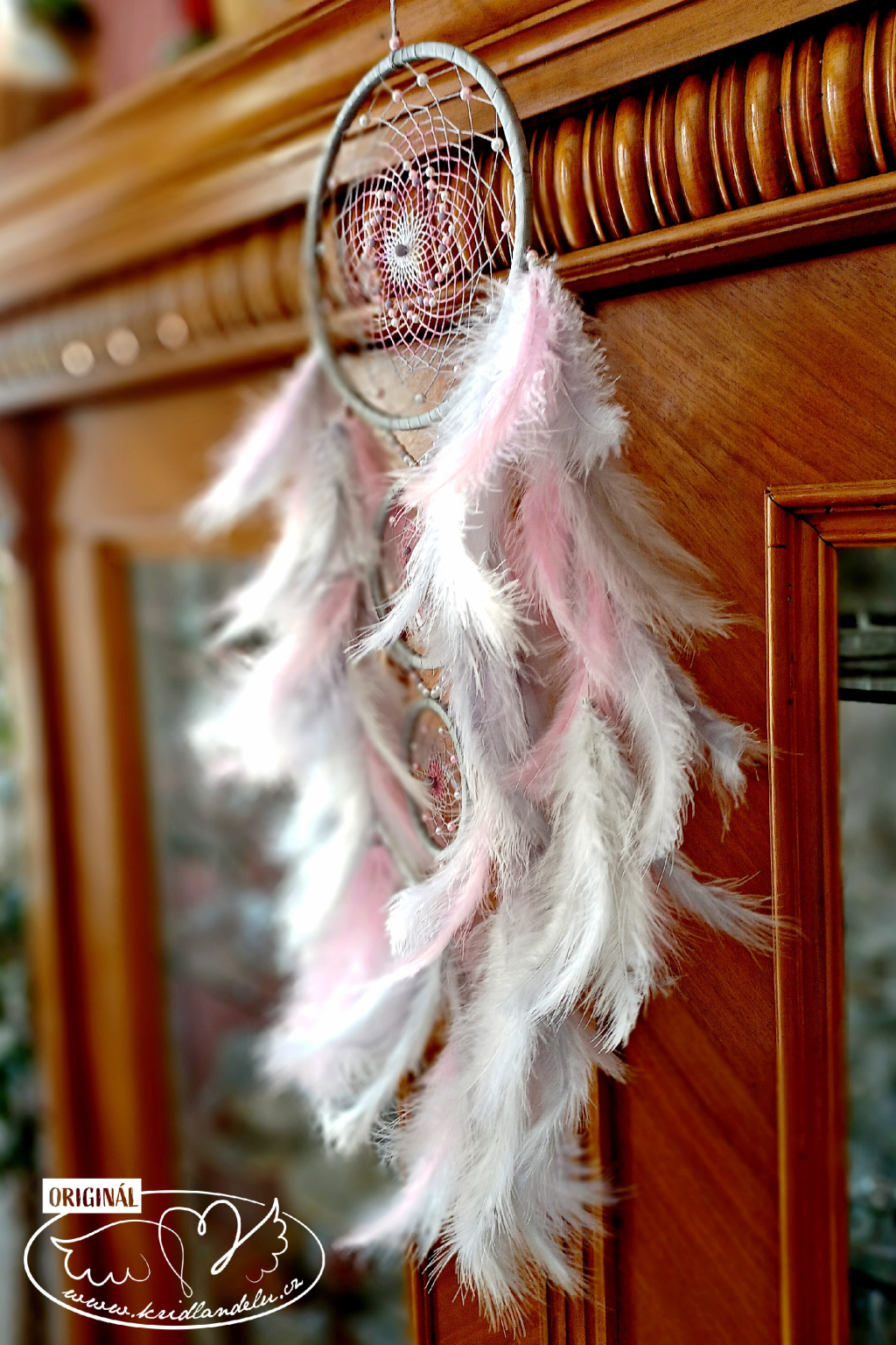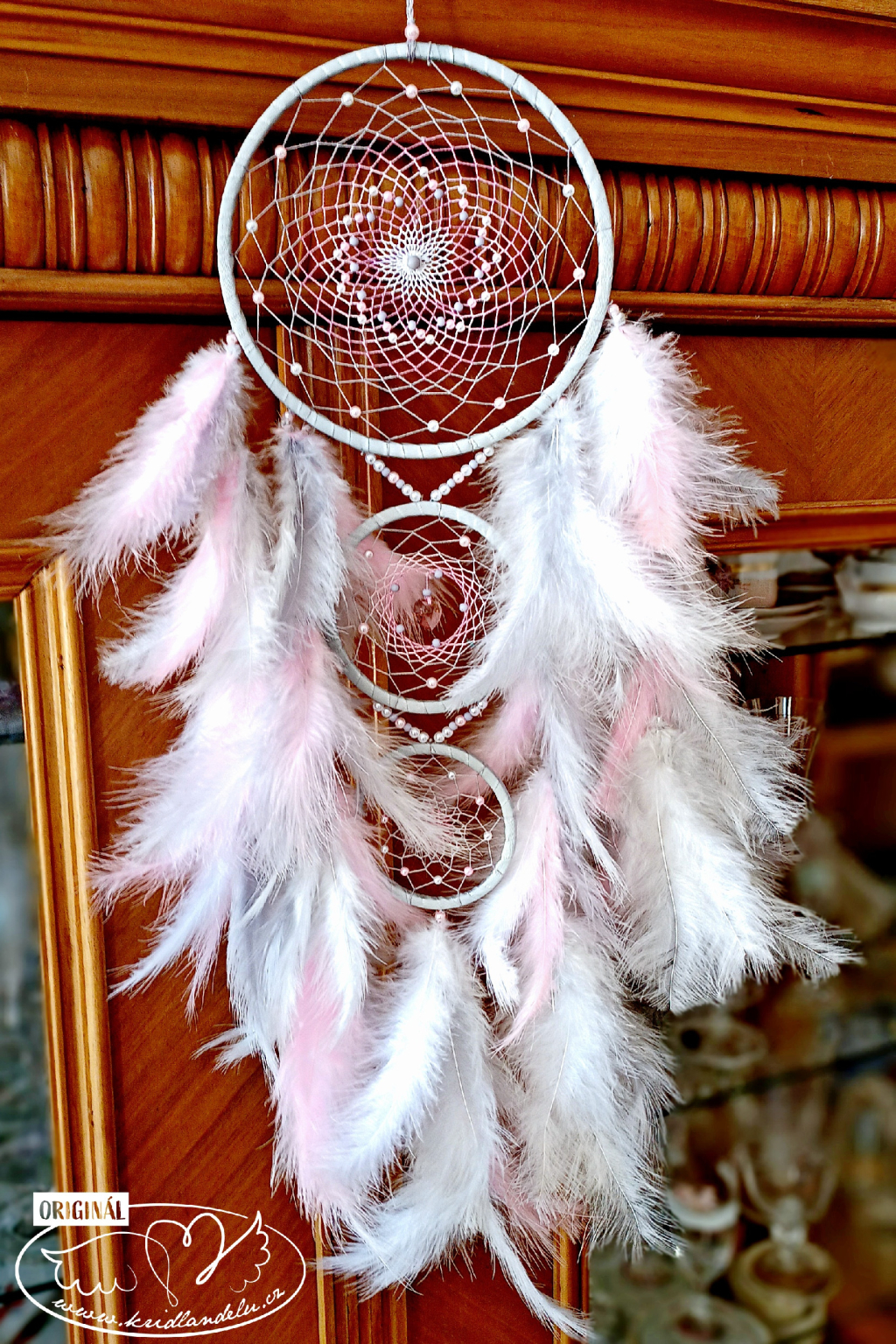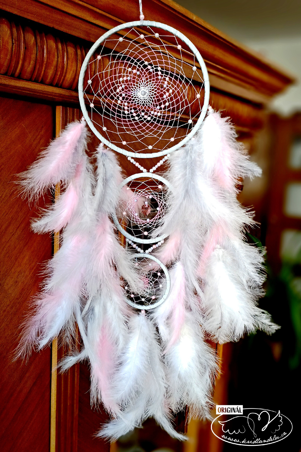 Ručně vyrobený lapač snů s křišťálovým andělíčkem ve svém středu. Kruh lapače zdobí bílé, šedé a růžové napletené perličky.