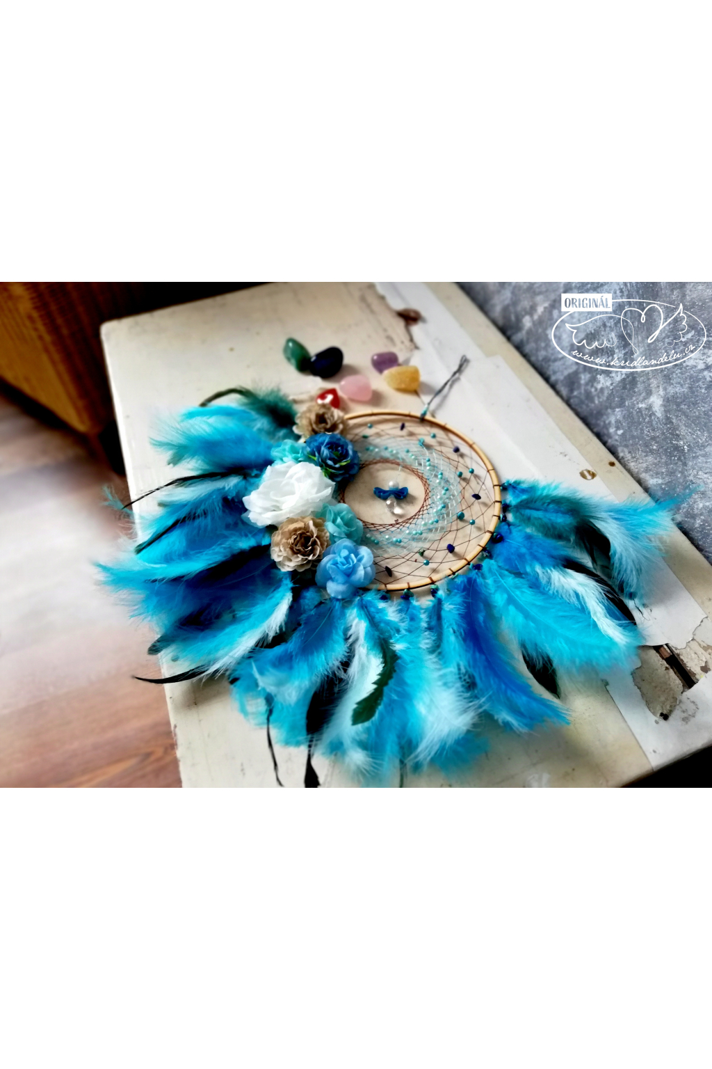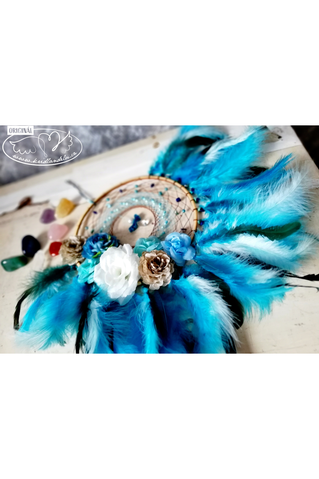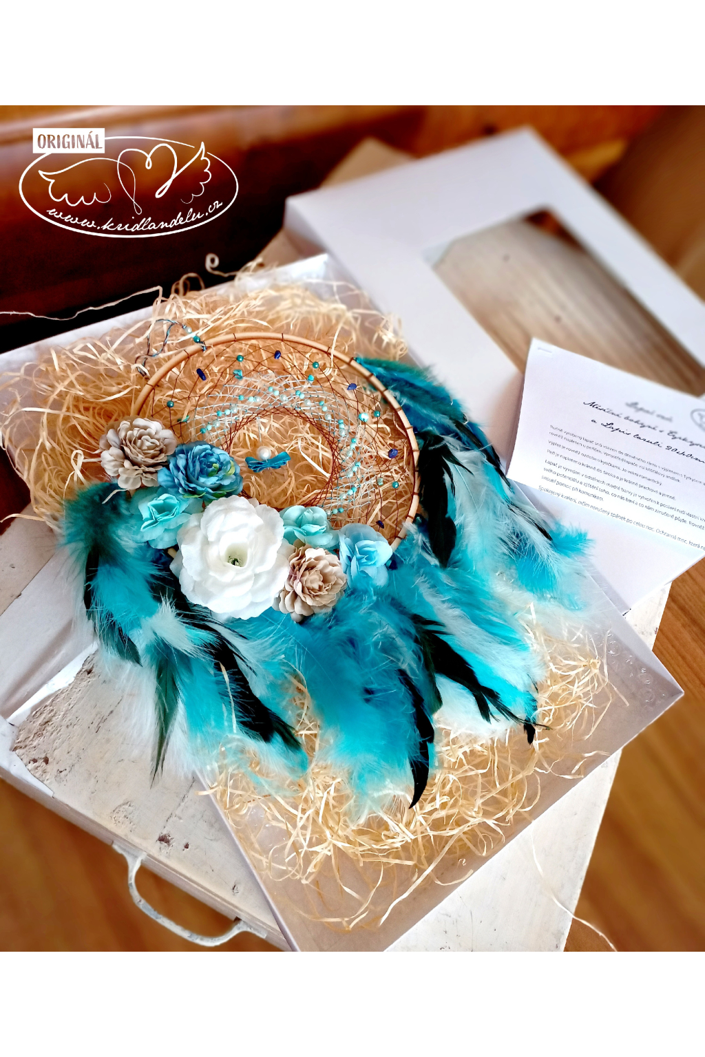 Ručně vyrobený lapač snů vsazen do dřevěného rámu s výpletem s Tyrkysem a Lapis lazuli, který je rovněž napleten u peříček. Vprostřed lapače visí křišťálový andílek.