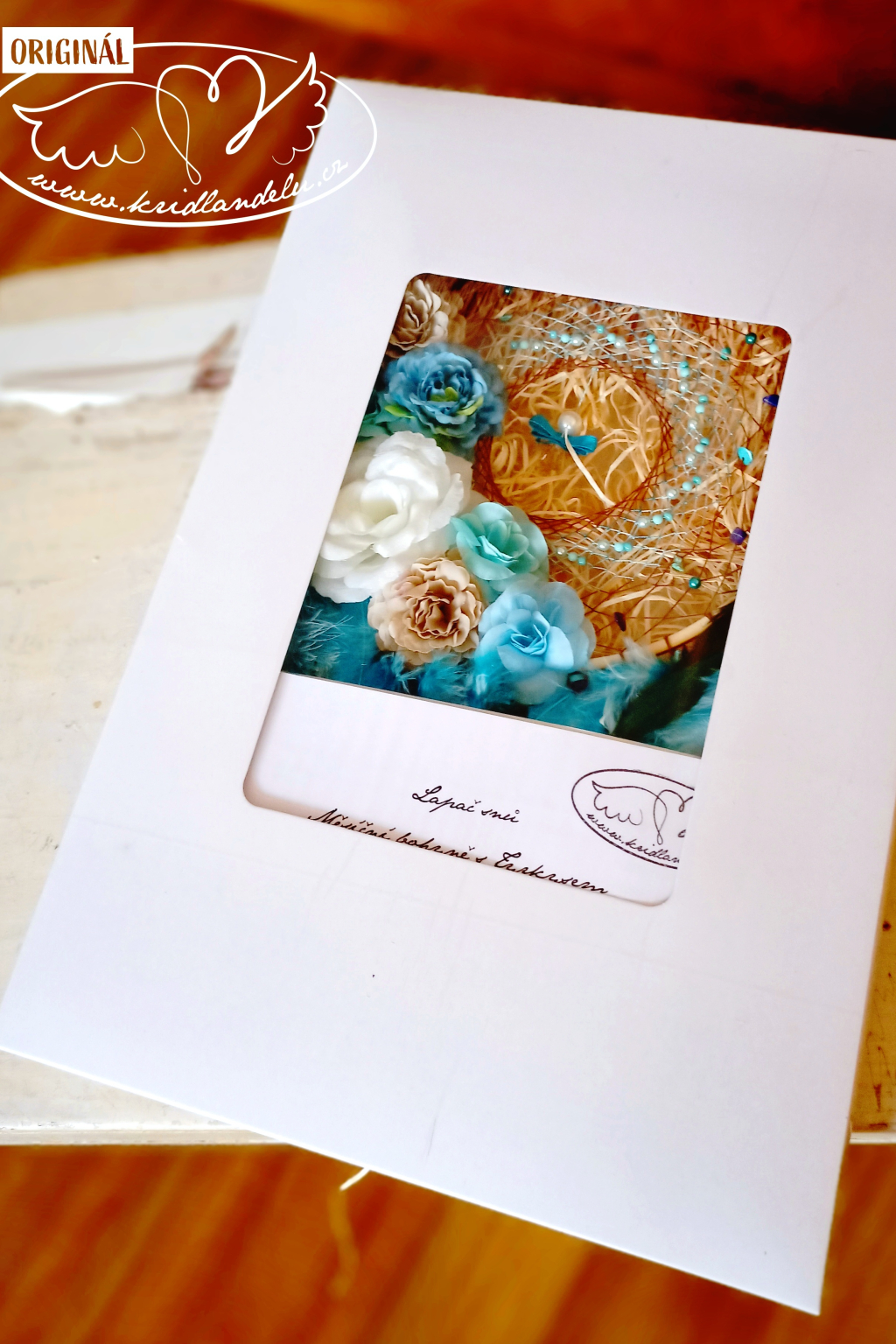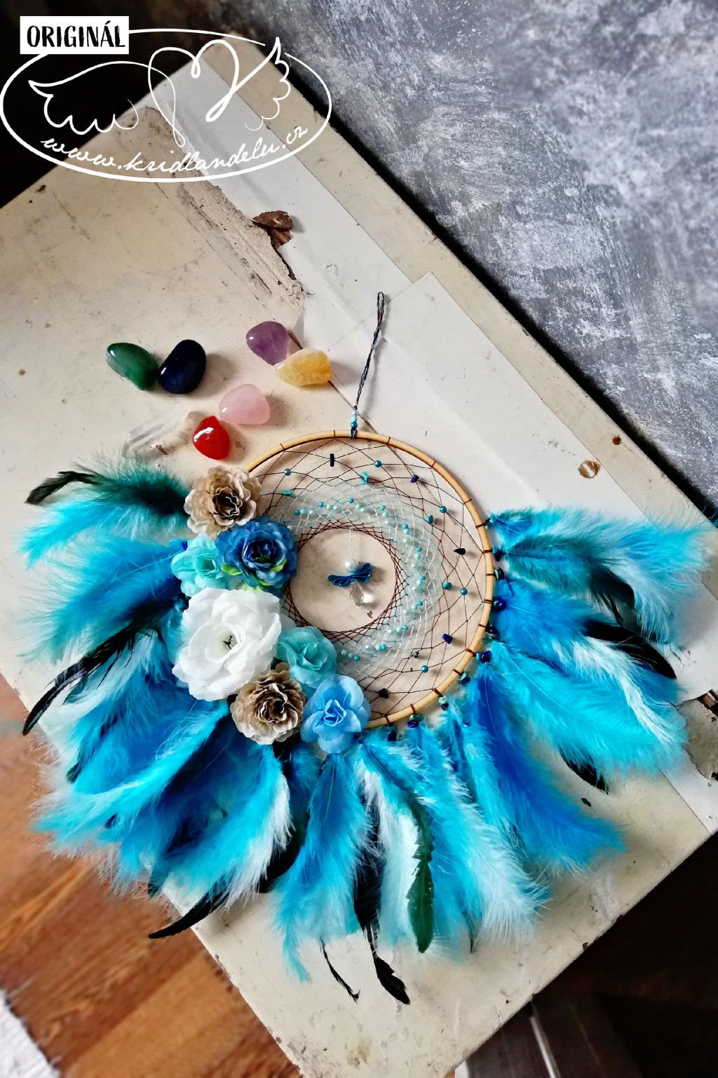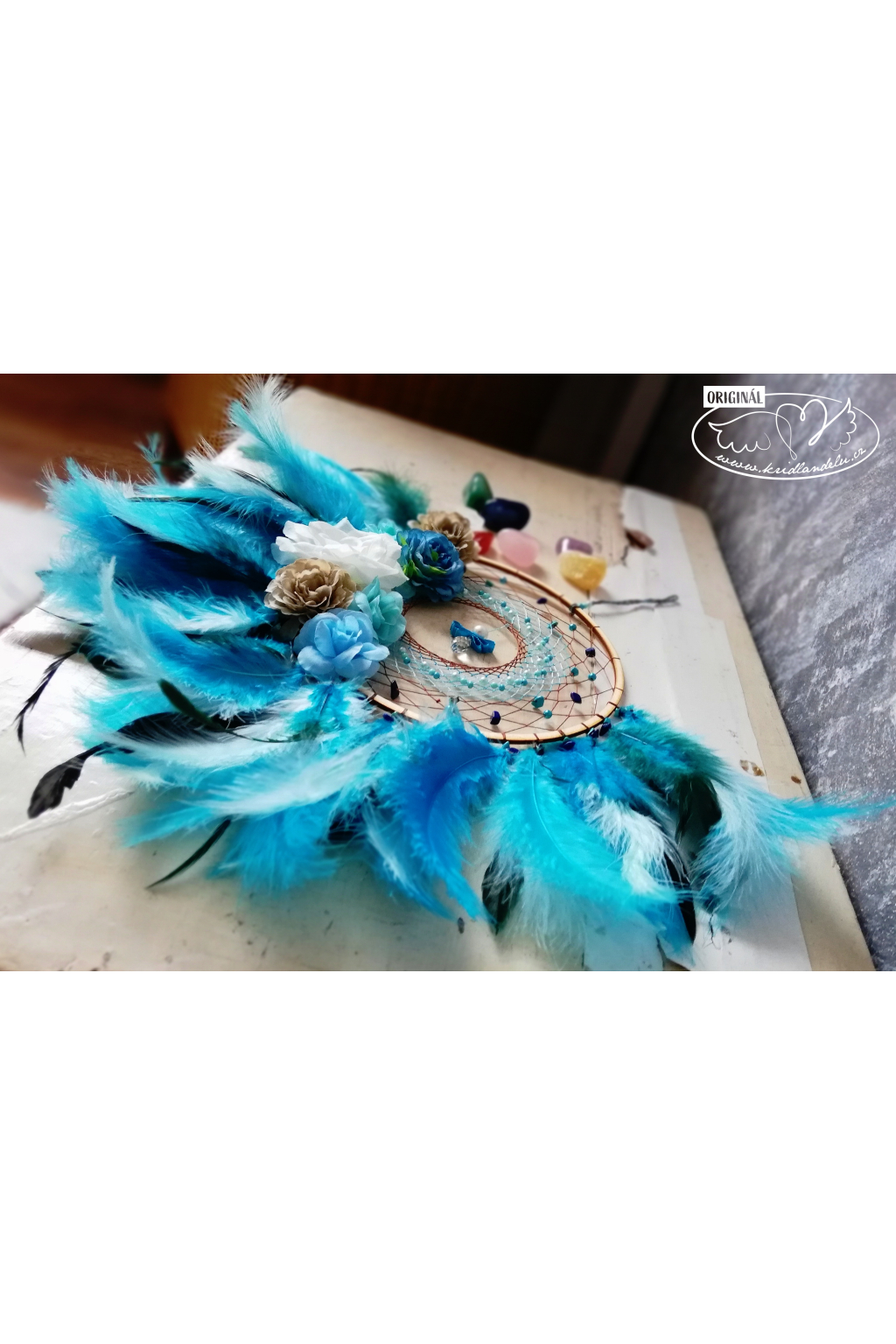 Ručně vyrobený lapač snů vsazen do dřevěného rámu s výpletem s Tyrkysem a Lapis lazuli, který je rovněž napleten u peříček. Vprostřed lapače visí křišťálový andílek.