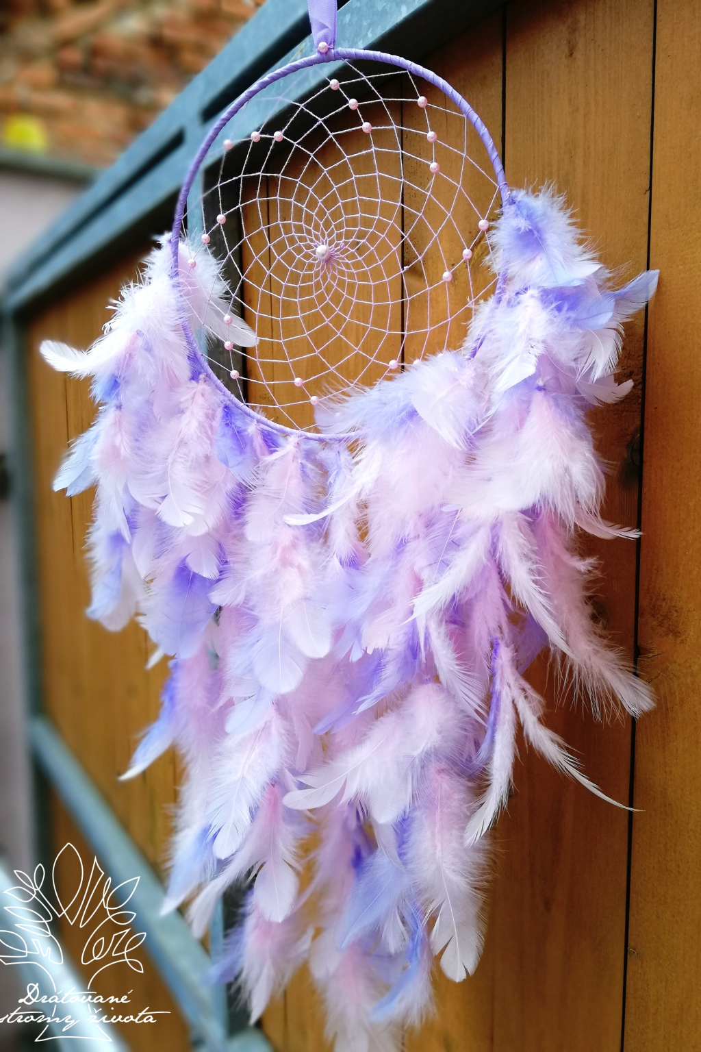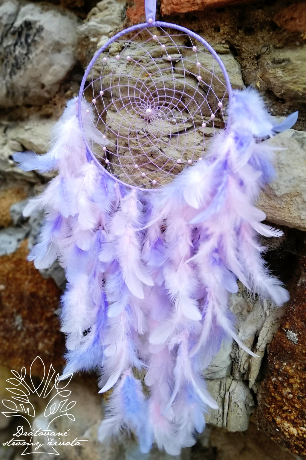 Ručně vyrobený lapač snů s výpletem s růžovými perličkami. Peří je velmi bohaté a je hustě napleteno.