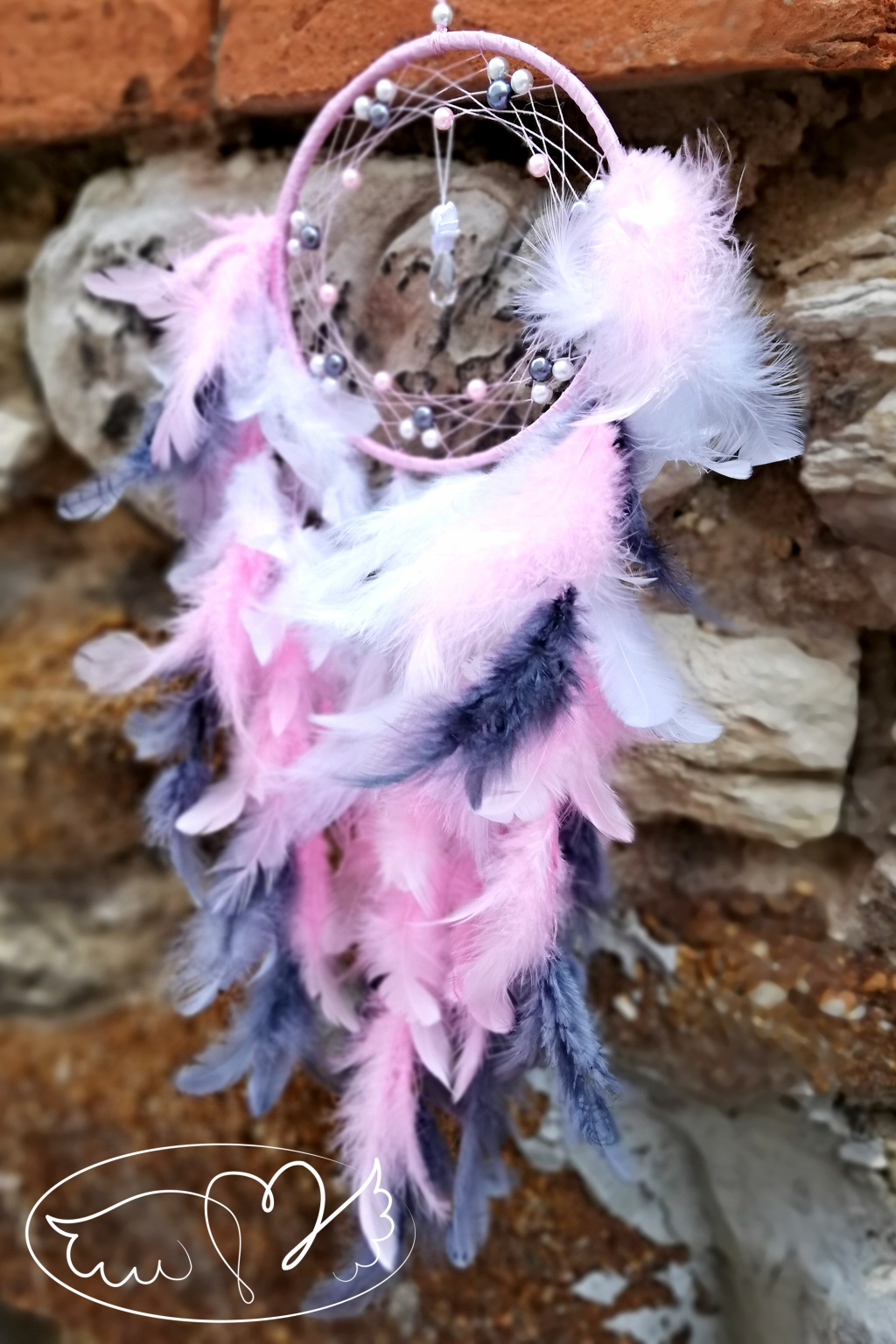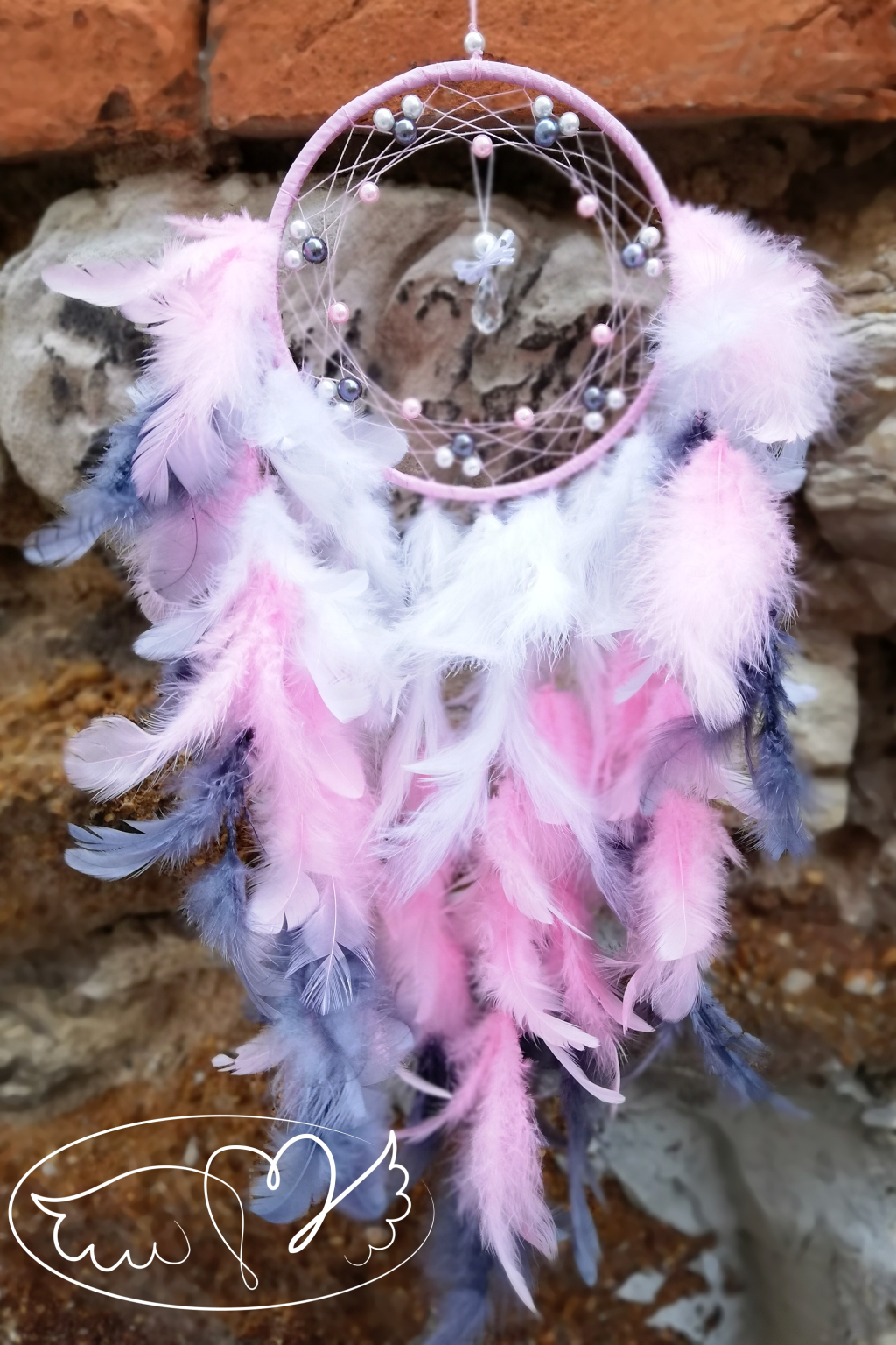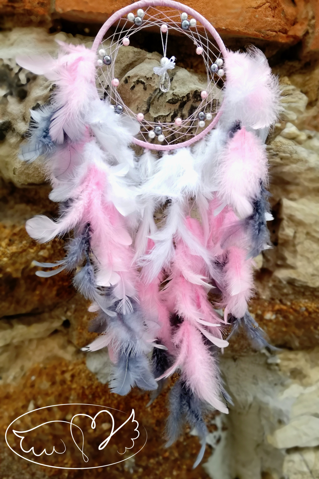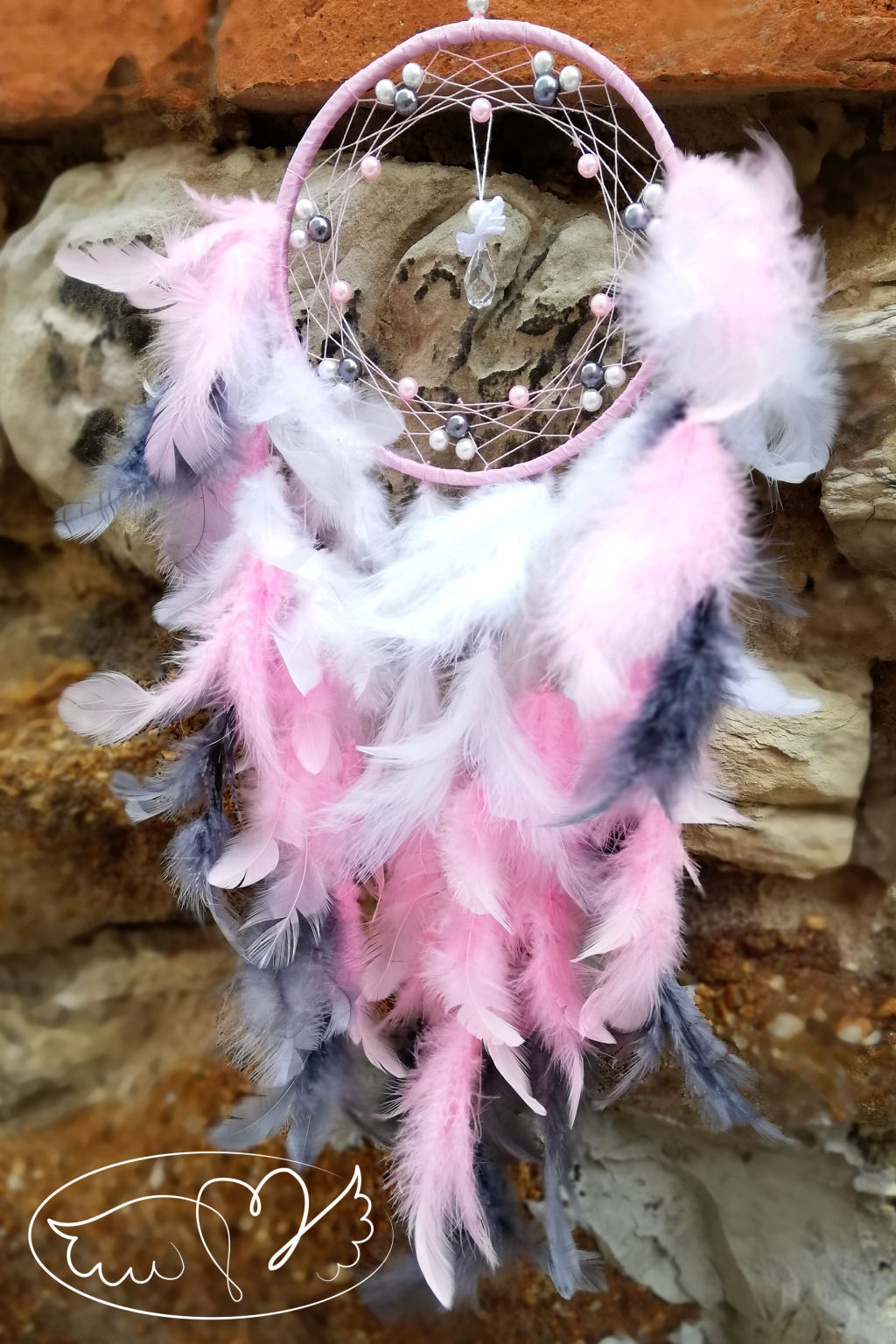Ručně vyrobený lapač snů s křišťálovým andělíčkem ve svém středu. Kruh lapače zdobí bílé, šedé a růžové napletené perličky.