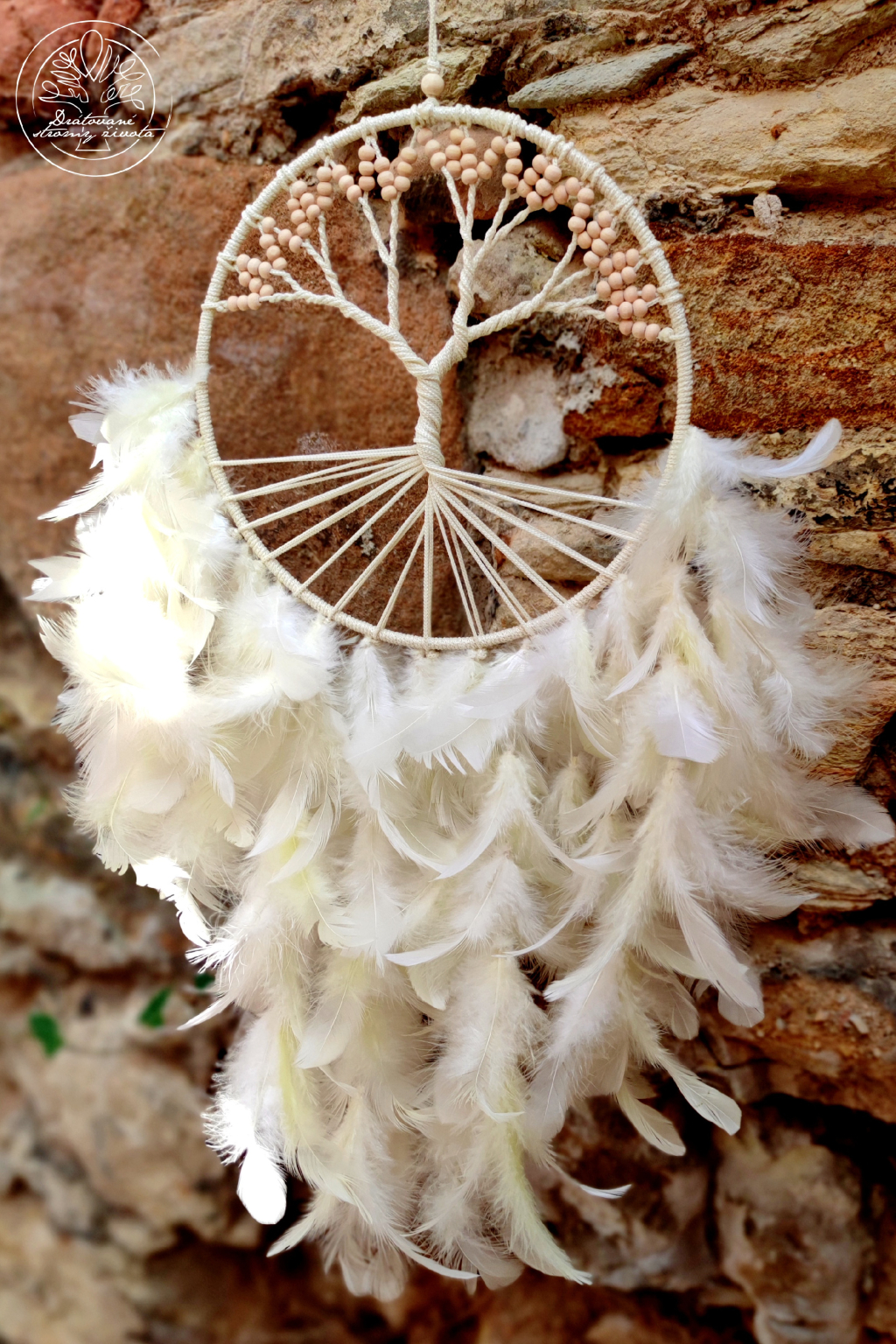 Ručně vyrobený lapač snů se stromem života z macramé provázků. V koncích větví jsou napletené dřevěné korálky. Unikátní a překrásný je tento strom života.