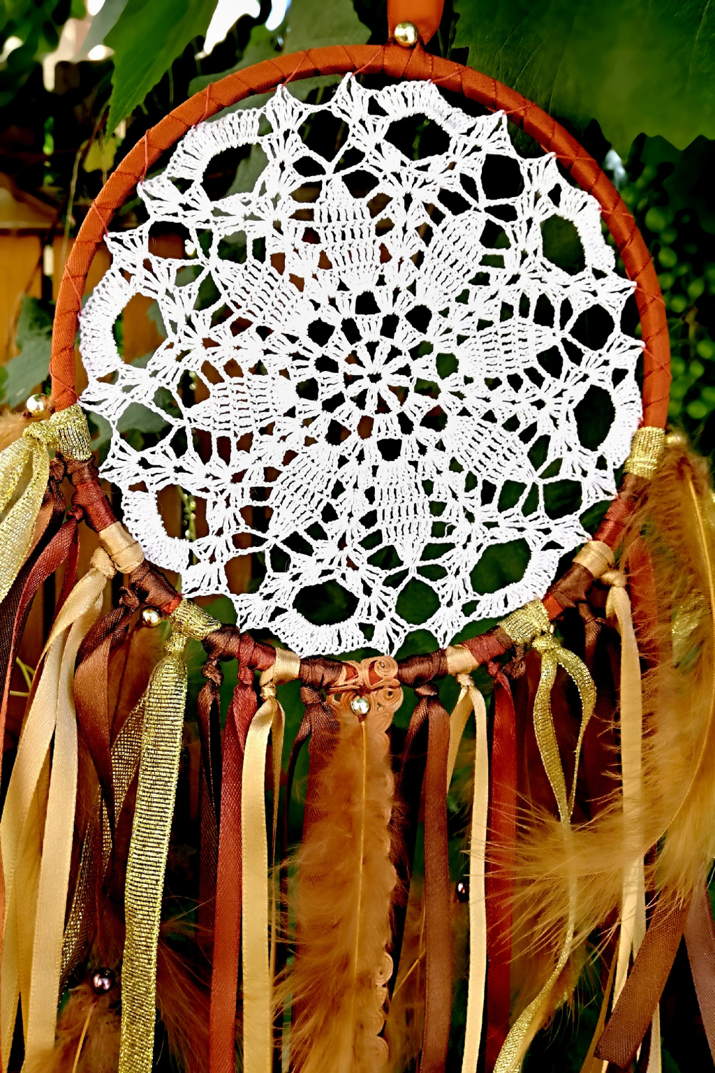 Ručně vyrobený háčkovaný lapač snů s krajkami, stužkami, korálky a jemnými peříčky.