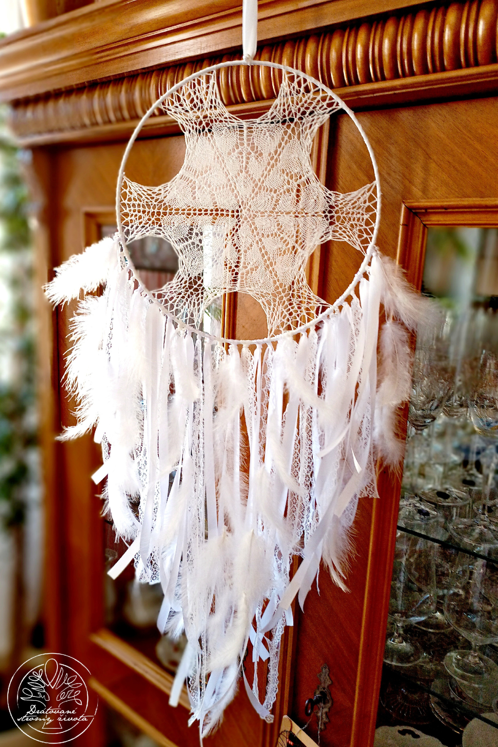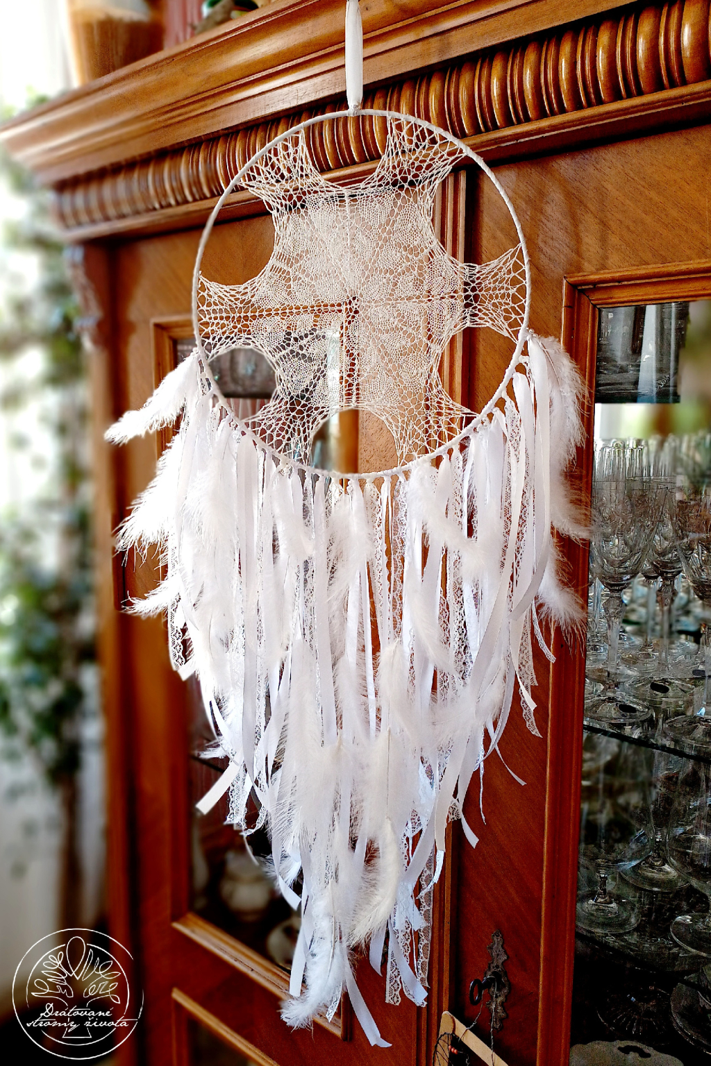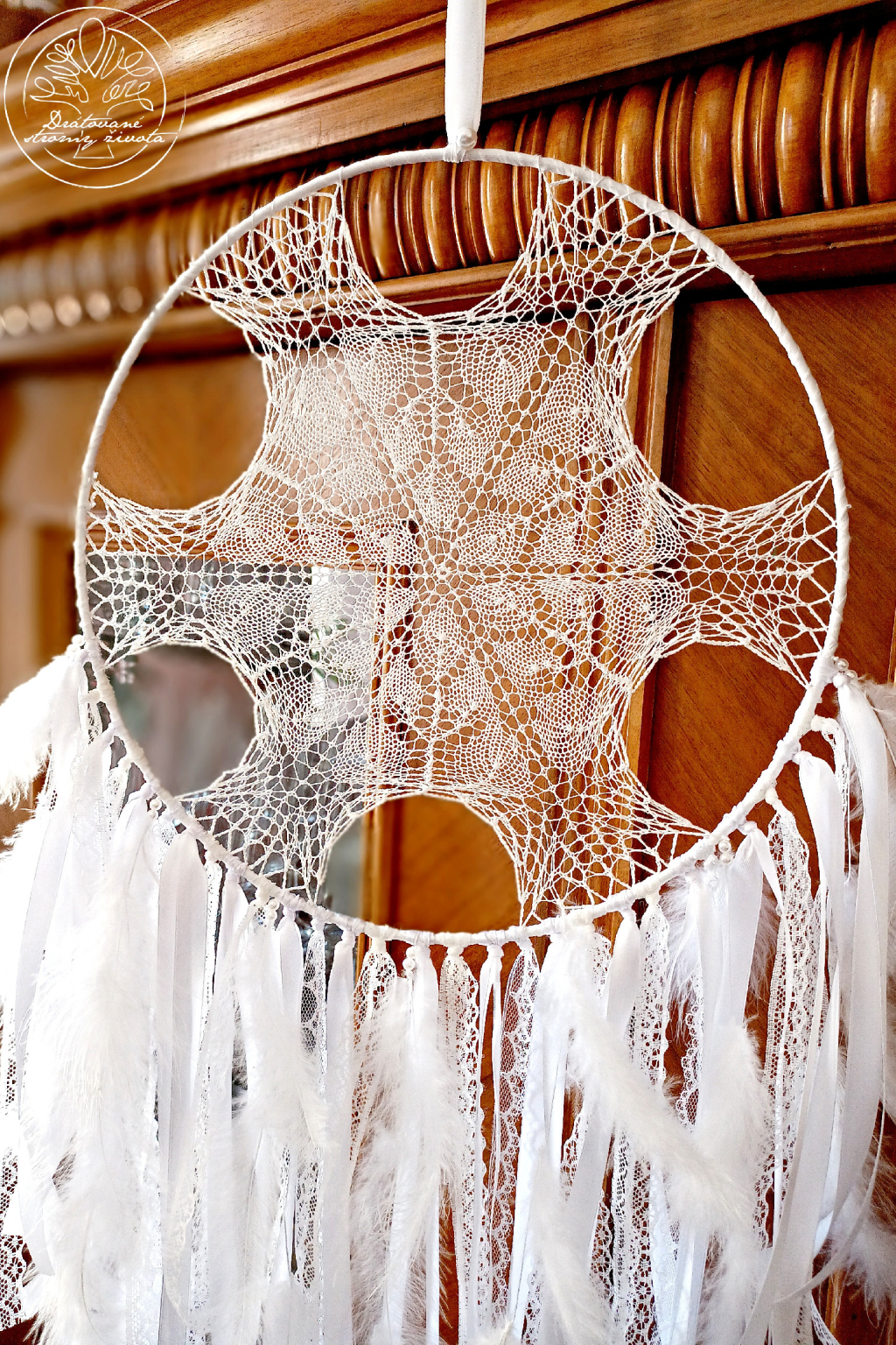 Ručně vyrobený háčkovaný lapač snů s krajkami, stužkami, korálky a jemnými peříčky.