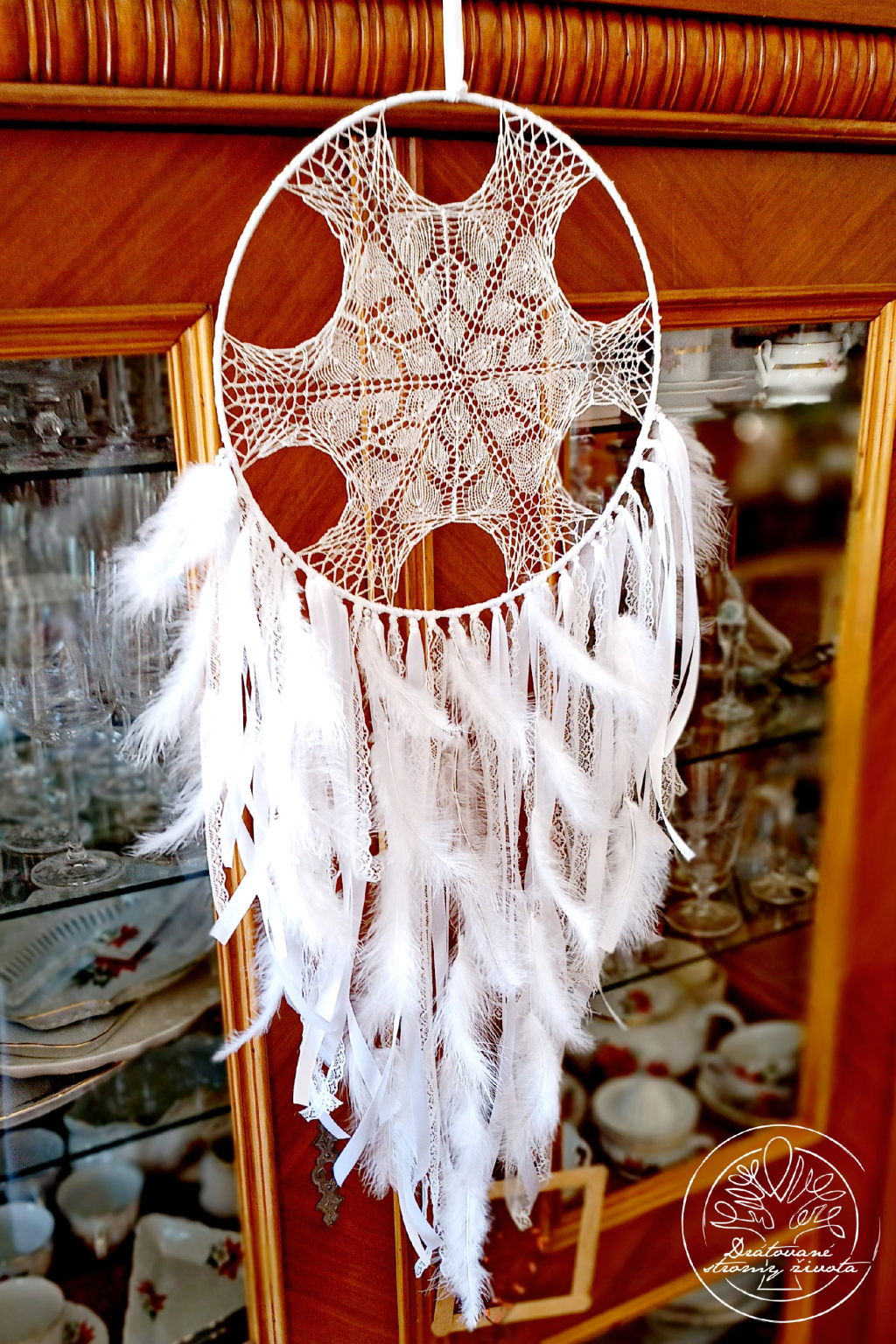 Střed lapače je ručně intuitivně uháčkovány trpělivou paní, která se háčkování věnuje celý svůj dlouhý života a každý takový střed lapače je jiný a nikdy není stejný, jako předchozí, protože je vyrábí intuitivně bez předloh a návrhů.