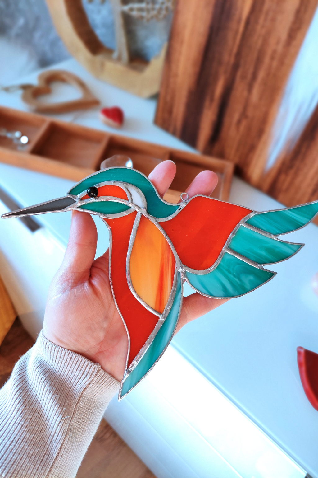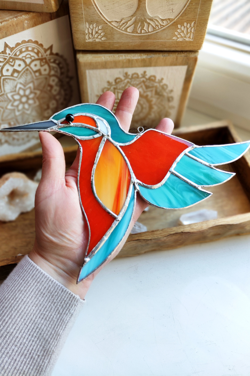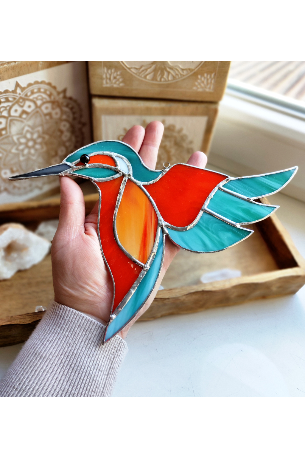 Tento ručně vyráběný Tiffany ledňáček o velikosti 20 cm je symbolem radosti, nových začátků a vnitřního světla. Kombinace tyrkysových, oranžových a červených tónů působí živě, harmonicky a přináší do prostoru energii, která rozjasní každý den.