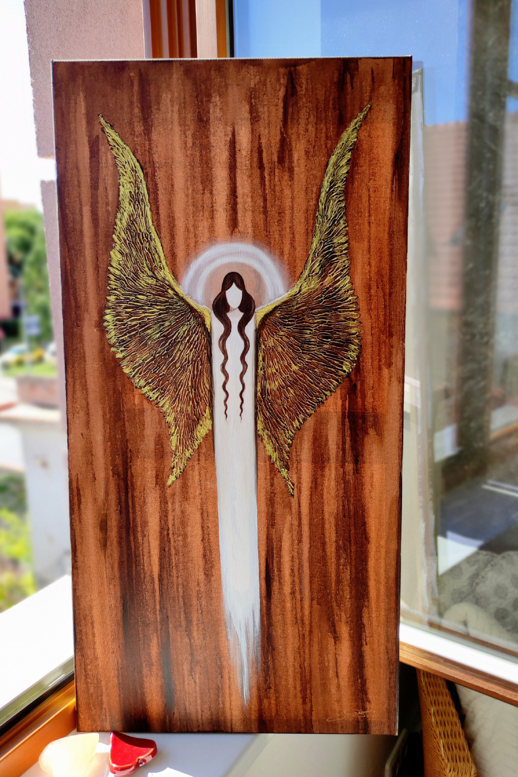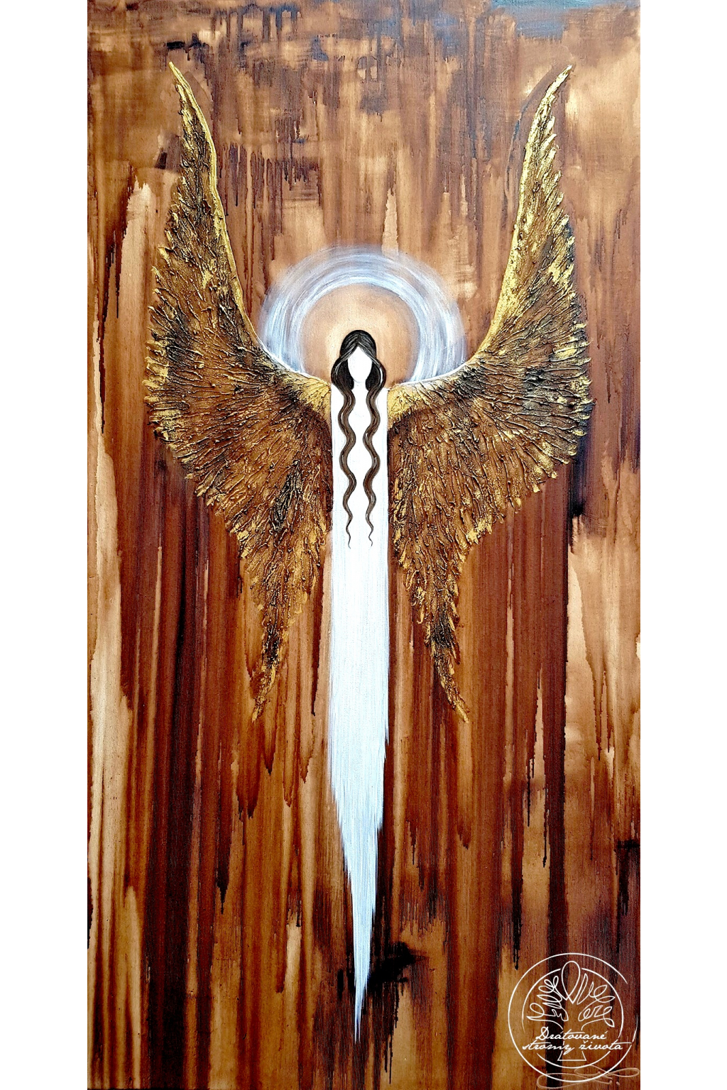 Obraz je vyveden v krásné hřejivé zlato - hnědé barvě, nahoře nad andílkem a po obrubě obrazu je plátno reliéfní taktéž zlaté.