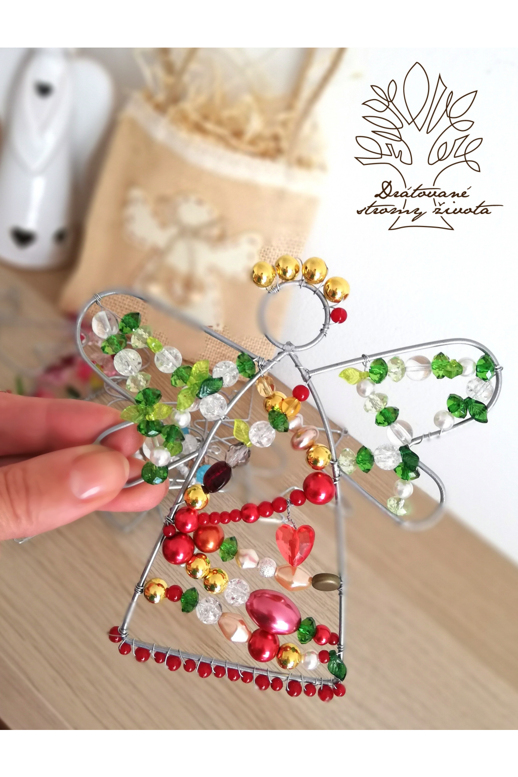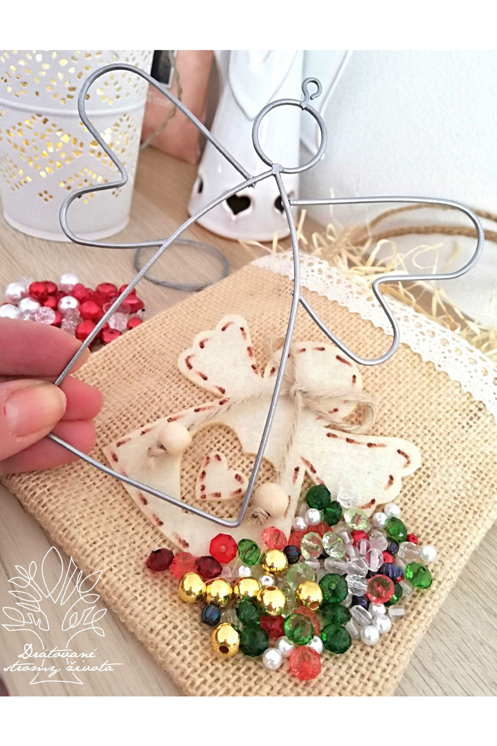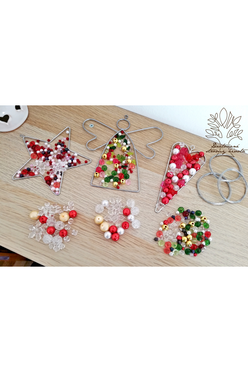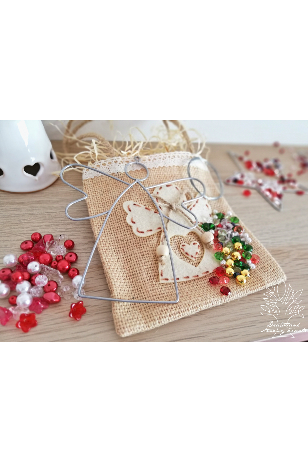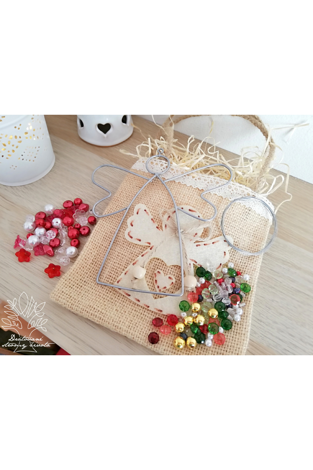 Sada zahrnuje - drátovaného andílka cca 12cm- dostatečné množství korálku k obdrátkovaní celého andílka - je jich opravdu hodně, drátek na celé obdrátování, krásnou Jutovou taštičku s vánočním motivem /dle skladových zásob/ vyplněnou dřevitou vlnou.