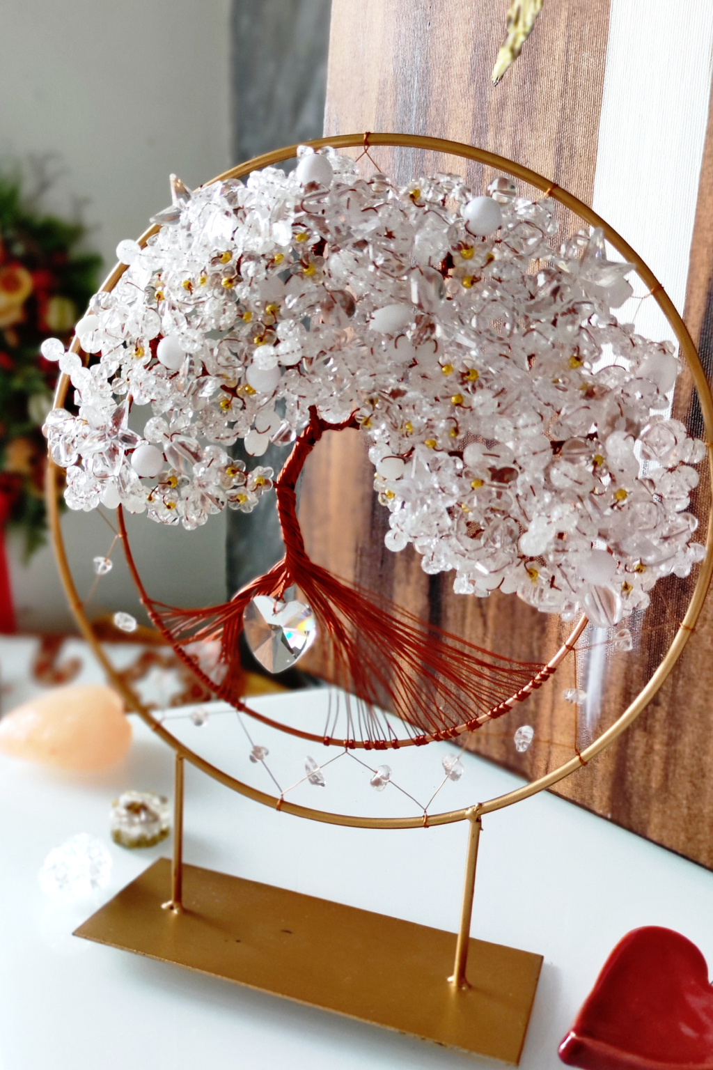 Drátovaný strom vyroben z křišťálu a pravých říčních perel. Skleněných lístků, kytiček a korálků a z průhledných transparentních čirých komponentů.