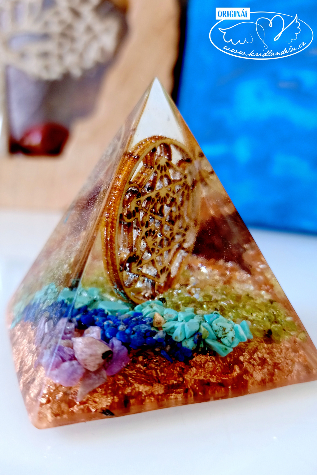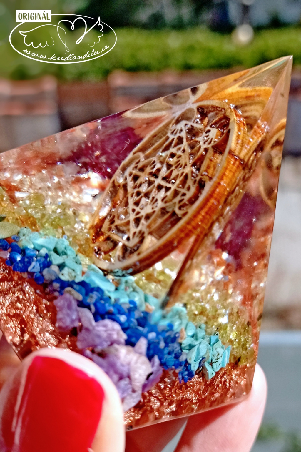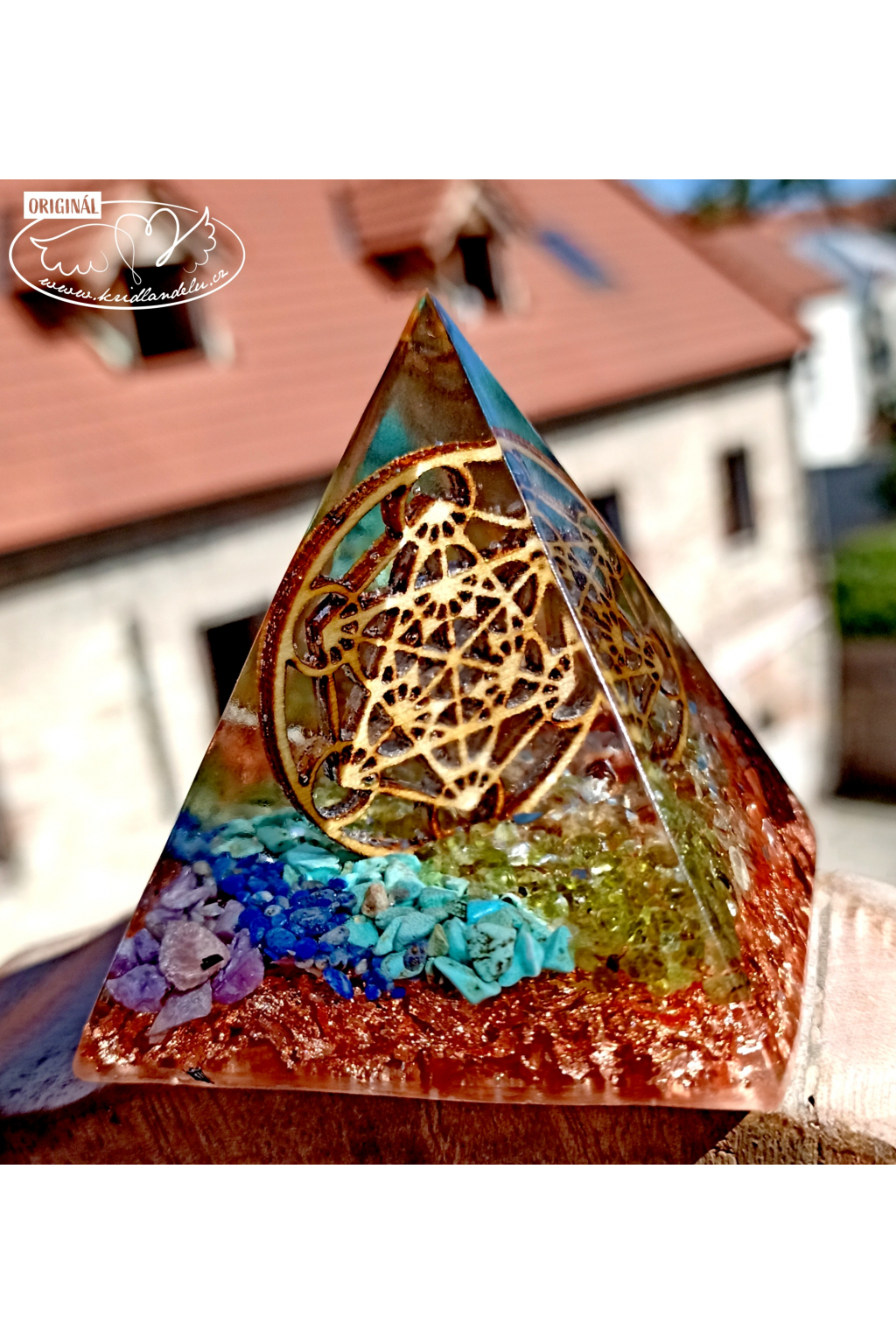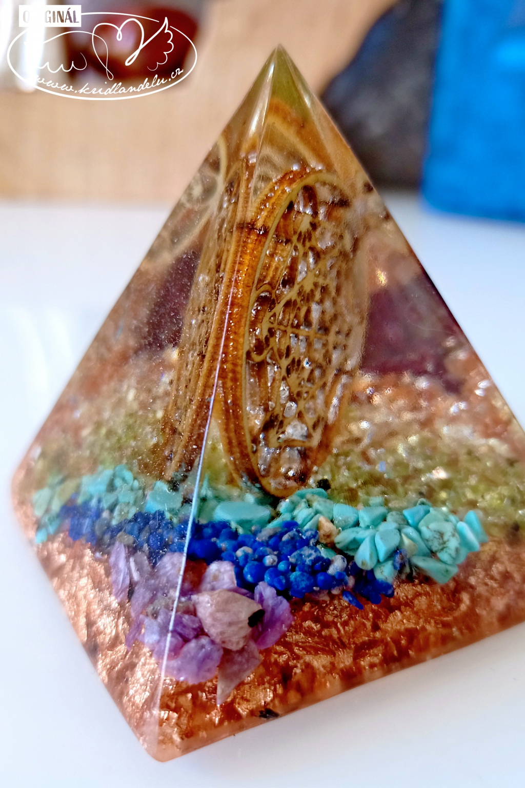 Orgonitová pyramida s polodrahokamy v barvě Čaker s posvátným symbolem Archanděla Metatrona.