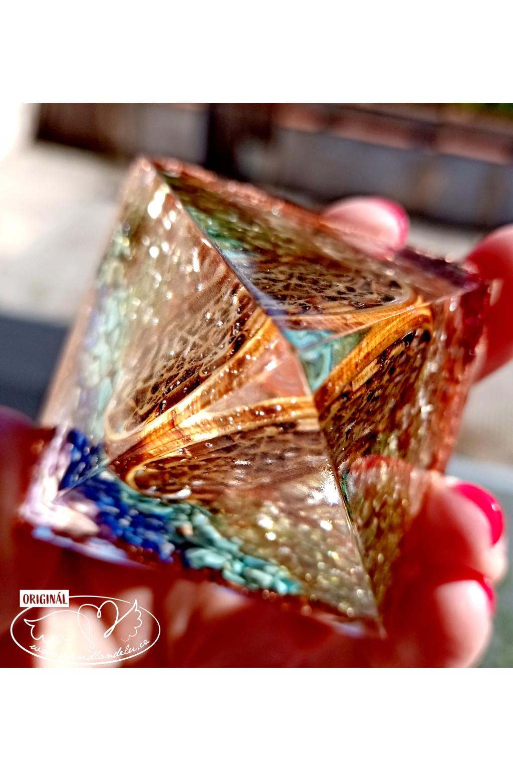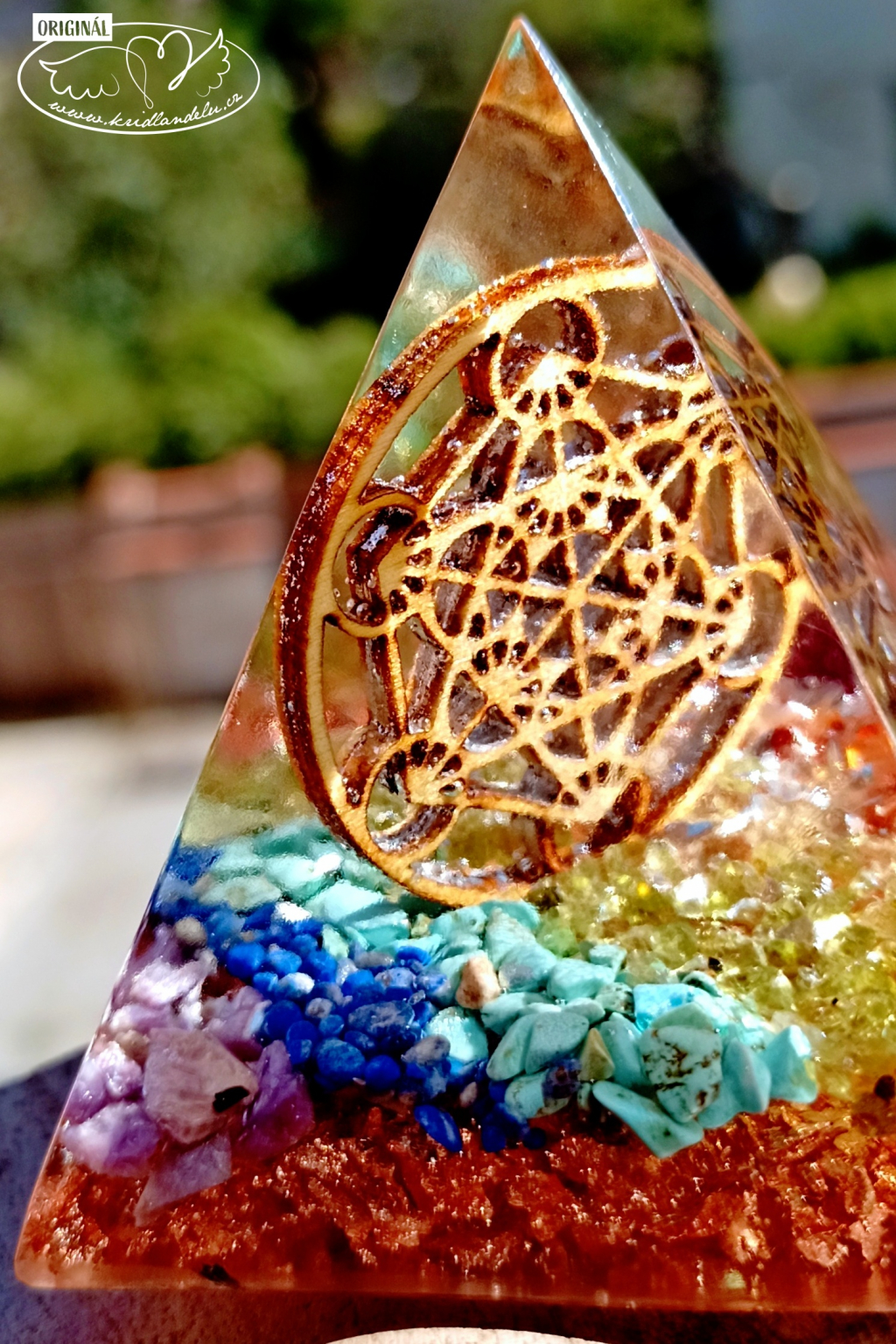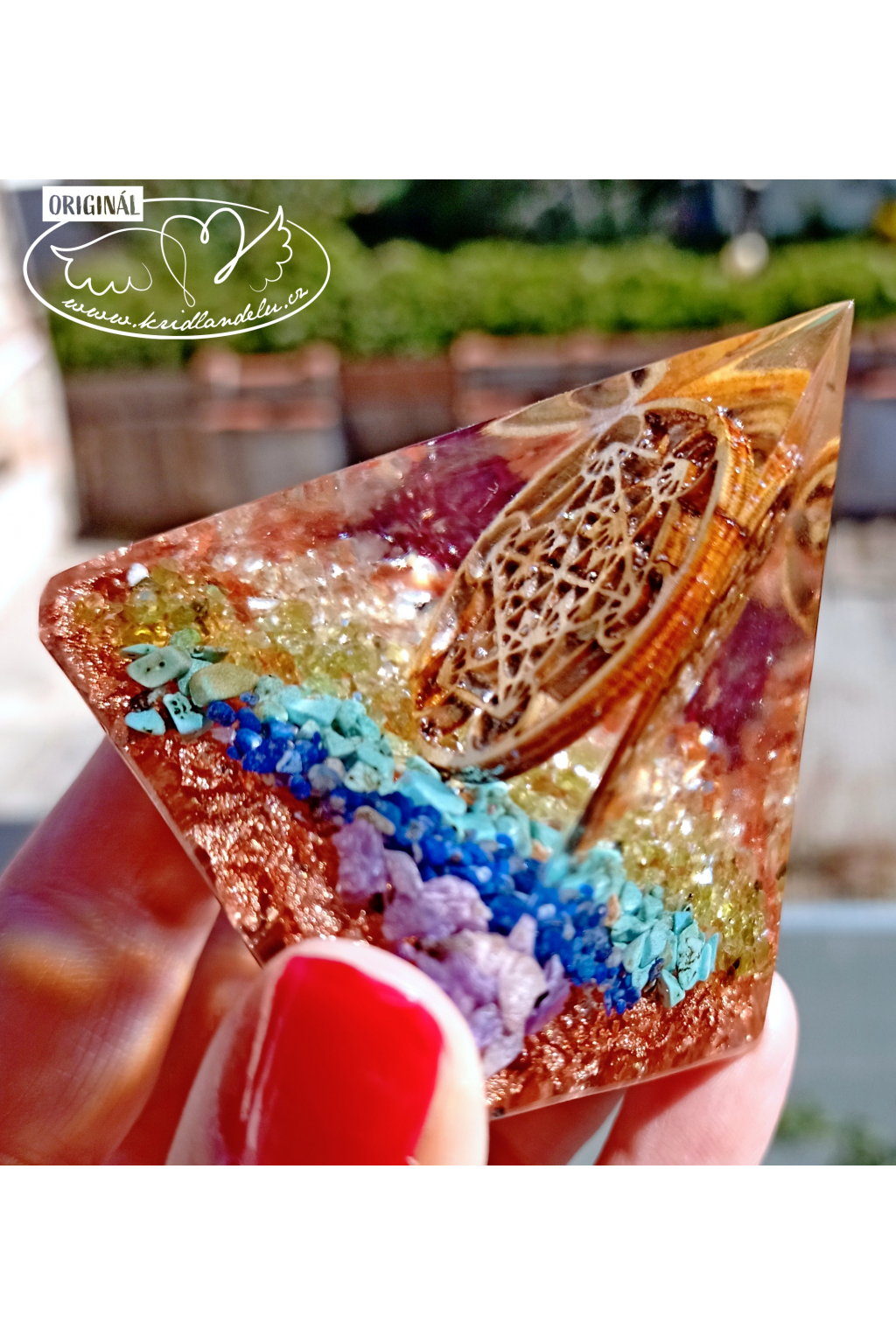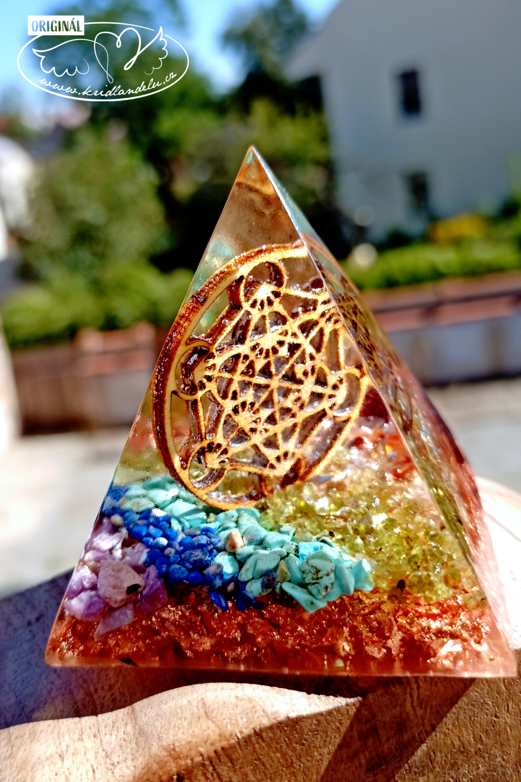 Orgonitová pyramida s polodrahokamy v barvě Čaker s posvátným symbolem Archanděla Metatrona.