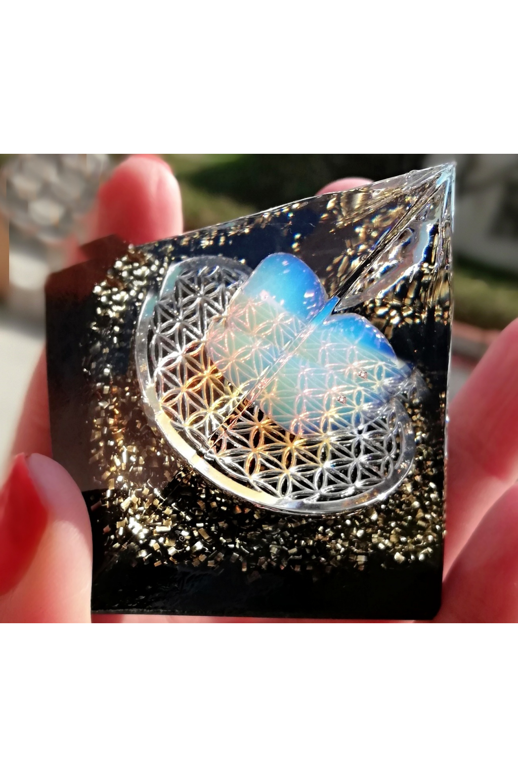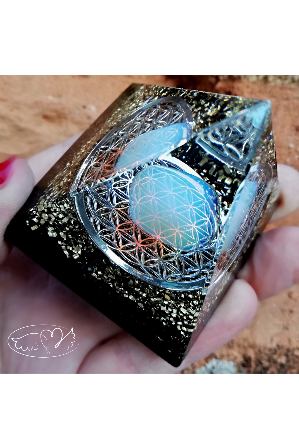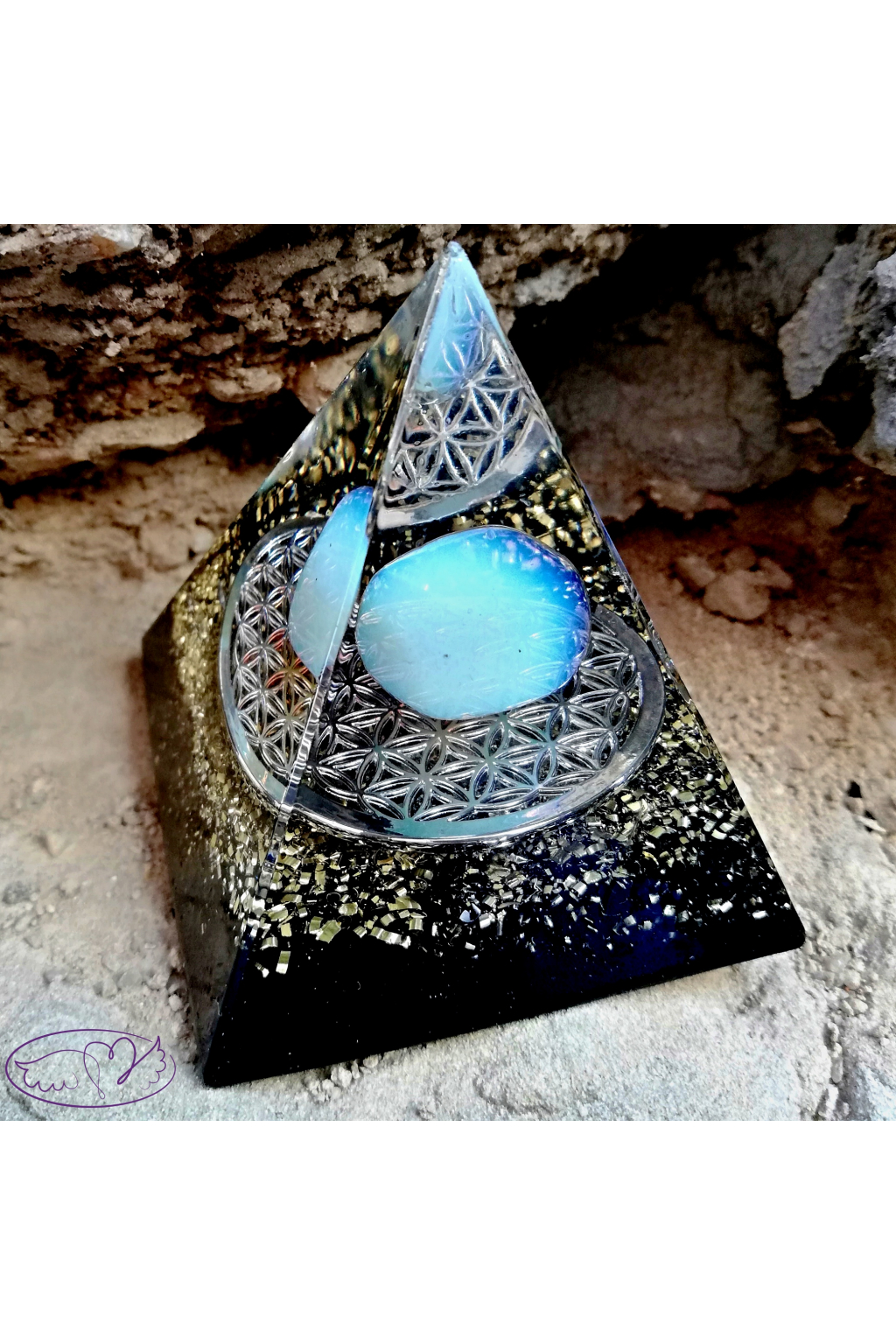 Orgonitová pyramida tak magická a úchvatná, že od ní nebudete moci odtrhnout oči - úplně vás vtáhne a pohltí svou ochrannou silou a mocí. Kombinace opalitu - syntetického měsíčního kamene, kovového květu života a šungitu je tajemná, na první pohled tmavší, ale když se zadíváte pozorněji, uvidíte úchvatnou duhu a odlesky měsíčního kamene a pocítíte silnou ochrannou energii, kterou pyramida vyzařuje