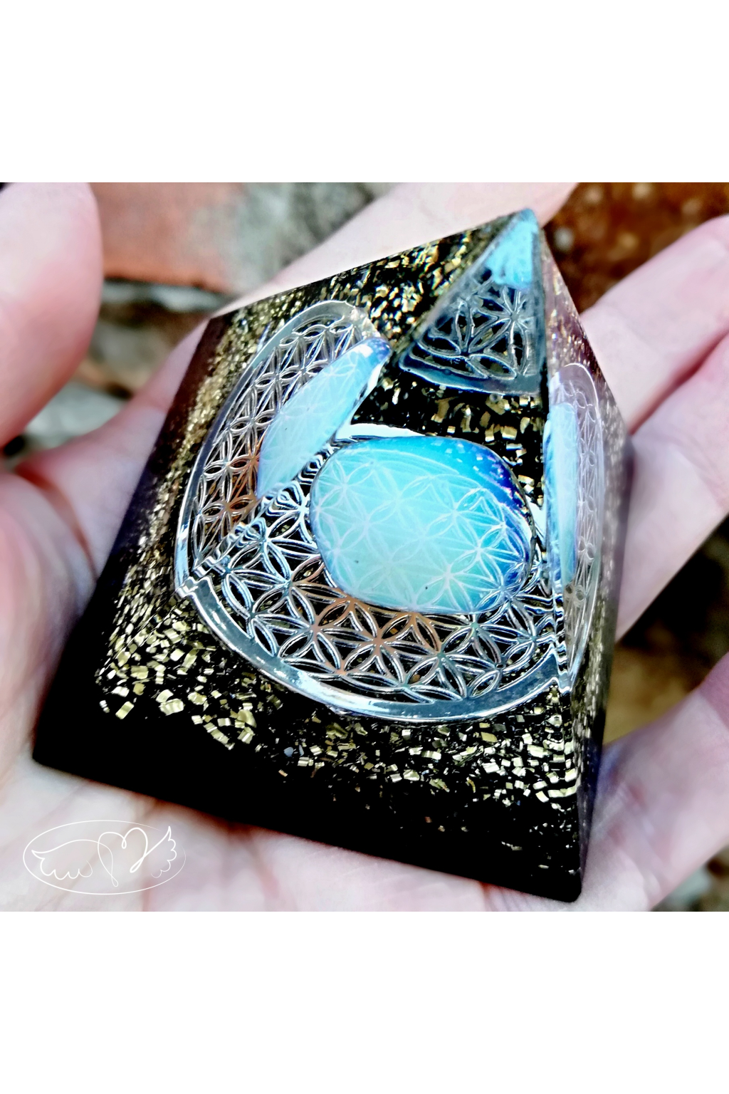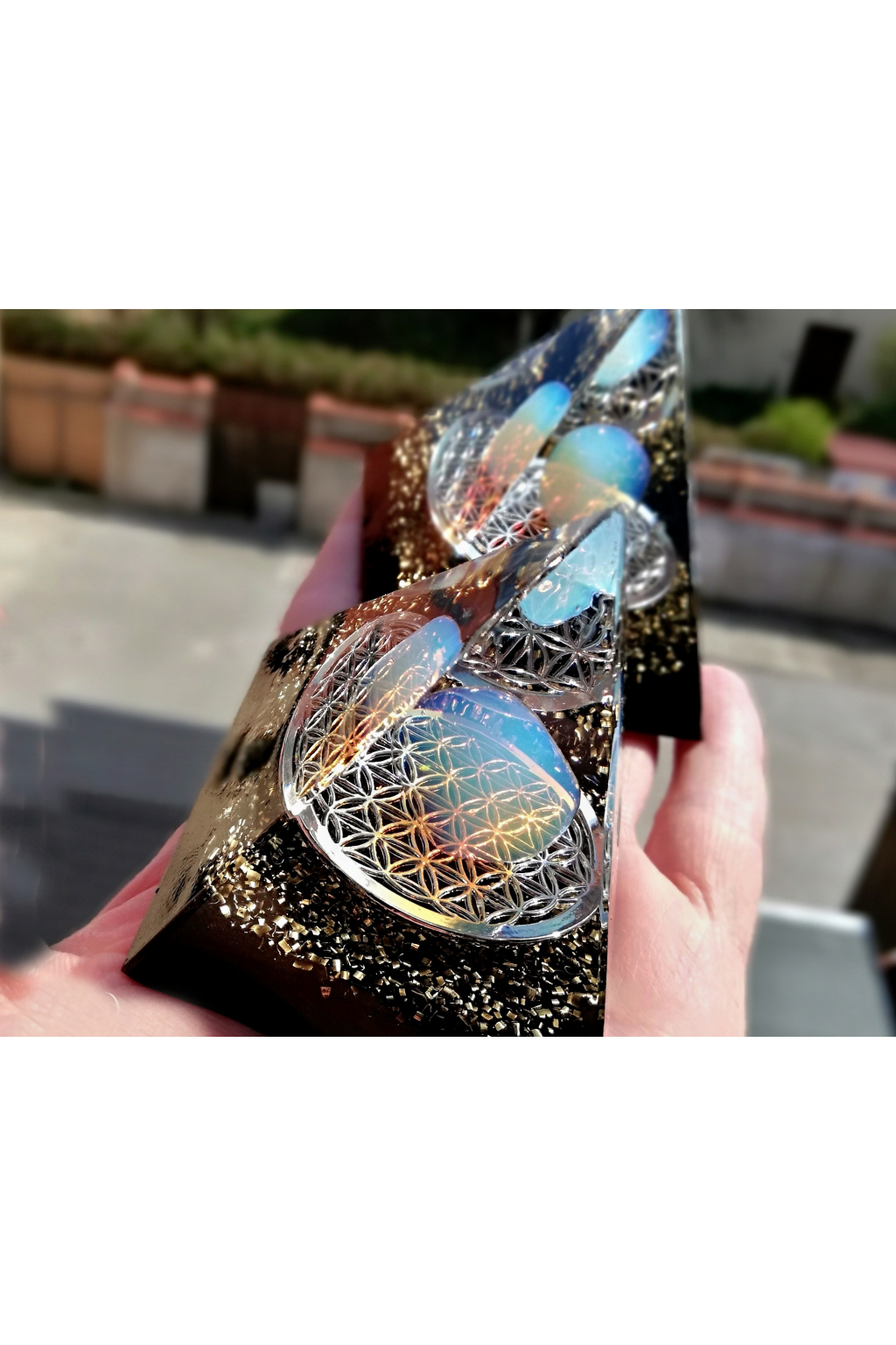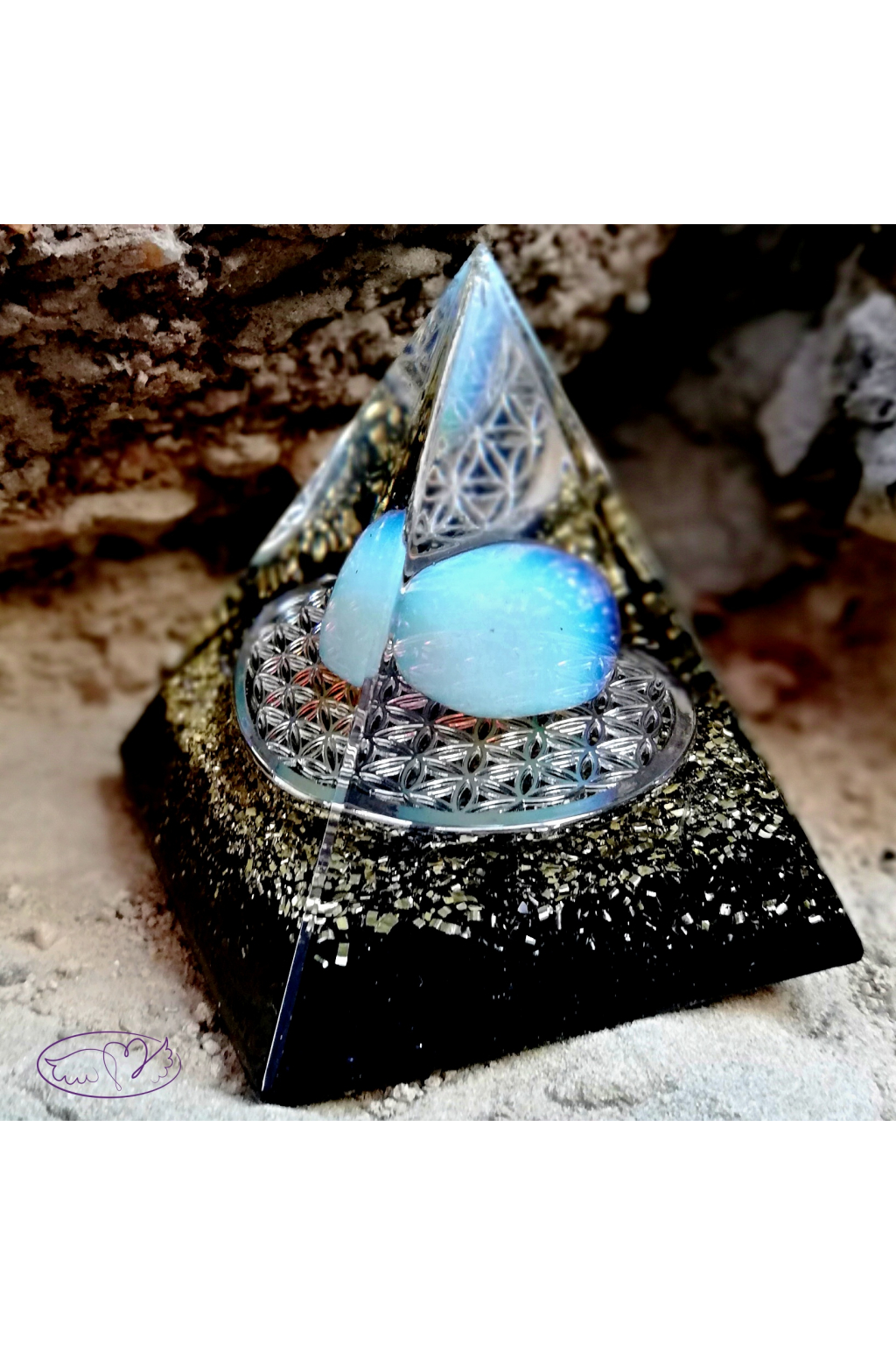 Orgonitová pyramida tak magická a úchvatná, že od ní nebudete moci odtrhnout oči - úplně vás vtáhne a pohltí svou ochrannou silou a mocí. Kombinace opalitu - syntetického měsíčního kamene, kovového květu života a šungitu je tajemná, na první pohled tmavší, ale když se zadíváte pozorněji, uvidíte úchvatnou duhu a odlesky měsíčního kamene a pocítíte silnou ochrannou energii, kterou pyramida vyzařuje