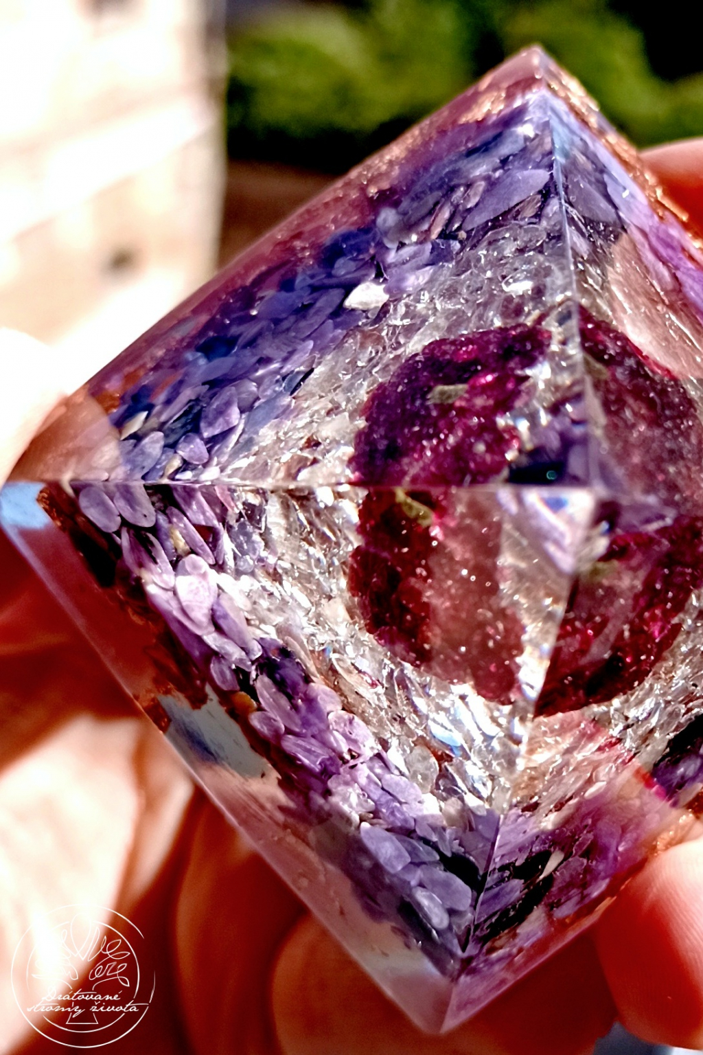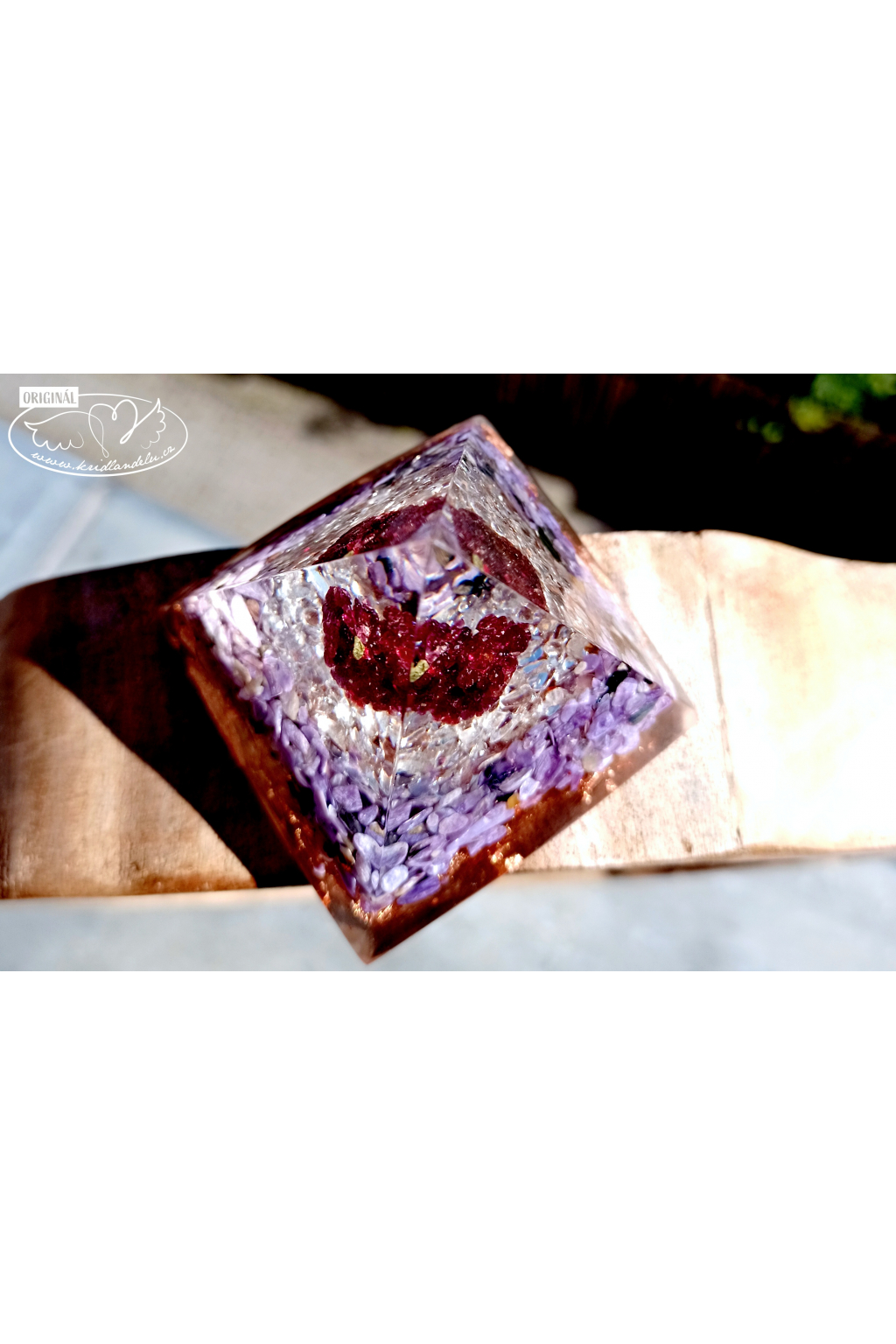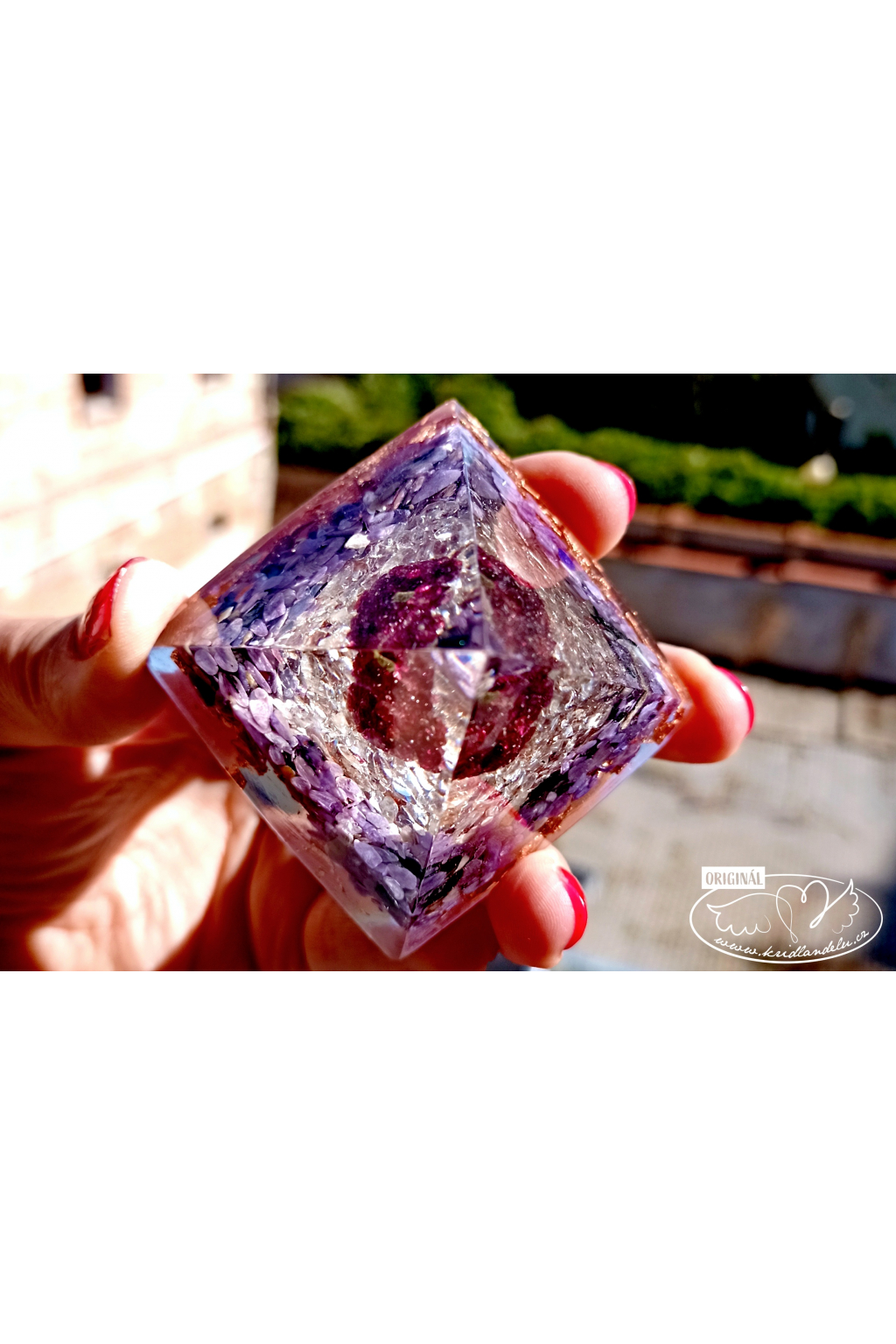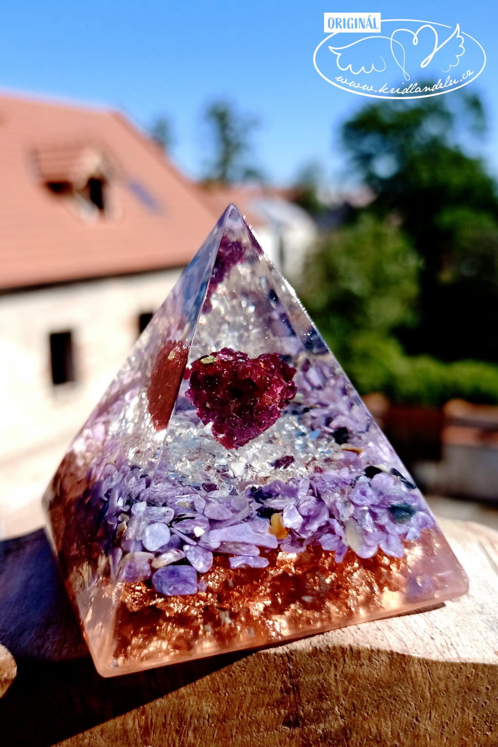 Orgonitová pyramida se srdíčkem z kousků Granátu ve svém středu. Granát je kamenem se silnou schopností dodávat energii. Přispívá k nabrání nových sil a k jejich obnově. Pročišťuje čakry a dodává jim novou energii, kterou oživuje, čistí a udržuje v rovnováze.