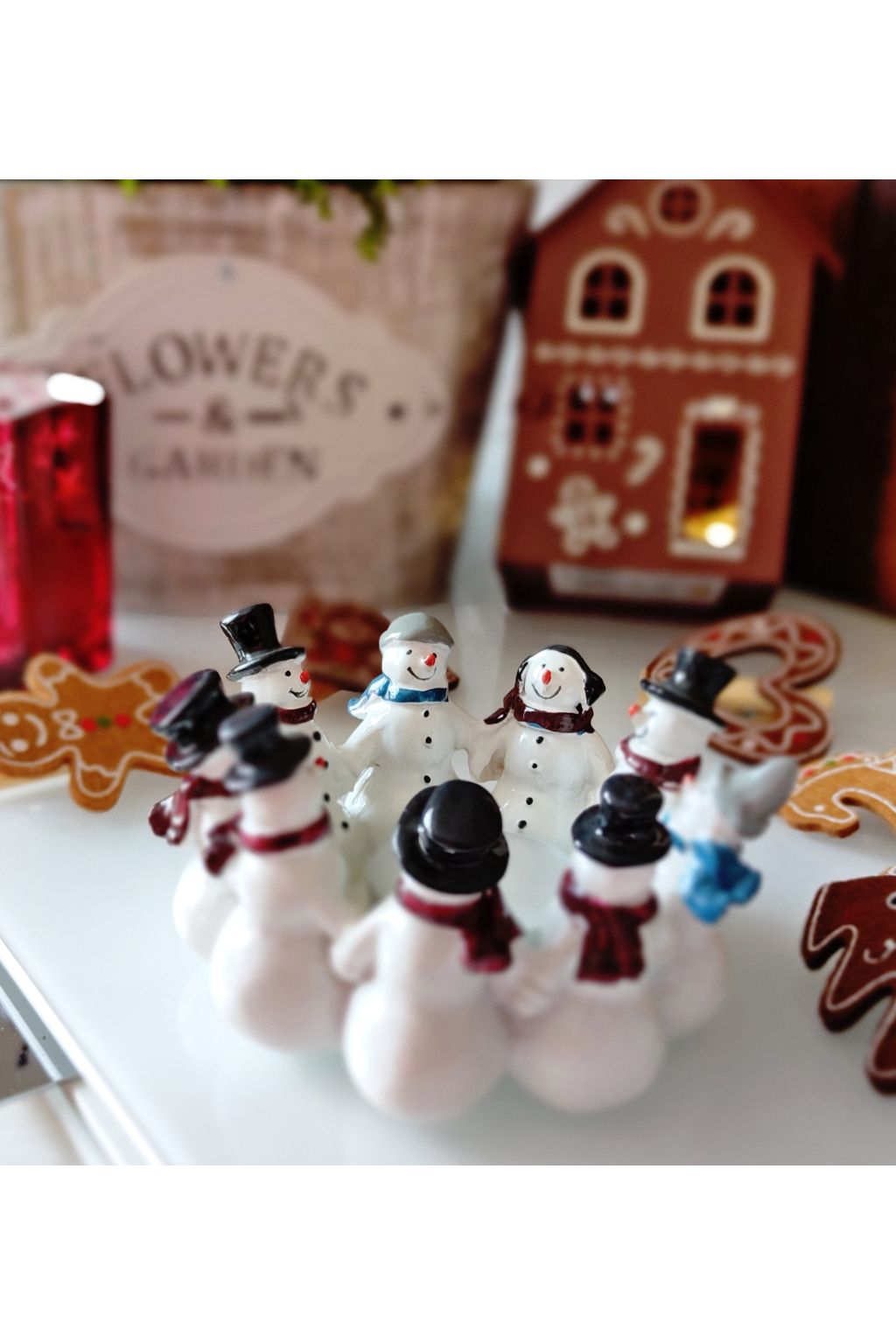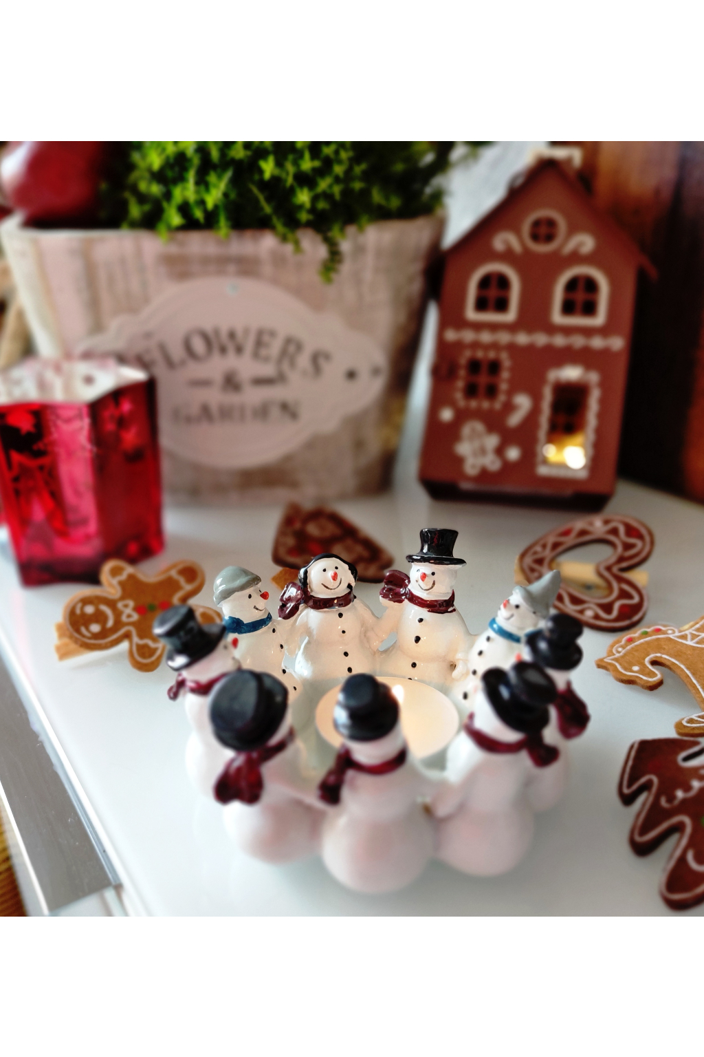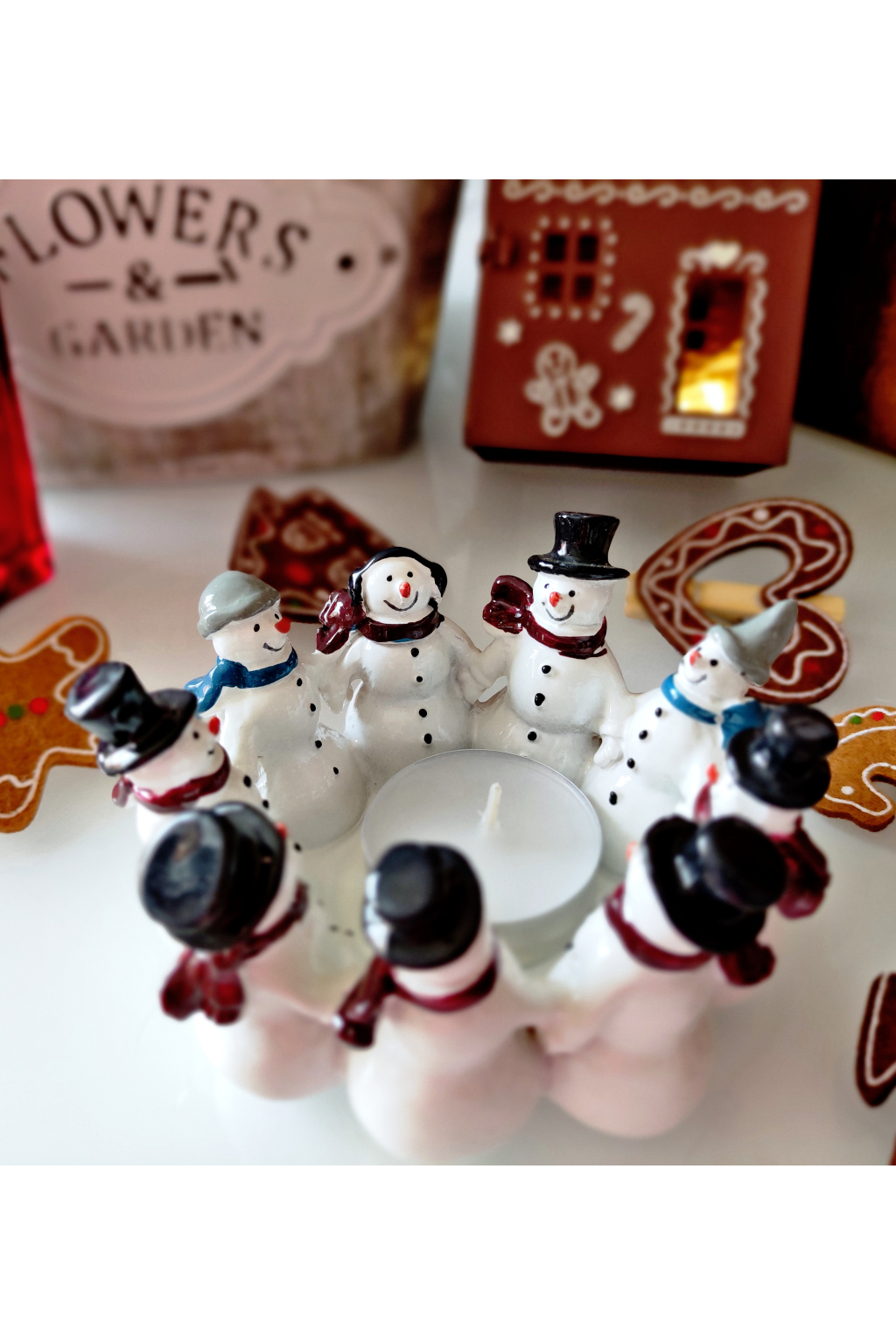 Sněhuláčci držící se za ruce symbolizují soudržnost, přátelství a radost ze společně prožitých chvil. Uprostřed kruhu se rozzáří plamínek svíčky, který v kombinaci s bílou glazurou a zimními barvami navodí atmosféru tepla a klidu.